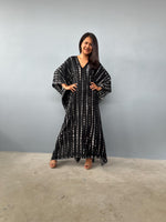 Meet the color hero of your wardrobe. The Mala Tie-Dye Kaftan in black with gray tie dye showcases vivid, handcrafted patterns with depth you can feel – each achieved through meticulous hand-tied, hand-dyed techniques. The flowy silhouette and breathable feel make it an instant favorite for beach cover-ups, loungewear and relaxed nights out. Dress it up with statement jewelry or keep it casual with slides; either way, the Mala turns heads with movement and saturated hue. Because every piece is one of a kind, your pattern will be uniquely yours – timeless, artful, and endlessly wearable.