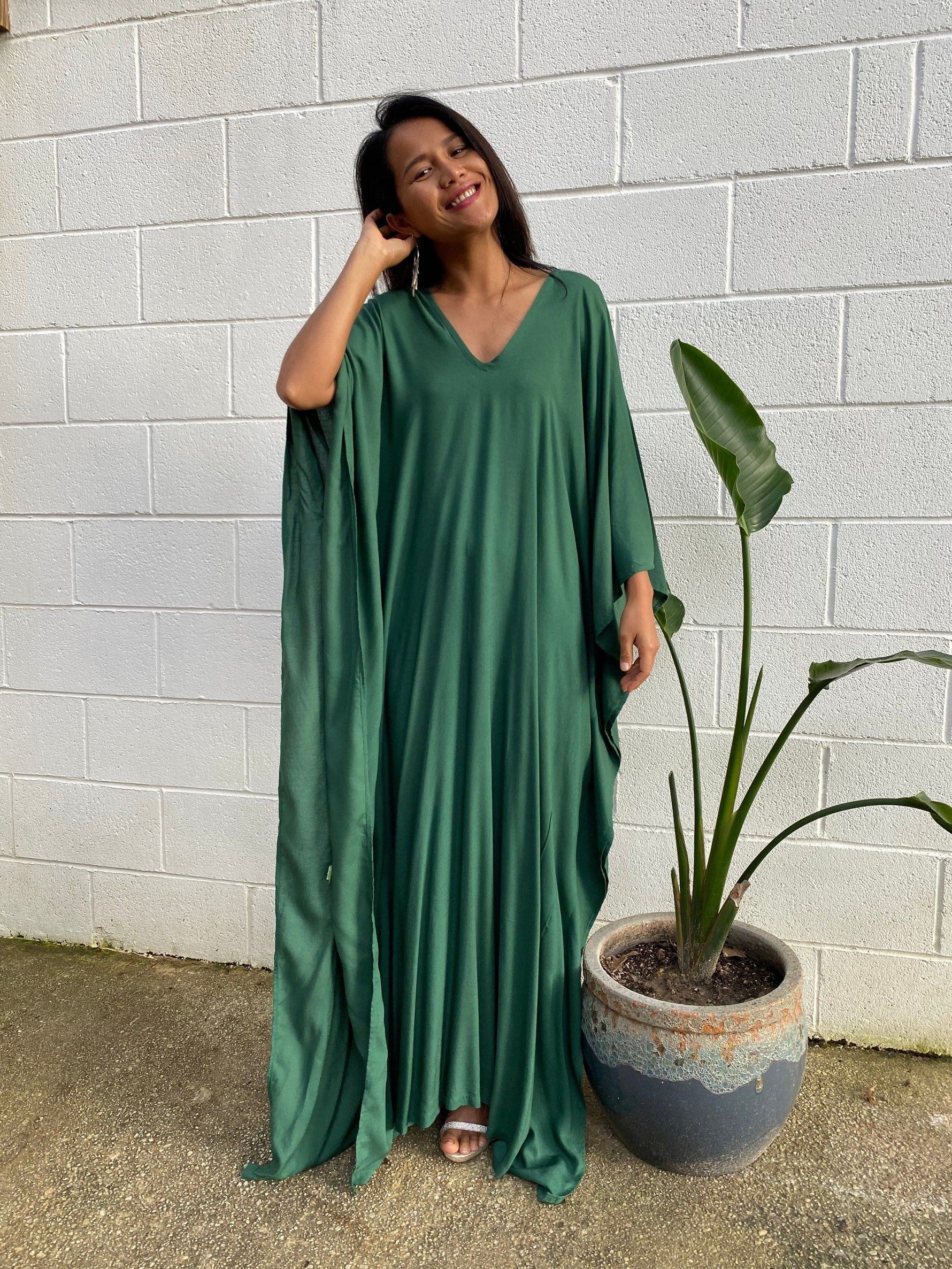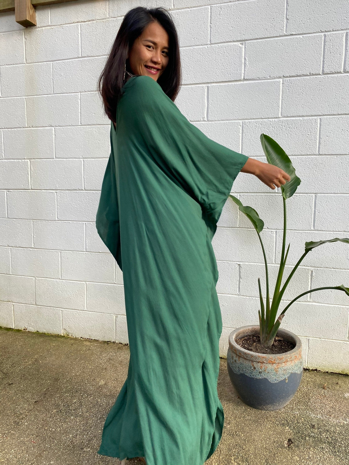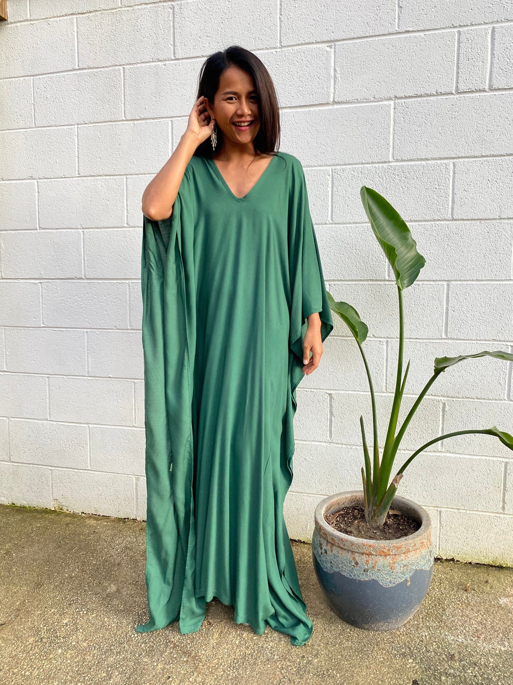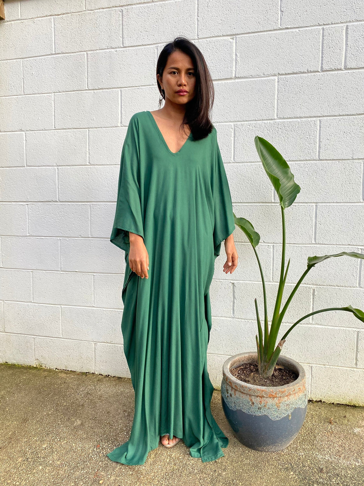 Dive into saturated color with our best-selling Mala Kaftan in jade green. Each piece carefully hand sewn and finished. The relaxed, flowy silhouette moves with you for all-day comfort – perfect as resort wear, an effortless beach cover-up, or a statement festival outfit. Lightweight fabric drapes beautifully and layers easily over swimsuits, tanks, or slip dresses. Whether you’re packing for vacation or dressing for sunset plans, this kaftan brings vibrant color, easy movement, and laid-back polish to every moment.