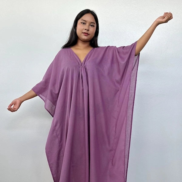 Embrace the gentle waves and sunny shores with our double gauze cotton kaftan in eggplant purple. This versatile floor-length kaftan falls gracefully just above the ankles (depending on your height), making it the perfect beach dress or cover up. Crafted from light and airy double gauze cotton, it's your essential for a night on the town, a day by the sea, or just running errands.