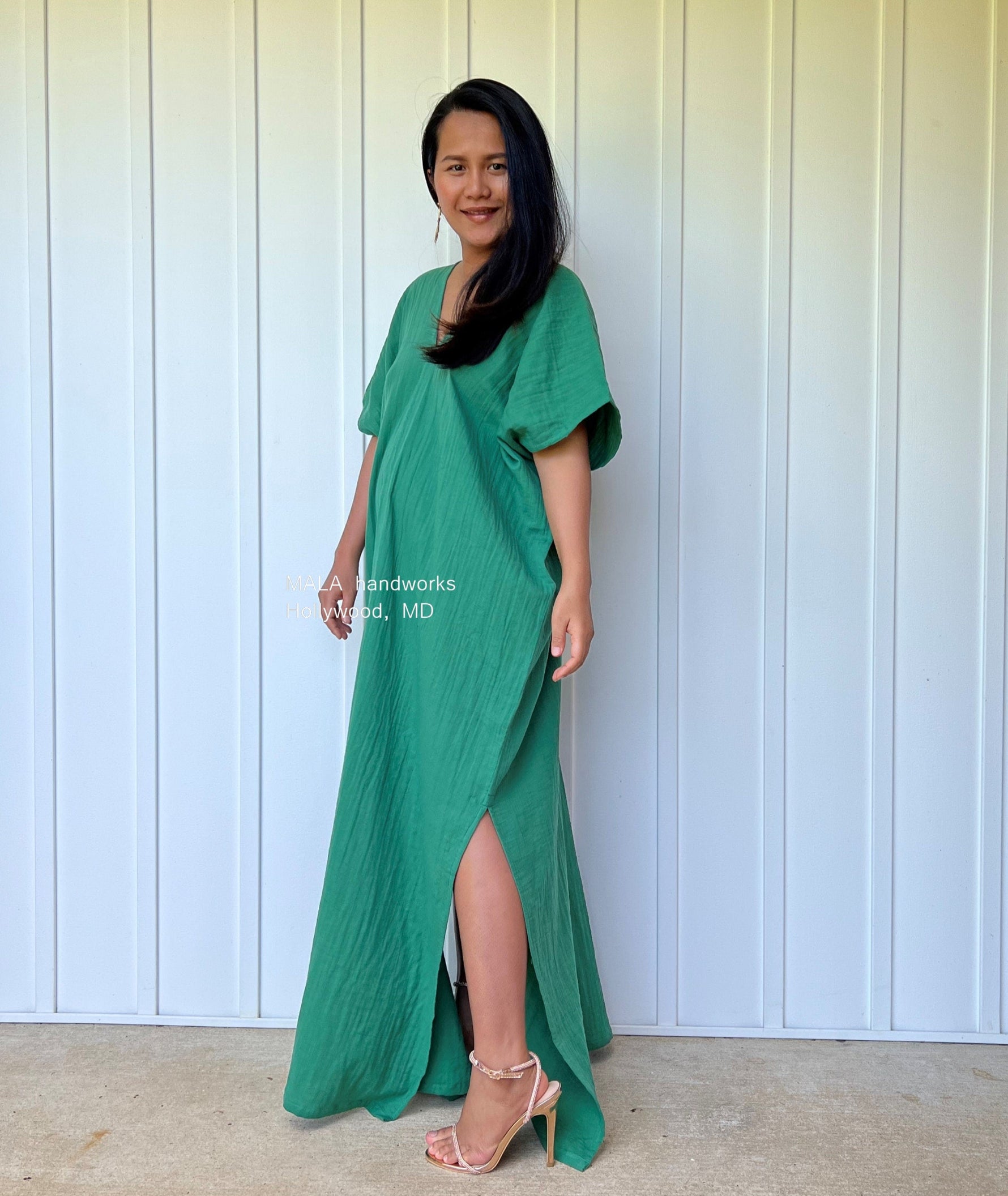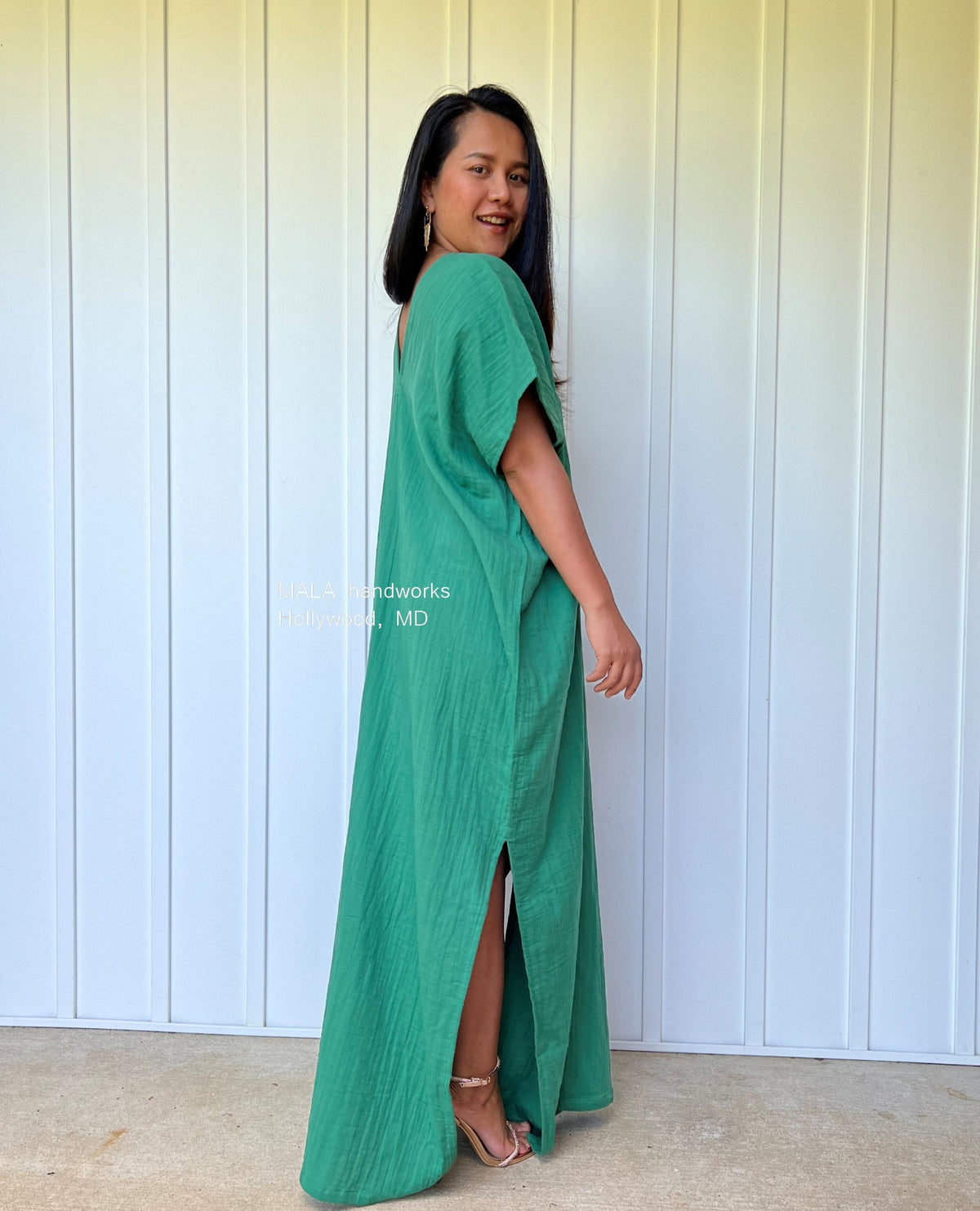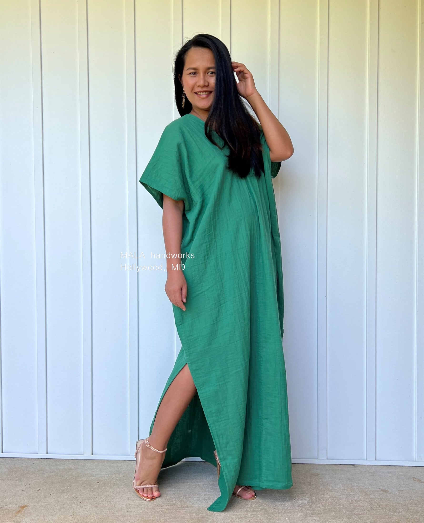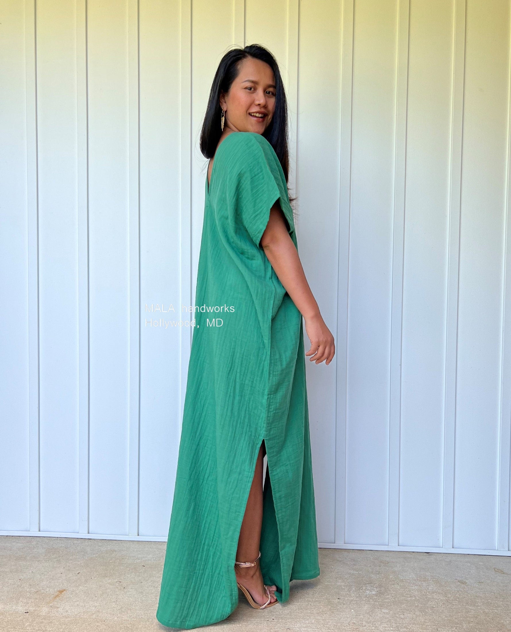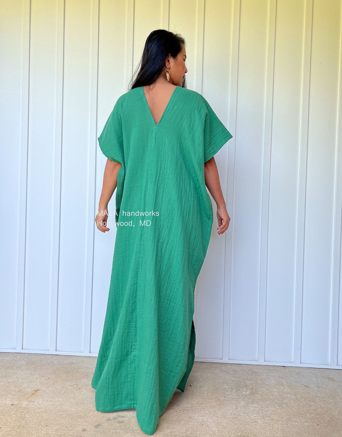 Embrace the gentle waves and sunny shores with our double gauze cotton kaftan in green. This versatileΒ floor-length kaftan falls gracefully just above the ankles (depending on your height), making it the perfect beach dress or cover up. Crafted from light and airy double gauze cotton, it's your essential for a night on the town, a day by the sea, or just running errands.