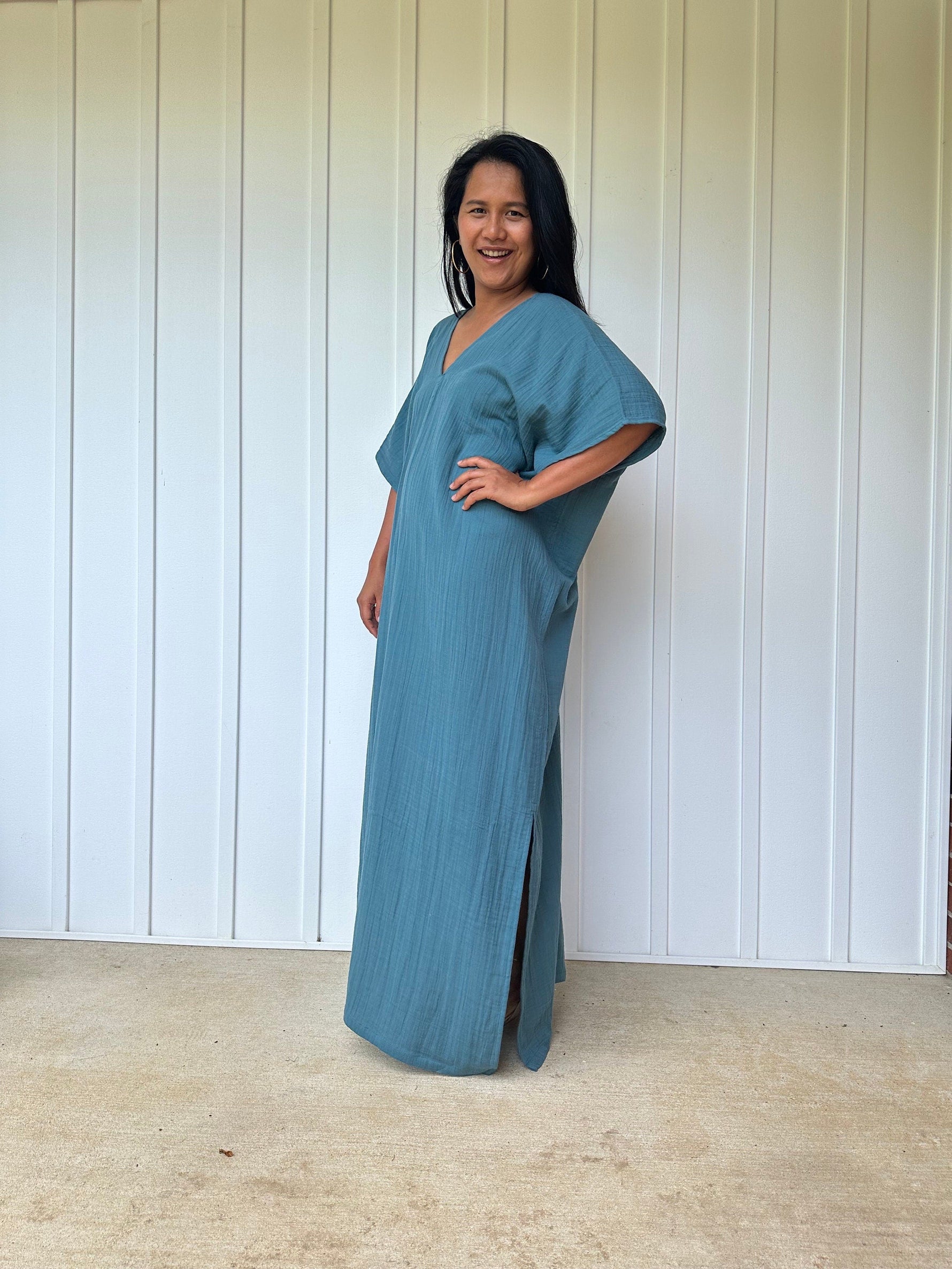 Embrace the gentle waves and sunny shores with our double gauze cotton kaftan in blue gray. This versatile floor-length kaftan falls gracefully just above the ankles (depending on your height), making it the perfect beach dress or cover up. Crafted from light and airy double gauze cotton, it's your essential for a night on the town, a day by the sea, or just running errands.