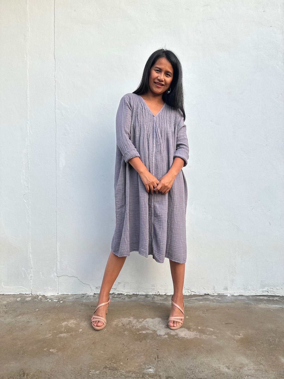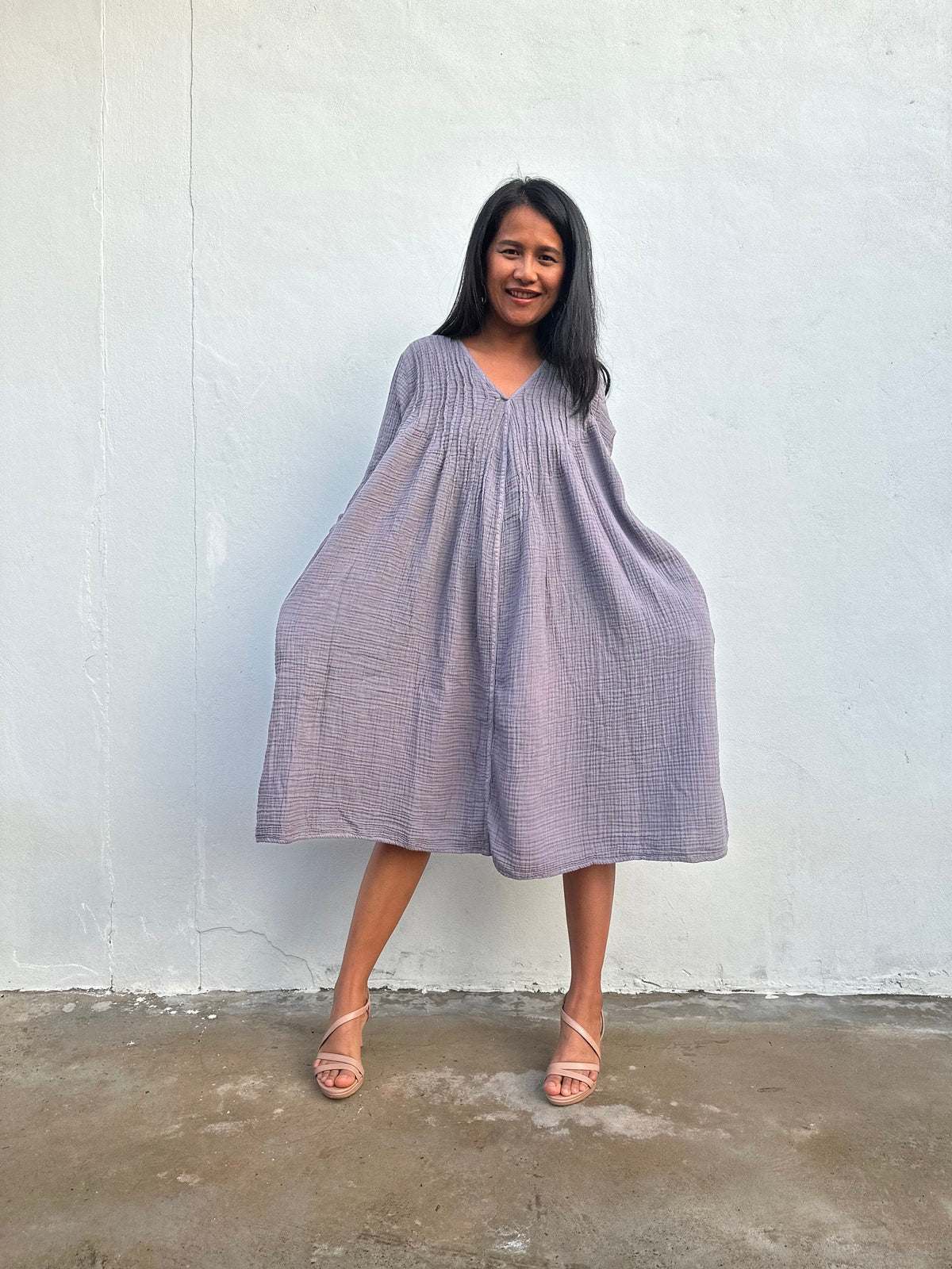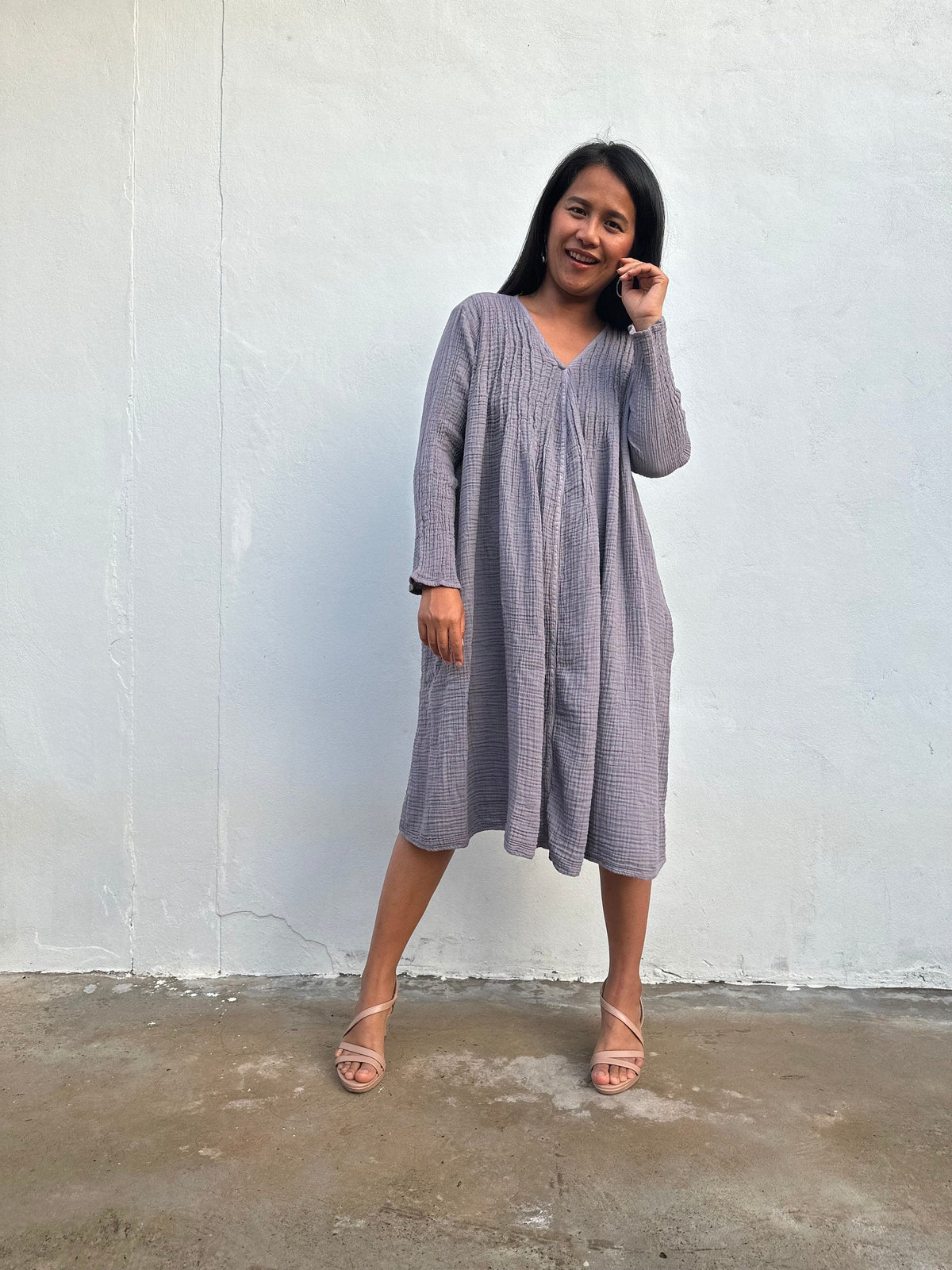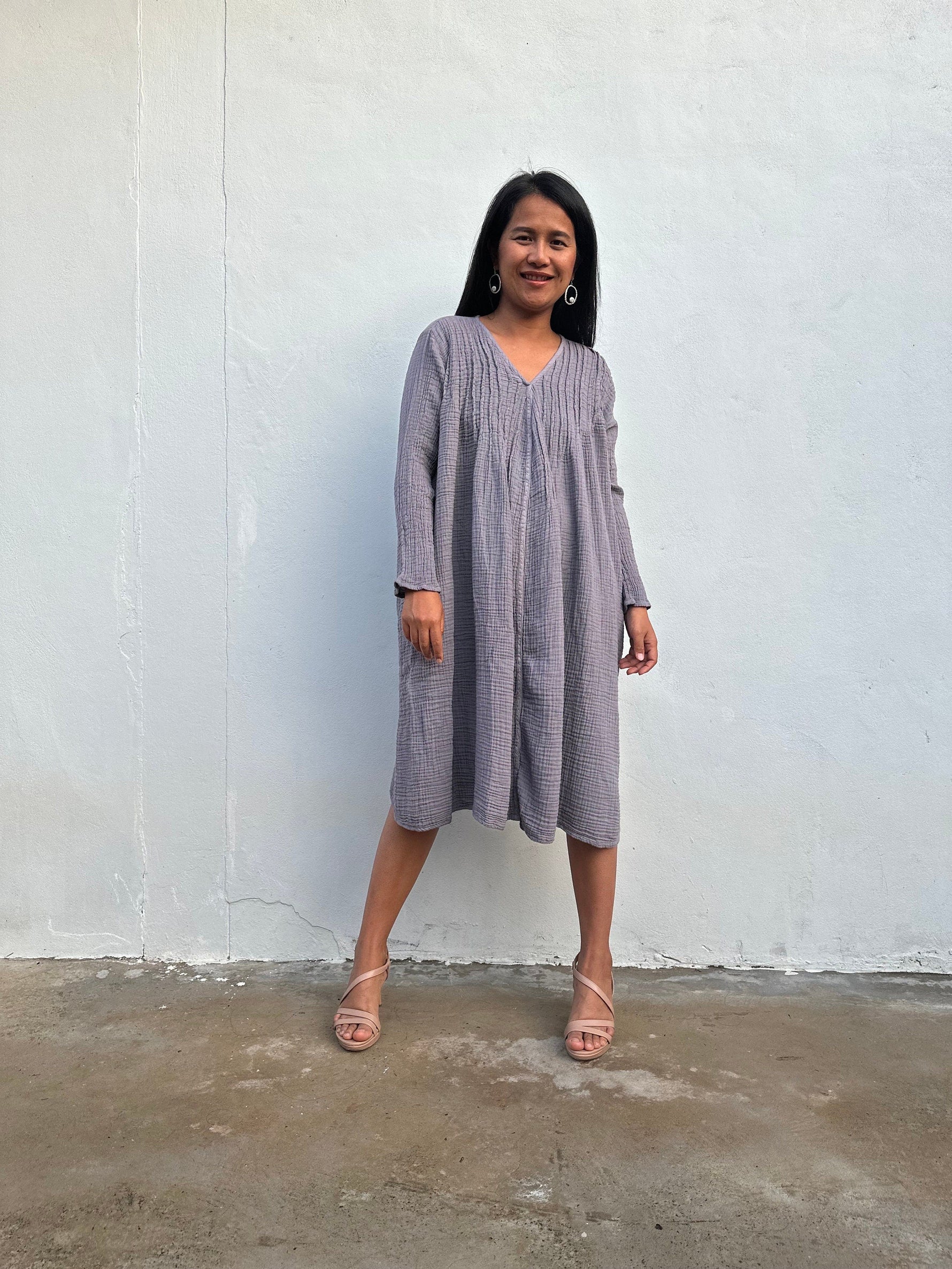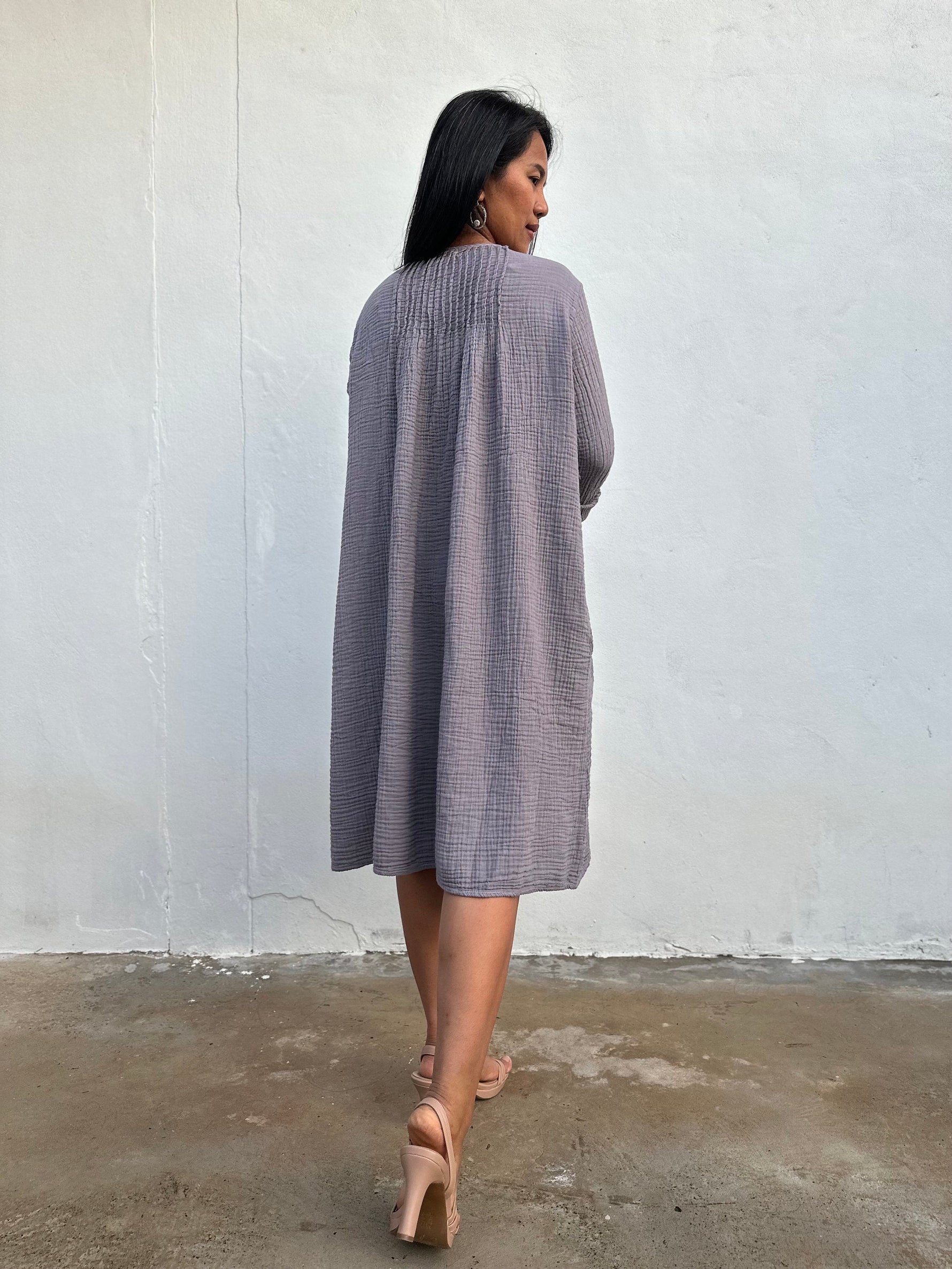 Soft, breathable, and made to move with you - meet your new favorite wardrobe staple. The Bree Everyday Gauze Dress is crafted from 100% double gauze cotton, giving it that breezy, airy feel we all love. With a relaxed silhouette, long sleeves, and functional side pockets, itβs perfect for layering or lounging all year round.