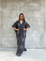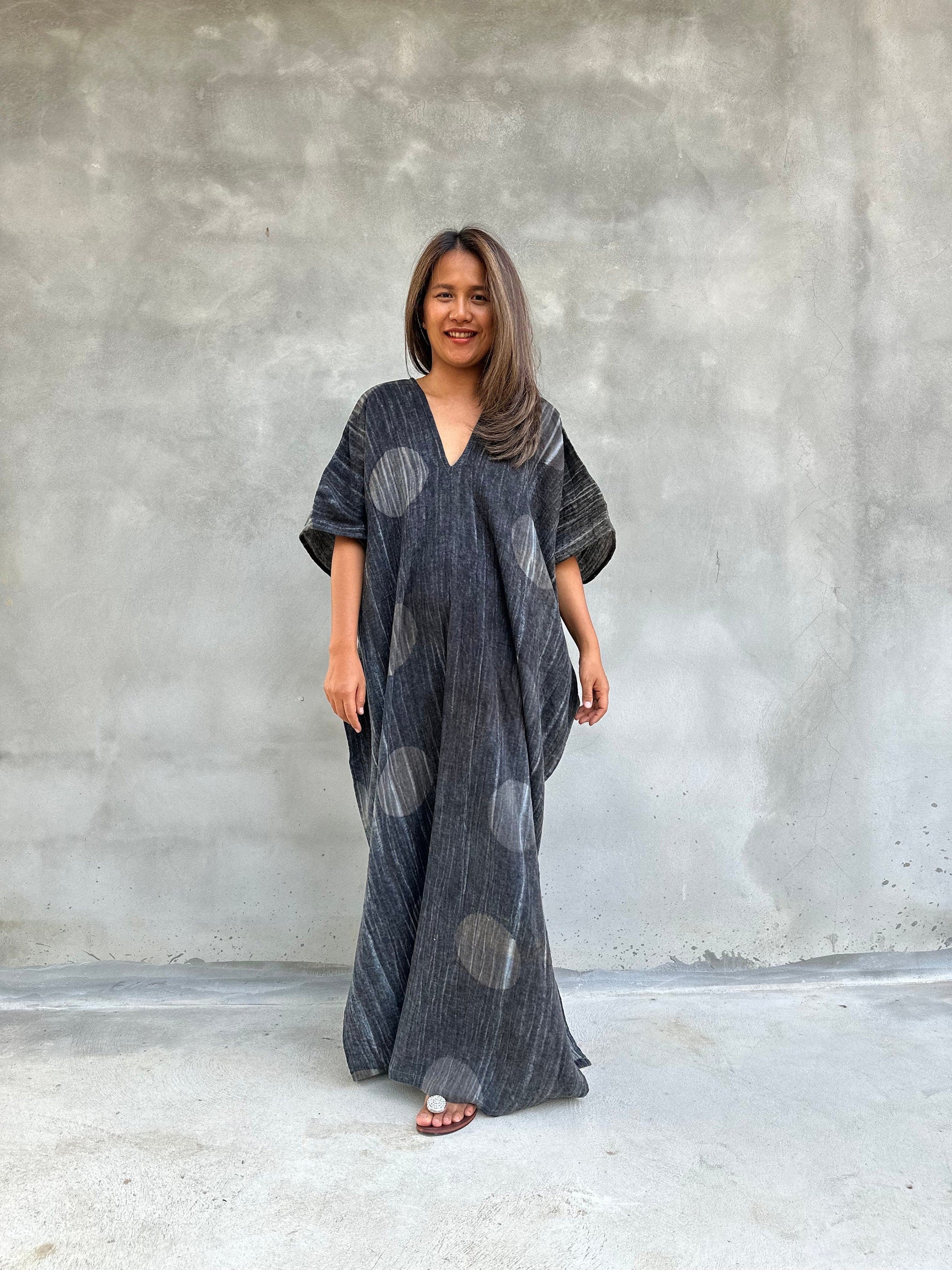 Amina Hand-Painted Double Gauze Cotton Kaftan - Black Polka Dot Pattern
