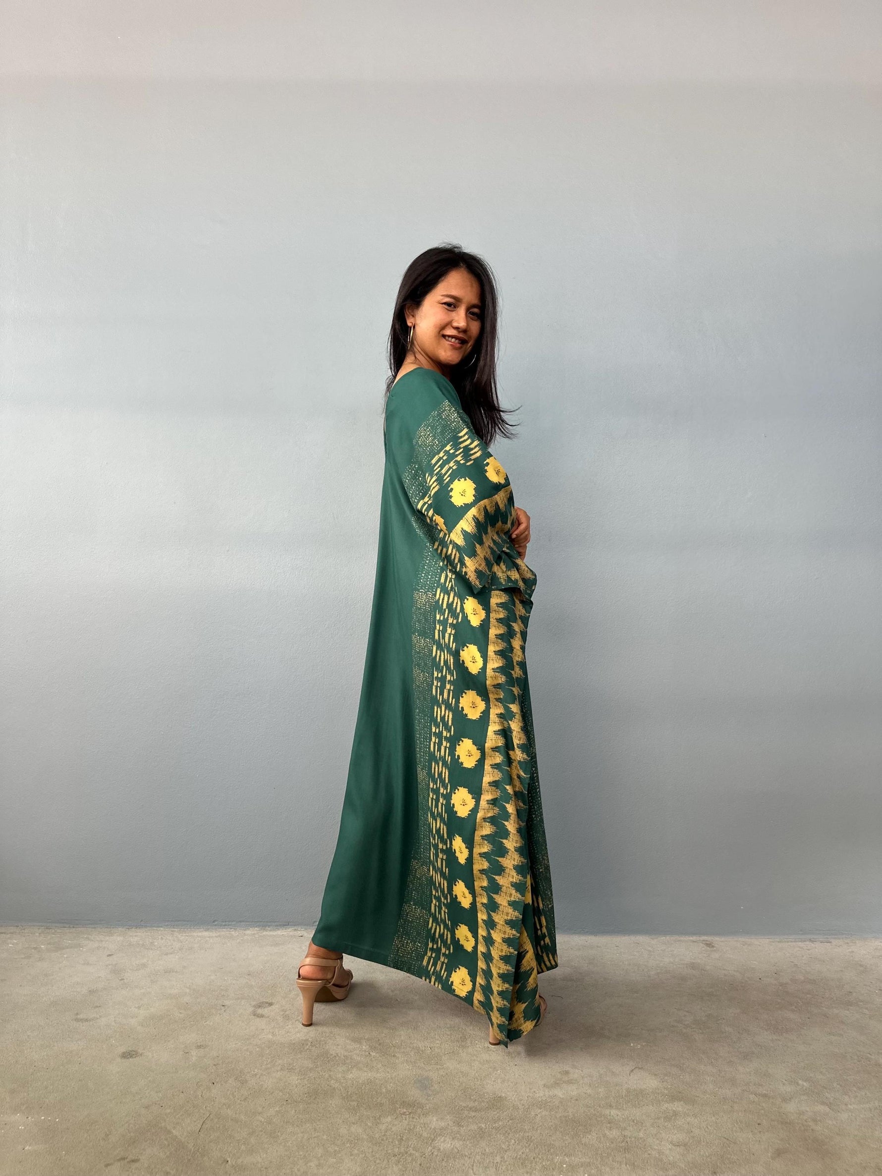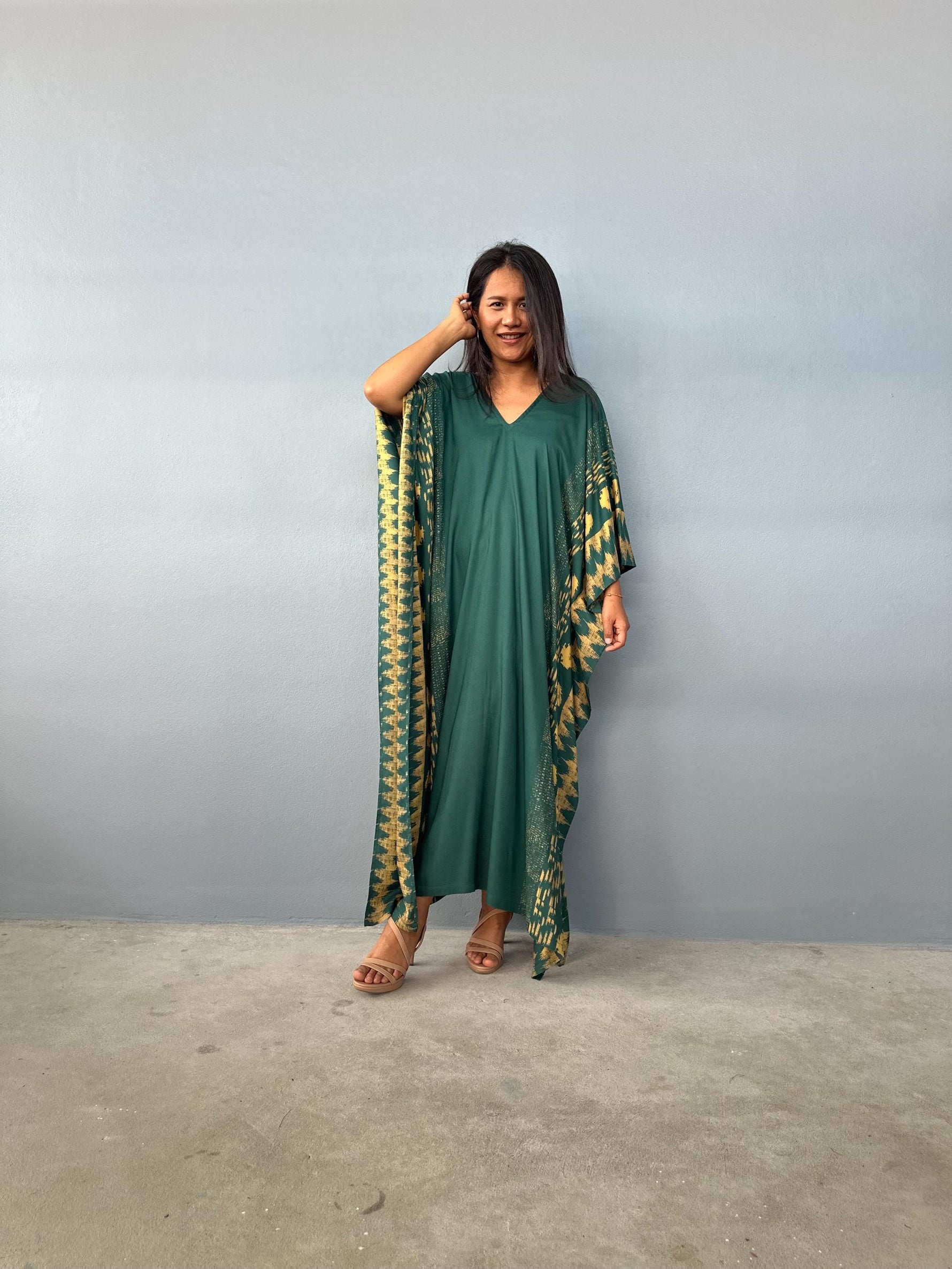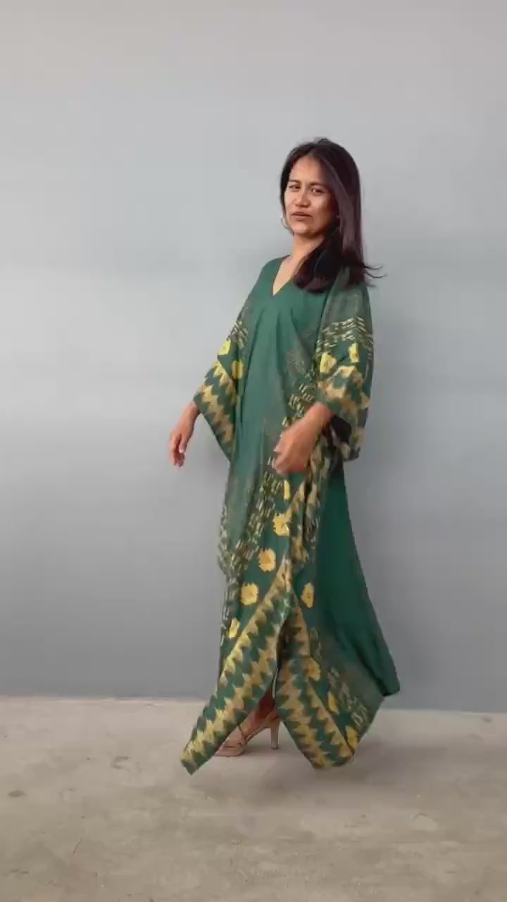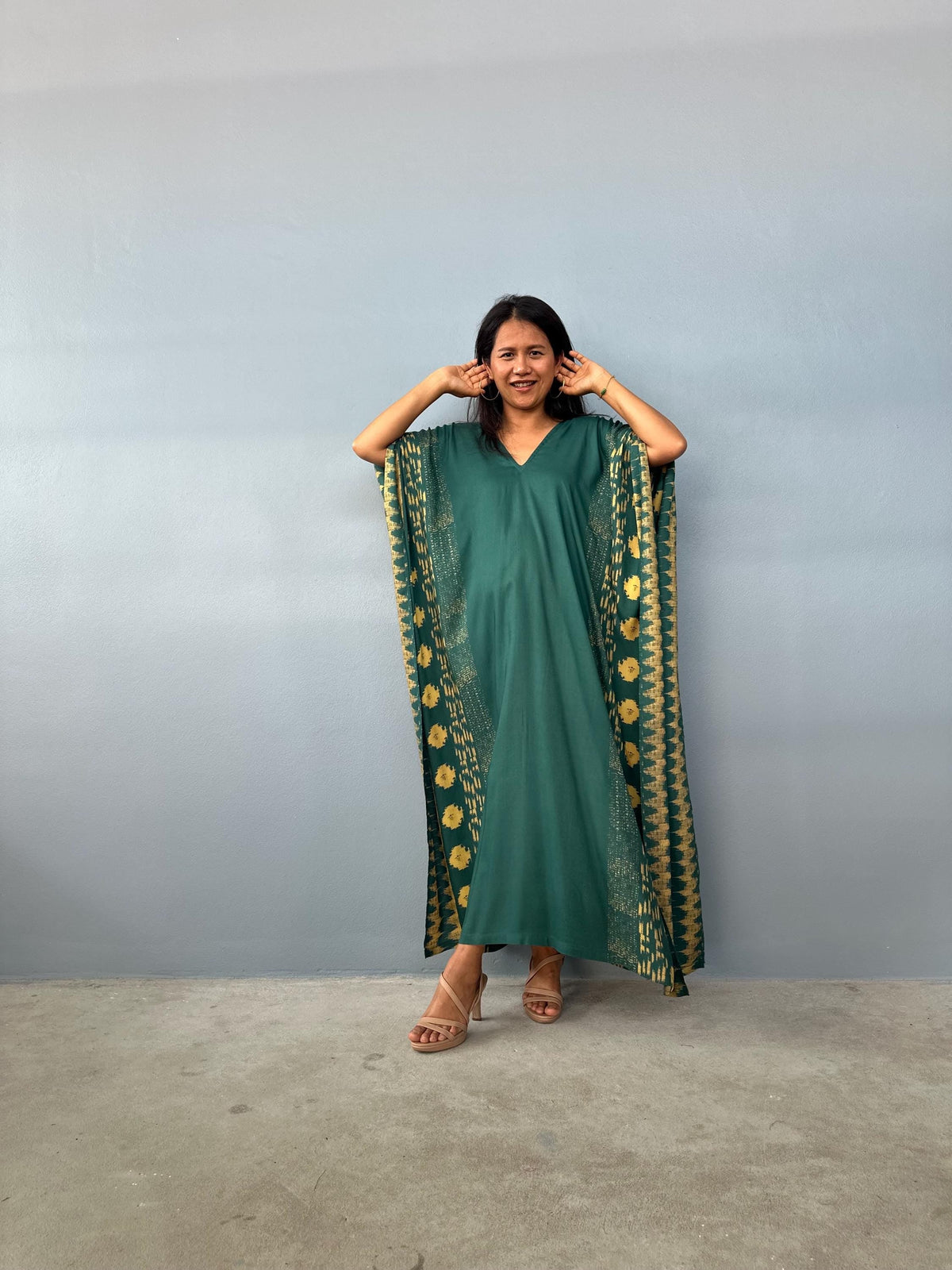 Unlike stiff, mass-made kaftans, Luna drapes naturally. Lightweight rayon voile in green moves with you, while the wrap-friendly silhouette offers comfortable coverage and side slits to elongate the leg. Each tessera print is created through precise discharge dyeing - printing that removes color for sharp, lasting detail. A polished layer that goes from travel to dinner without trying.