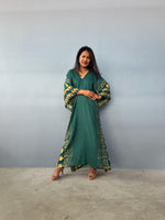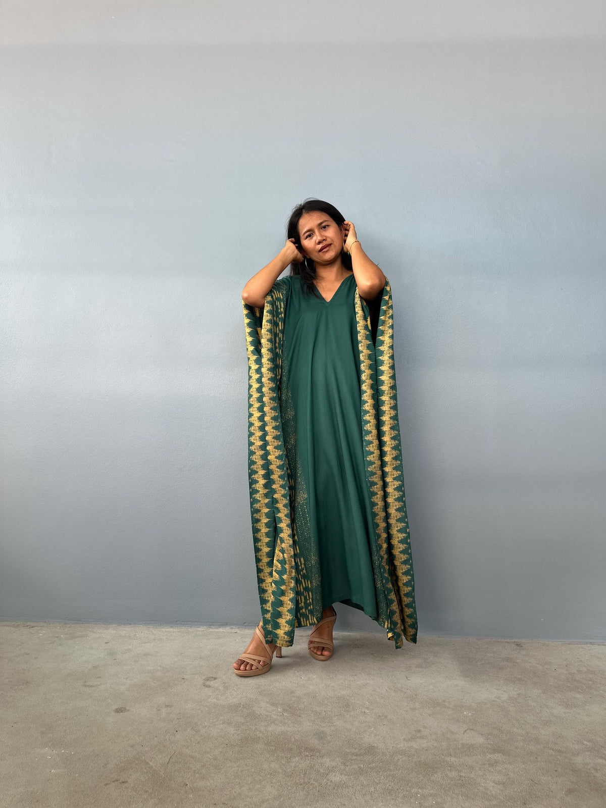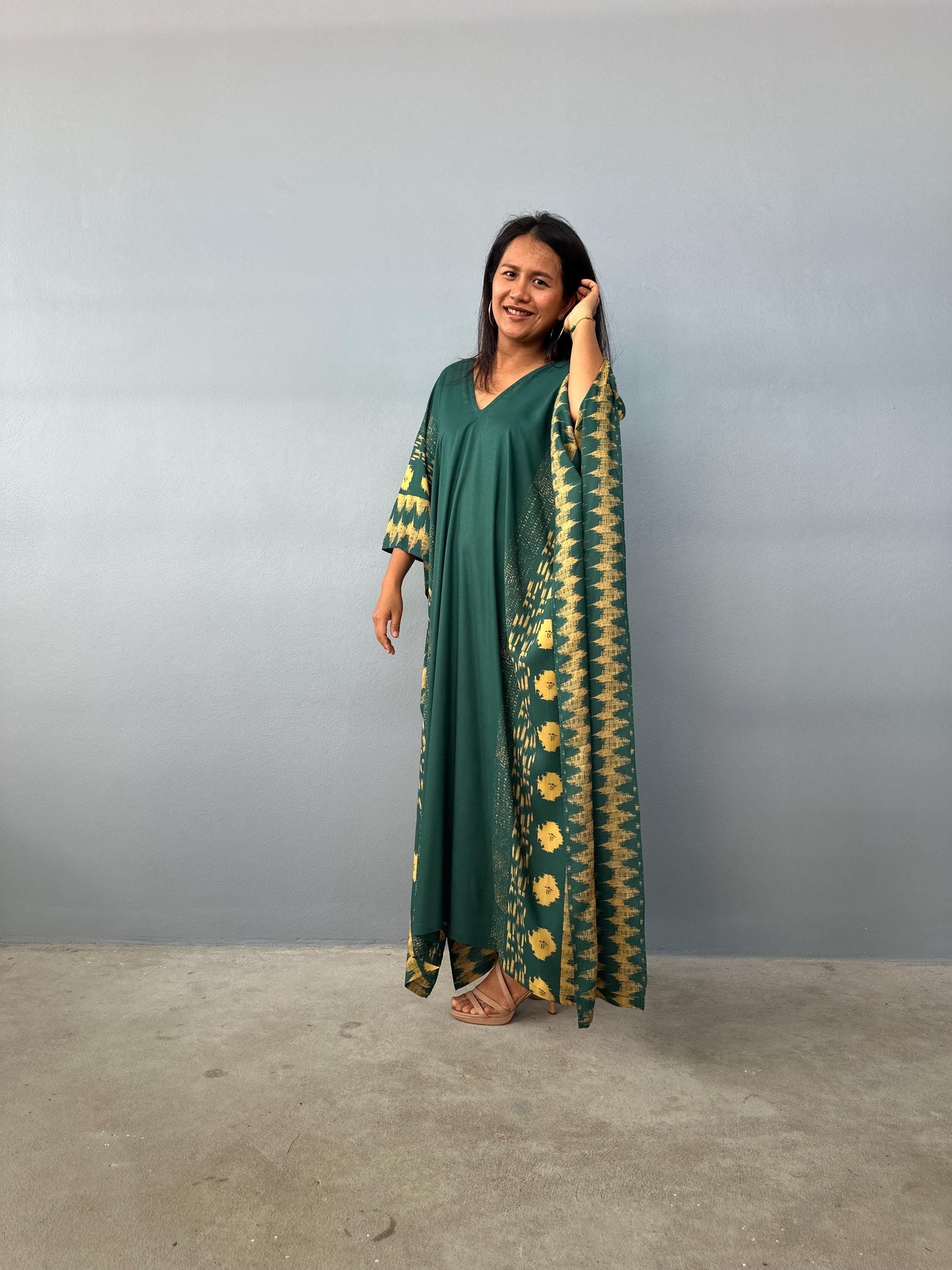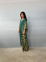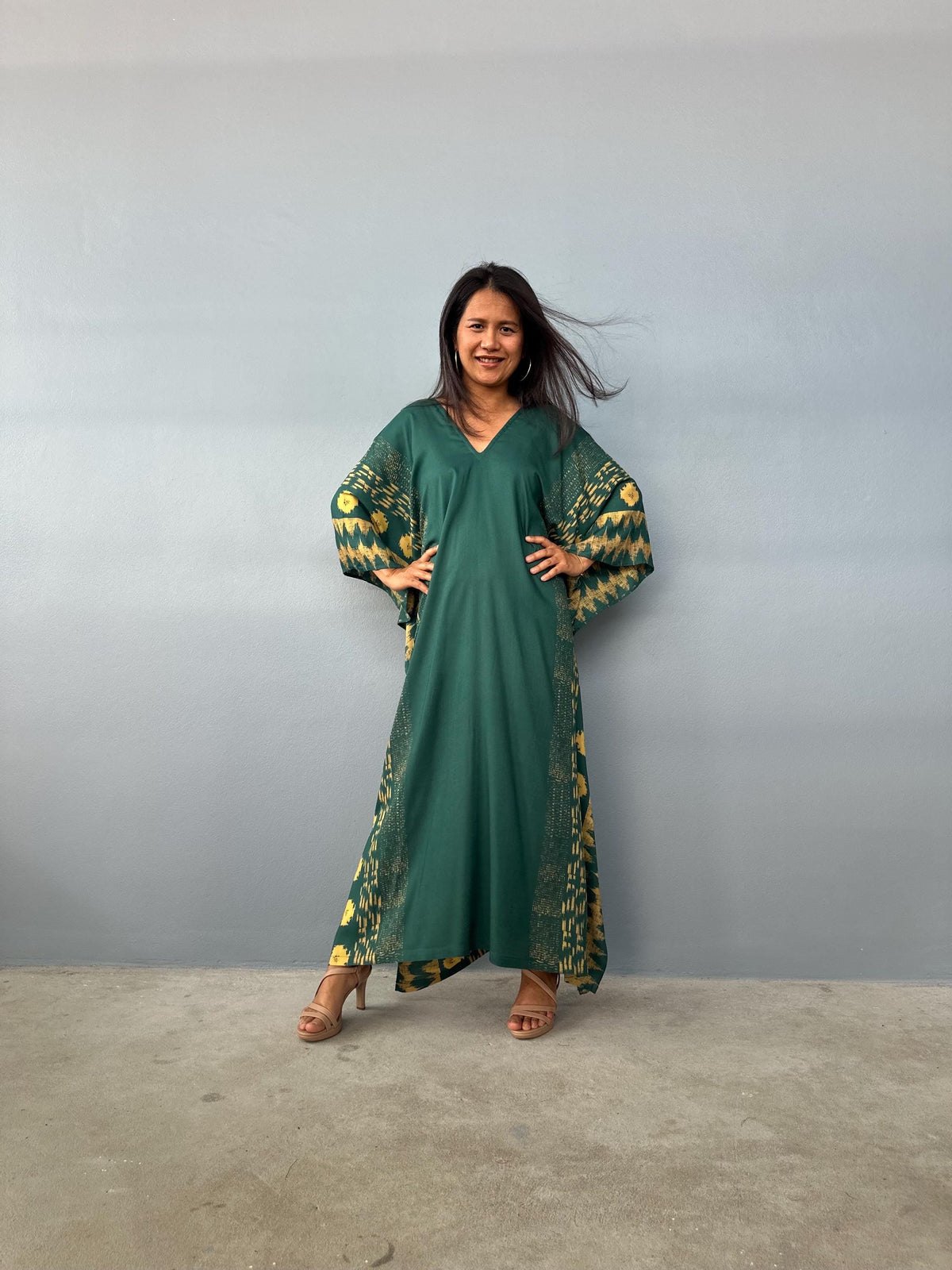 Unlike stiff, mass-made kaftans, Luna drapes naturally. Lightweight rayon voile in green moves with you, while the wrap-friendly silhouette offers comfortable coverage and side slits to elongate the leg. Each tessera print is created through precise discharge dyeing - printing that removes color for sharp, lasting detail. A polished layer that goes from travel to dinner without trying.