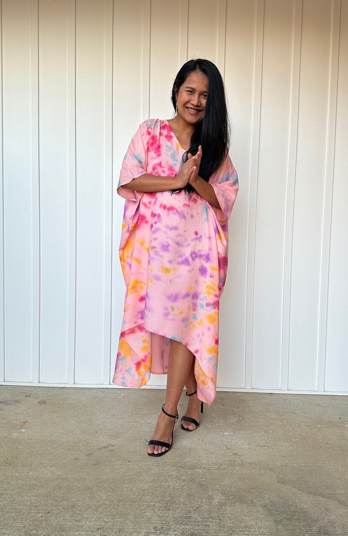 Stella High Low Kaftan in Pink and Rainbow Tie Dye