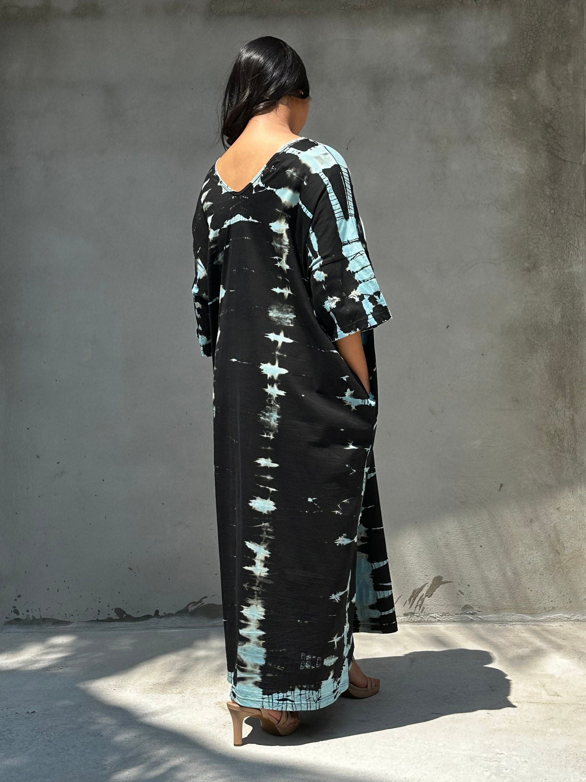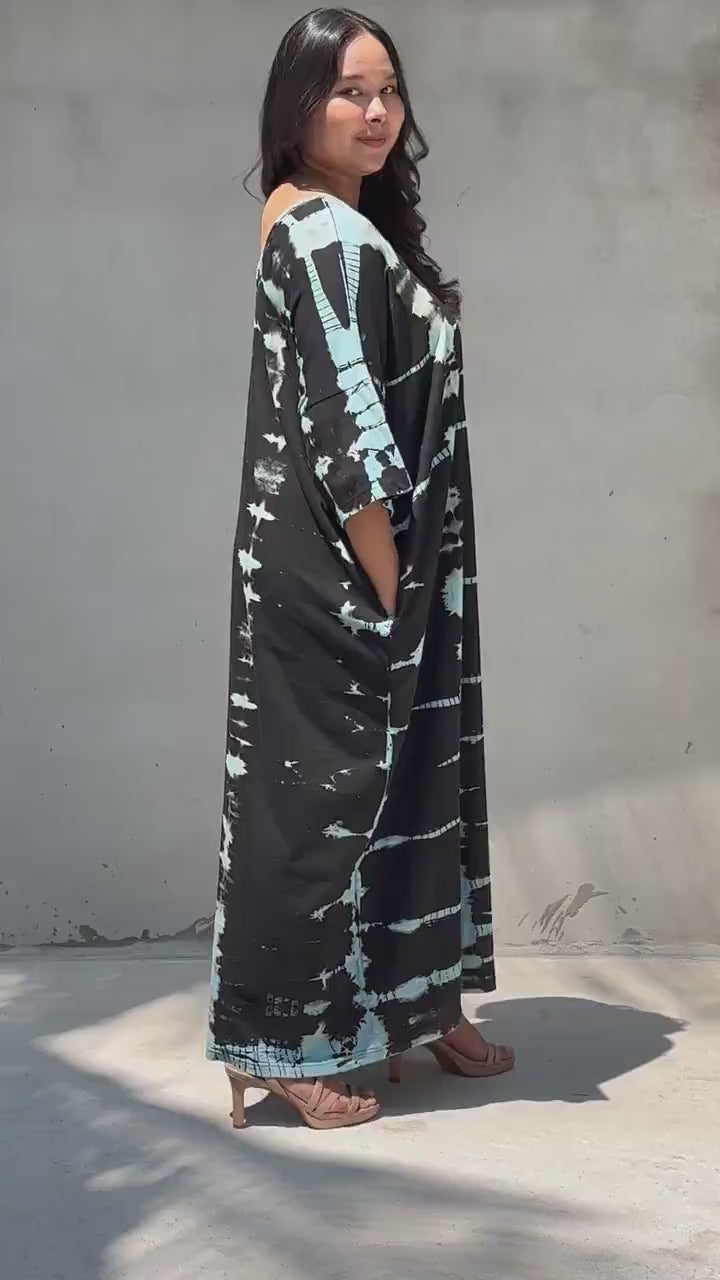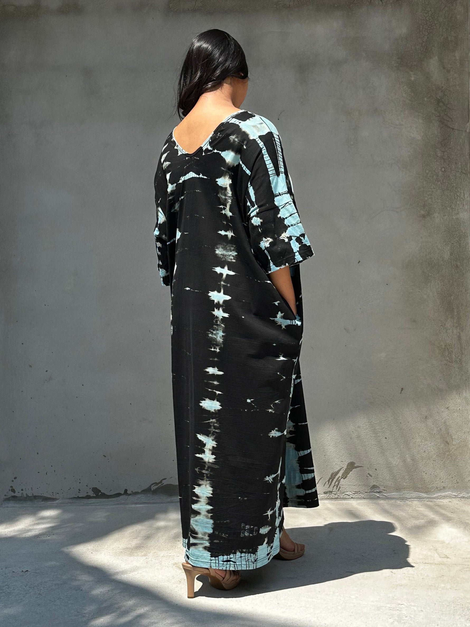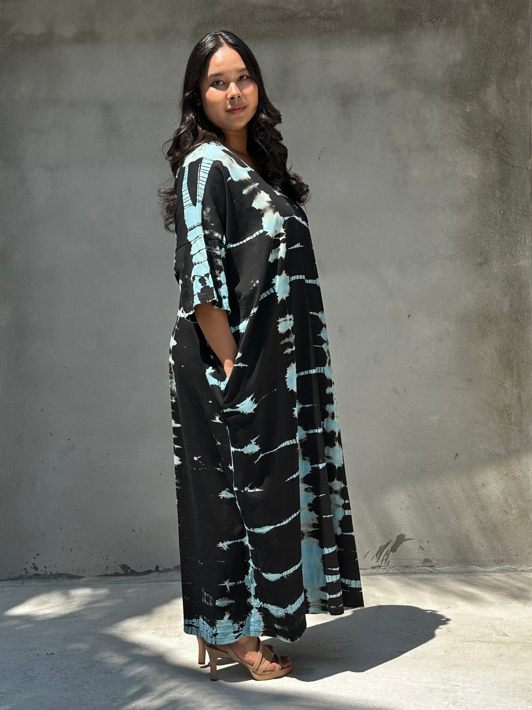 Color, comfort, and character β the Olivia Tie-Dye brings all three. Crafted from ultra-soft jersey cotton, it drapes smoothly for all-day ease, while the black and blue adds vibrant personality. Each tie-dye piece is uniquely hand tied and dyed patterned, so yours wonβt look like anyone elseβs. Style as a statement beach cover-up, toss on with slides for the market, or dress it up with strappy sandals and earrings for evening. The relaxed silhouette keeps things breathable and unfussy, letting the print do the talking. Available in 51 inch length.