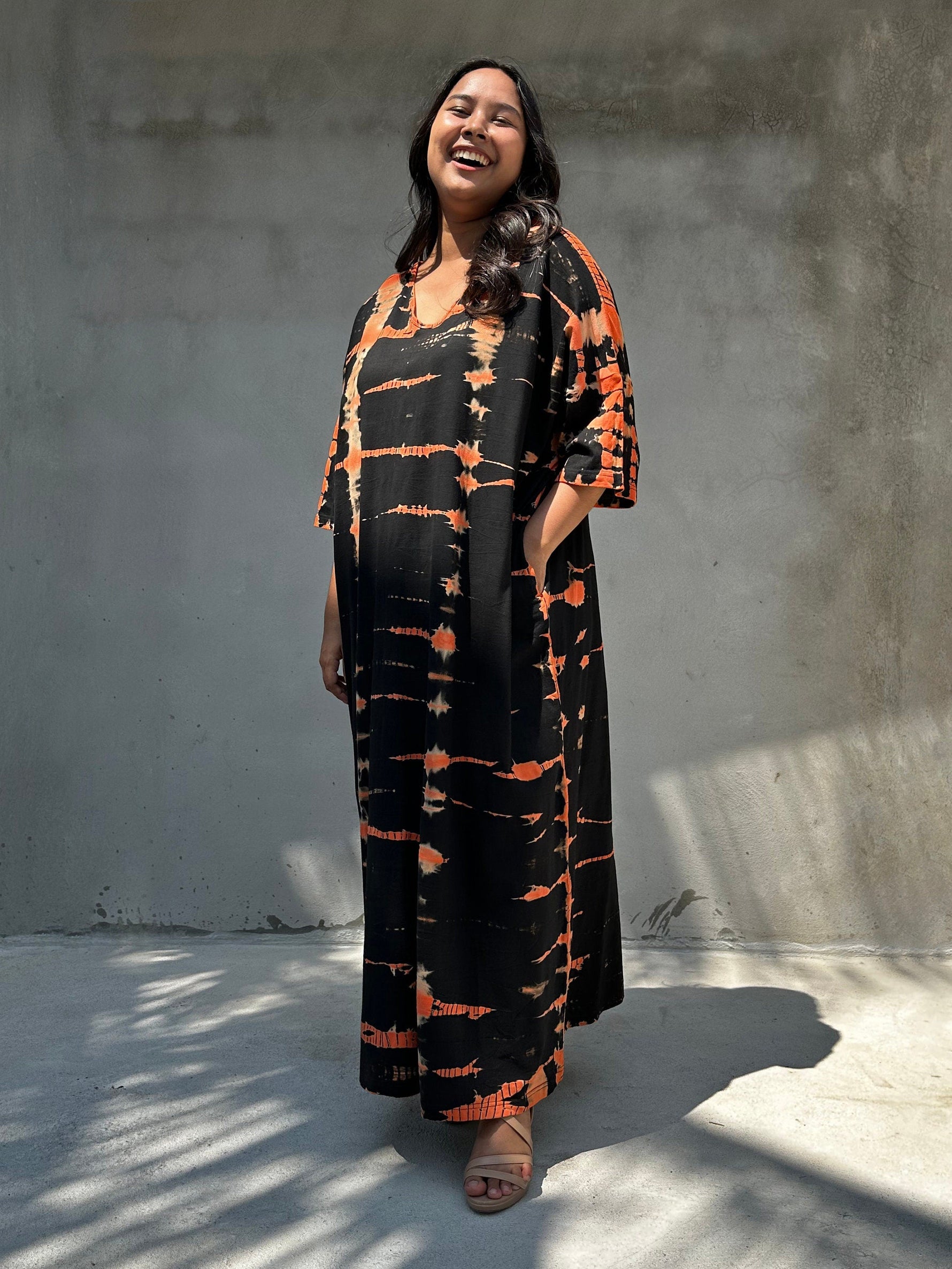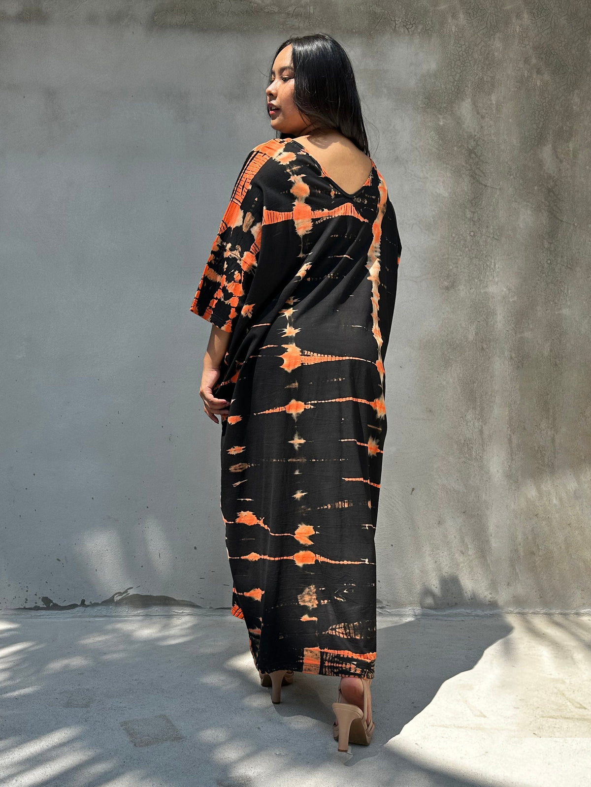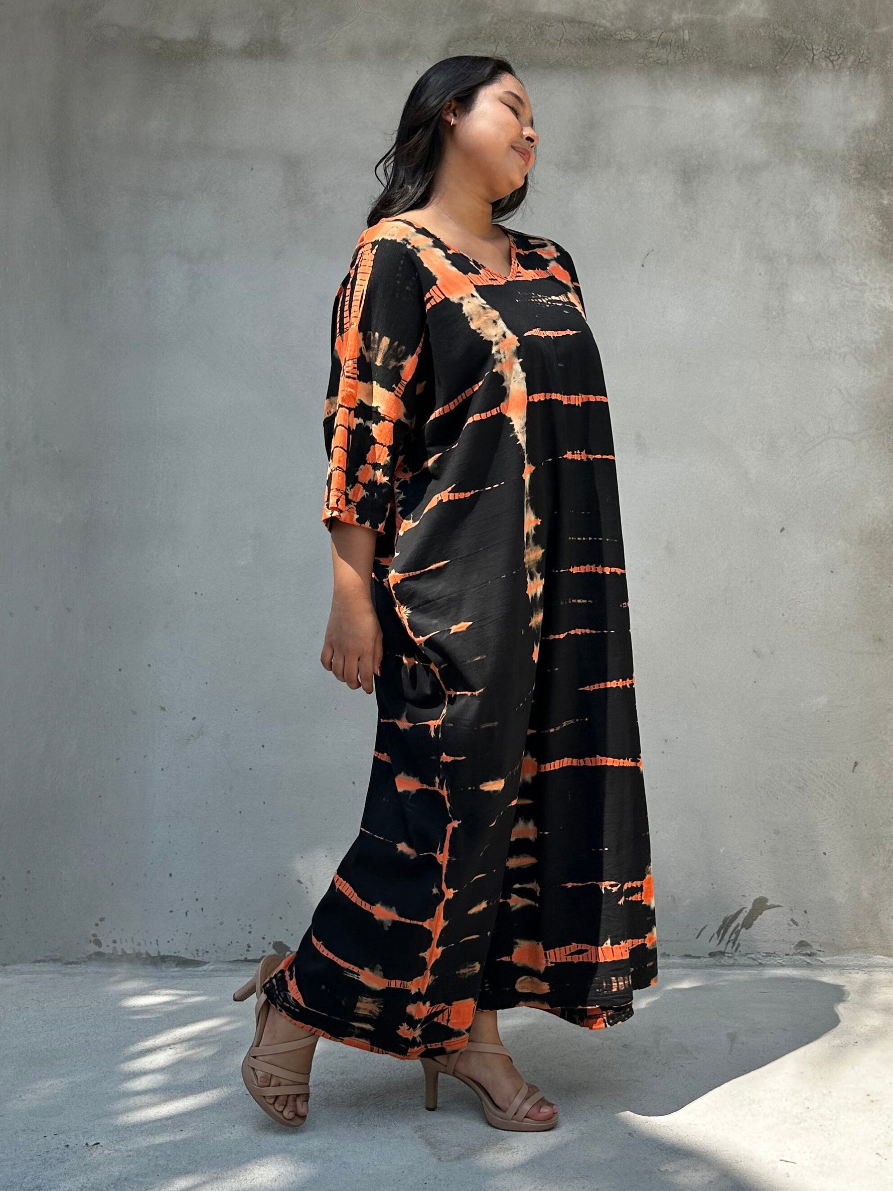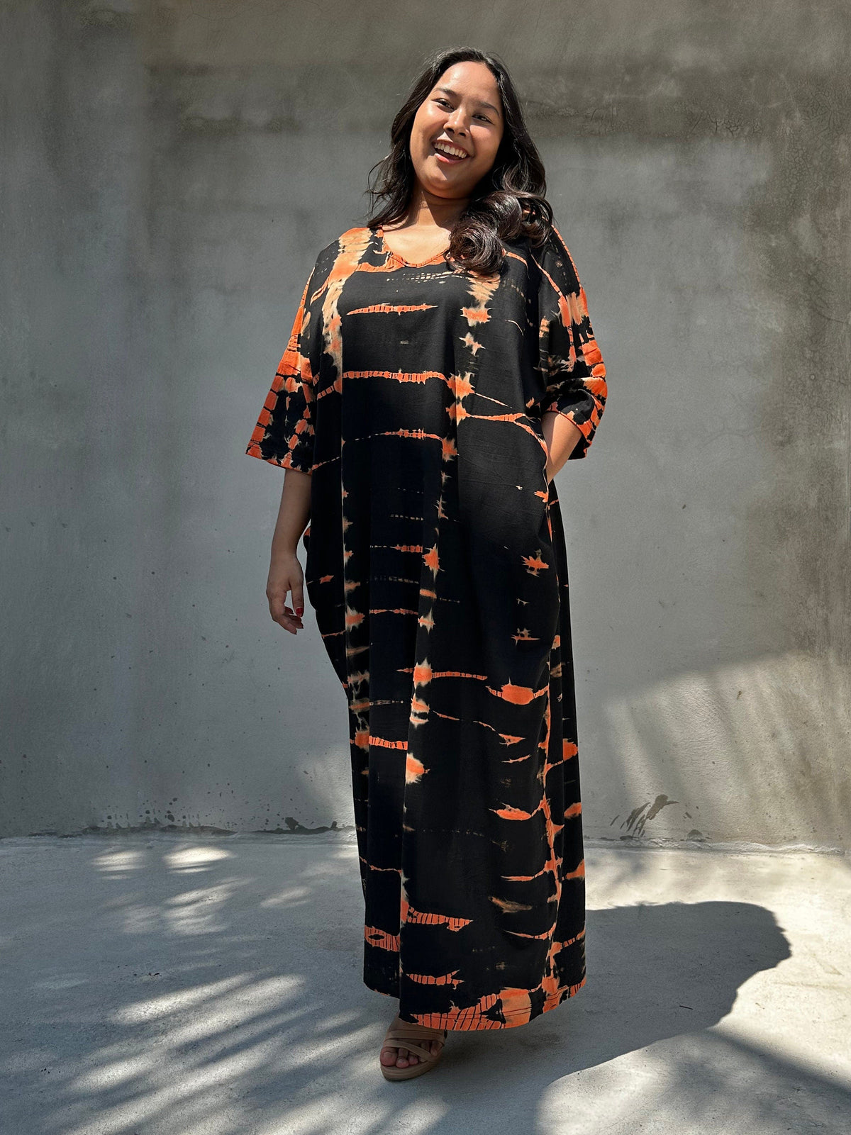 Color, comfort, and character – the Olivia Tie-Dye brings all three. Crafted from ultra-soft jersey cotton, it drapes smoothly for all-day ease, while the black and orange adds vibrant personality. Each tie-dye piece is uniquely hand tied and dyed patterned, so yours won’t look like anyone else’s. Style as a statement beach cover-up, toss on with slides for the market, or dress it up with strappy sandals and earrings for evening. The relaxed silhouette keeps things breathable and unfussy, letting the print do the talking. Available in 51 inch length.