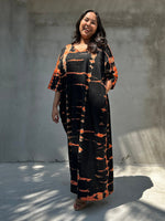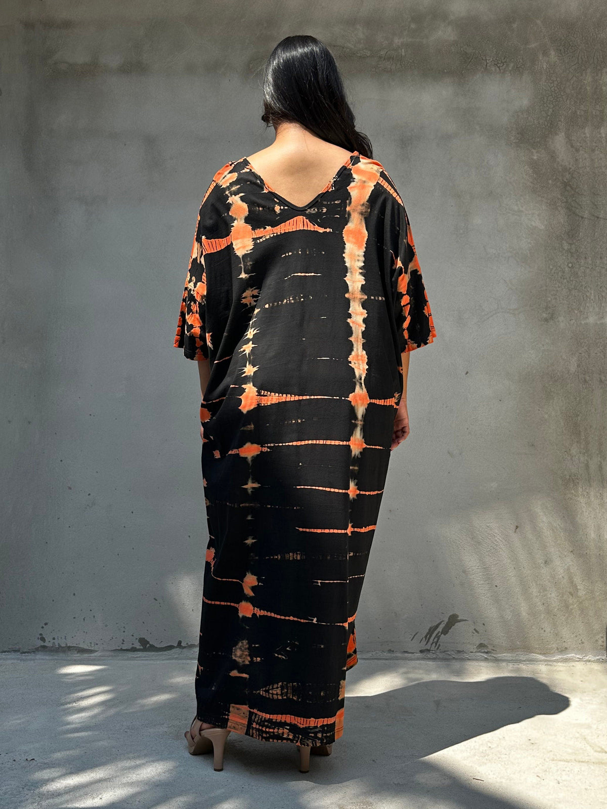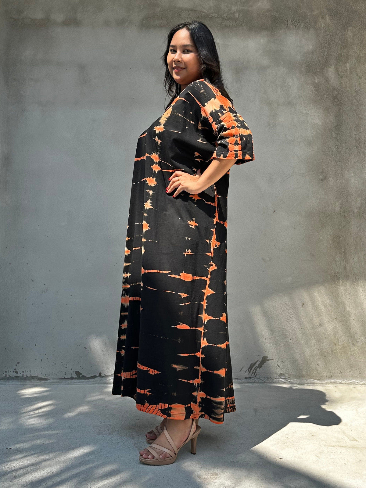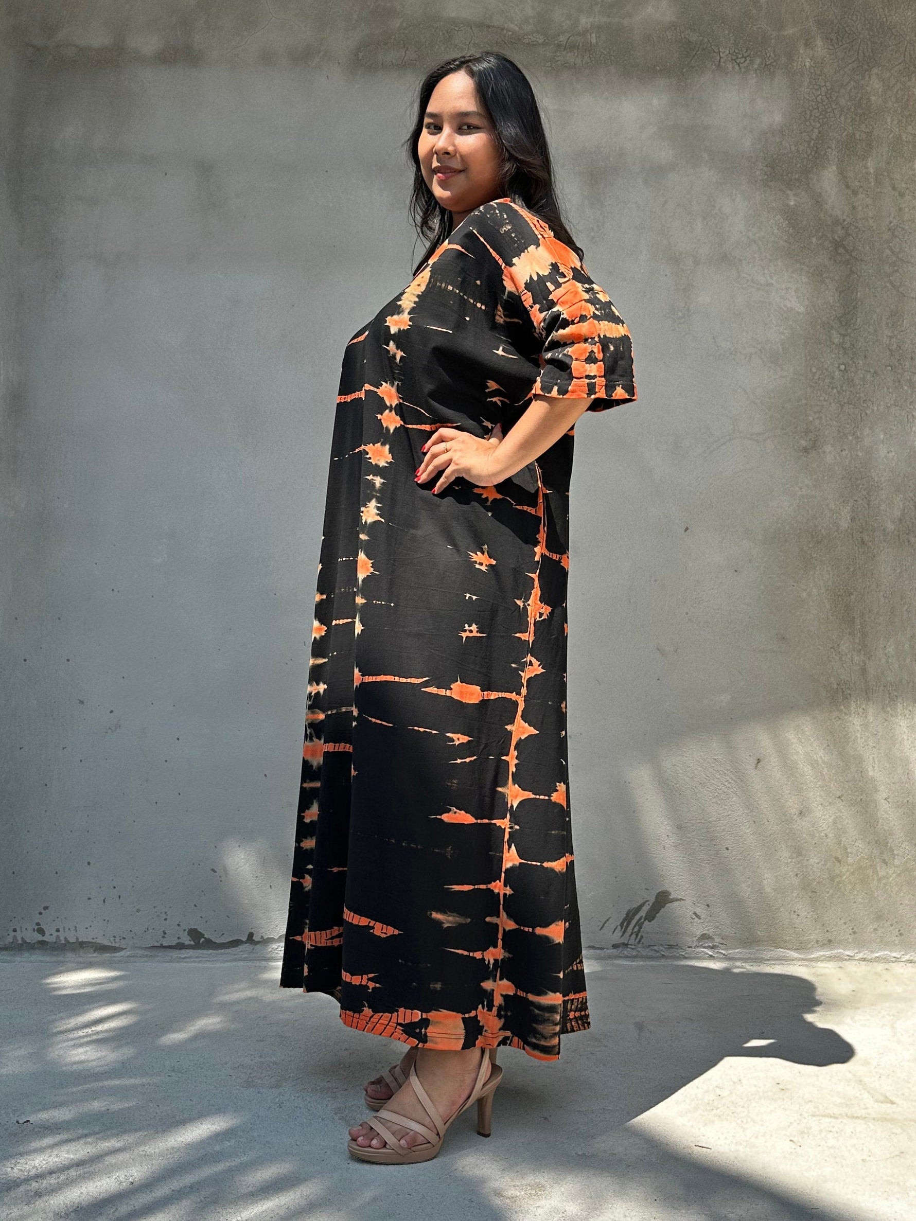 Color, comfort, and character – the Olivia Tie-Dye brings all three. Crafted from ultra-soft jersey cotton, it drapes smoothly for all-day ease, while the black and orange adds vibrant personality. Each tie-dye piece is uniquely hand tied and dyed patterned, so yours won’t look like anyone else’s. Style as a statement beach cover-up, toss on with slides for the market, or dress it up with strappy sandals and earrings for evening. The relaxed silhouette keeps things breathable and unfussy, letting the print do the talking. Available in 51 inch length.