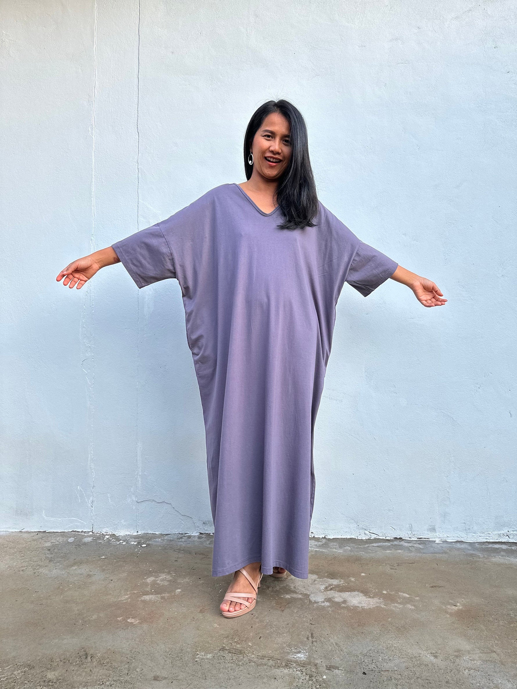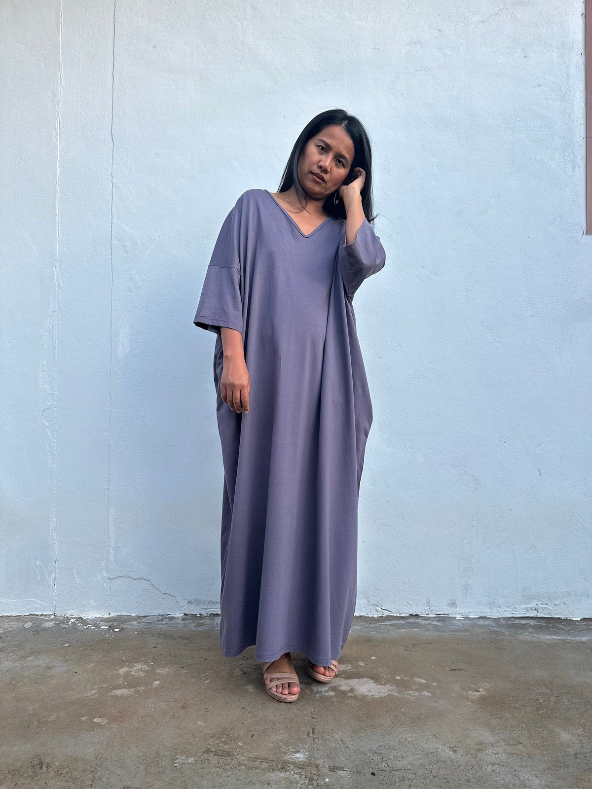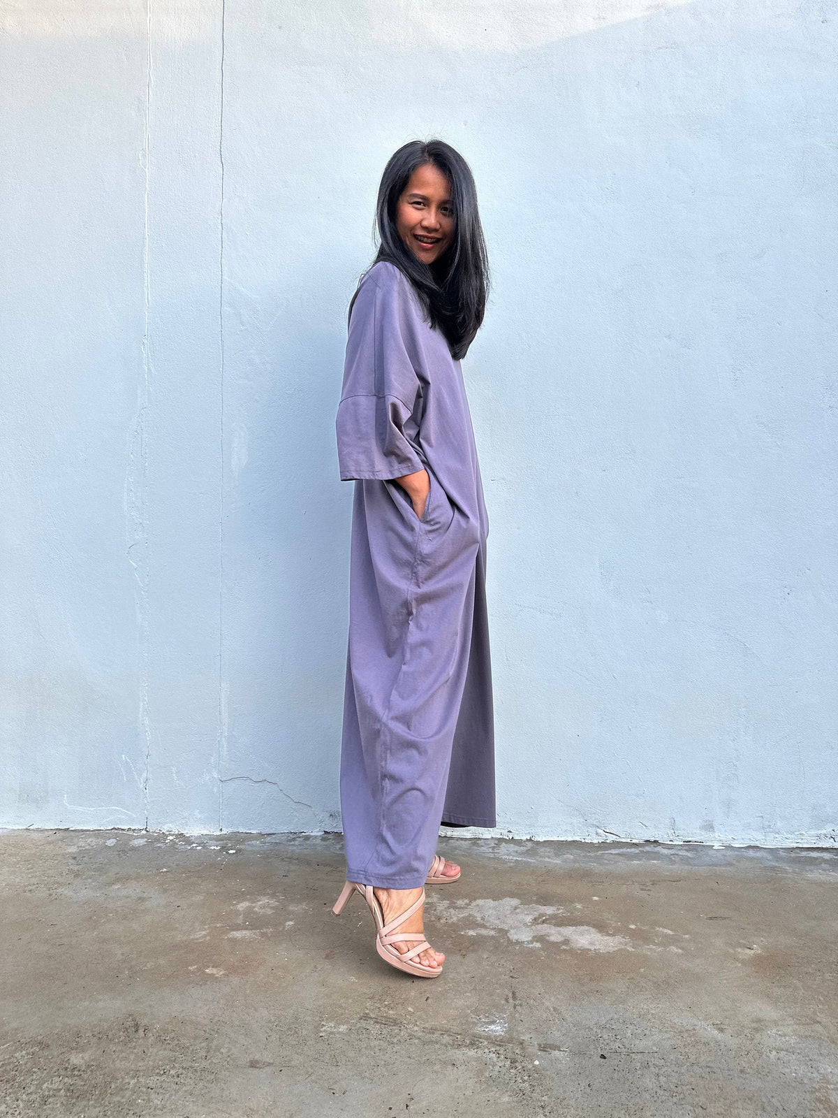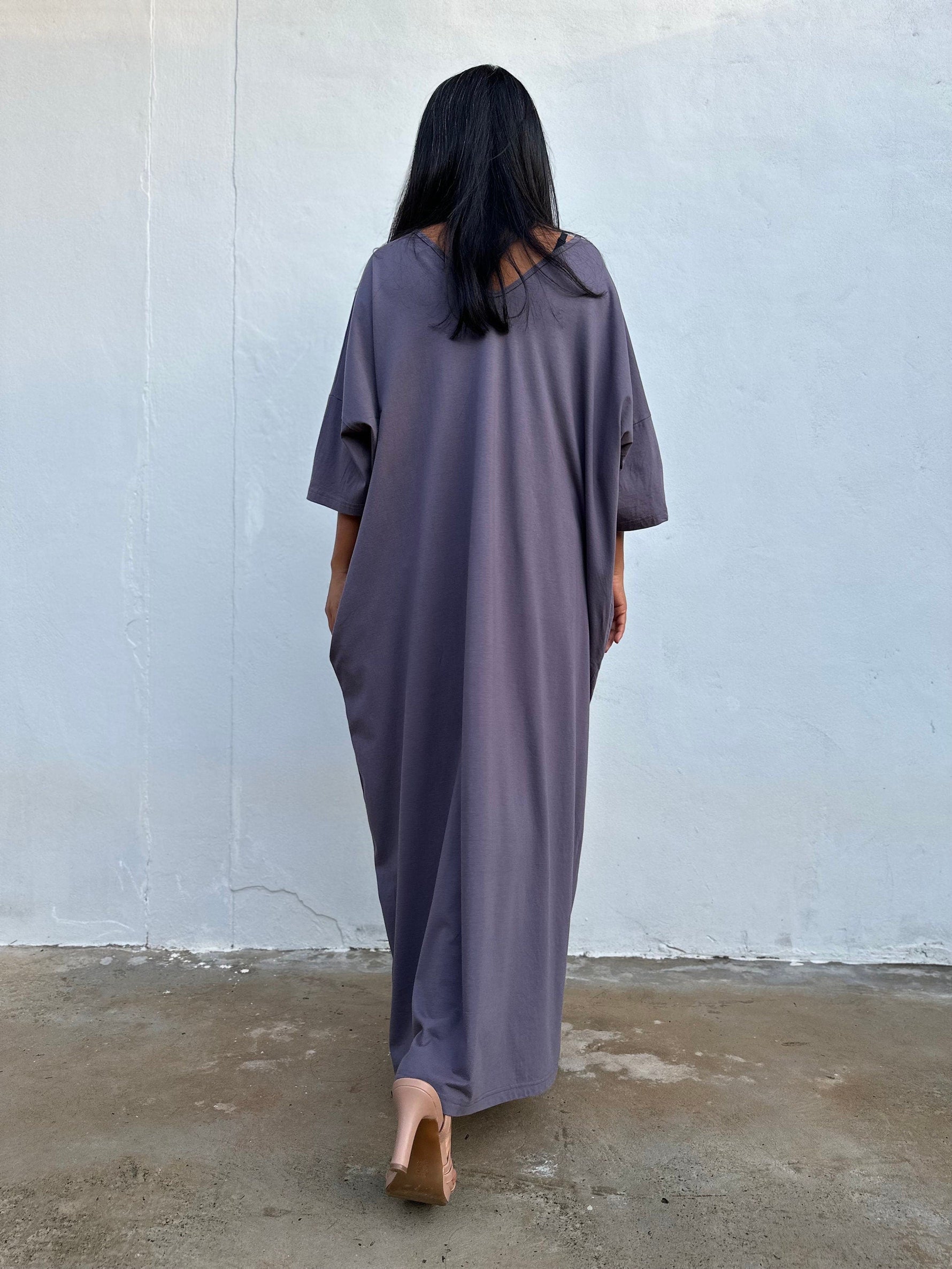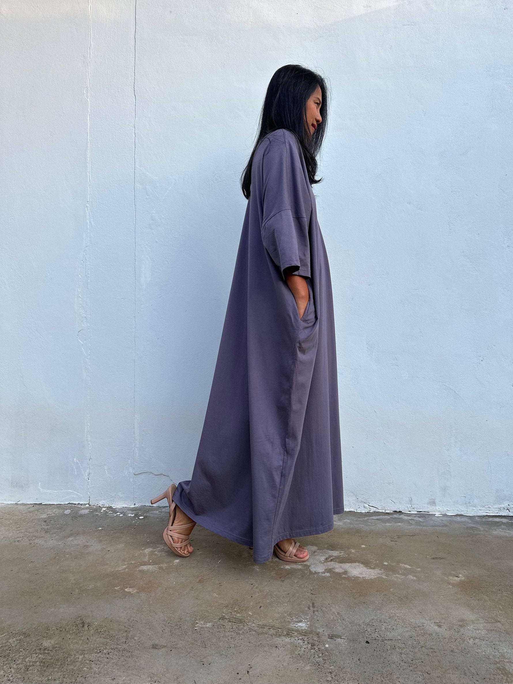 If your favorite T-shirt became a dress, it would be Olivia. The jersey cotton feels soft against the skin, and the fluid silhouette offers room to breathe while keeping a streamlined line. In solid gray, it’s endlessly pairable – think slides and shades for errands, or a cuff bracelet and sandals for dinner on the town. Wear loose for sculptural flow or add a slim belt to define the waist. Available in 52 inch length, it’s effortless, season-spanning, and always ready when you are.