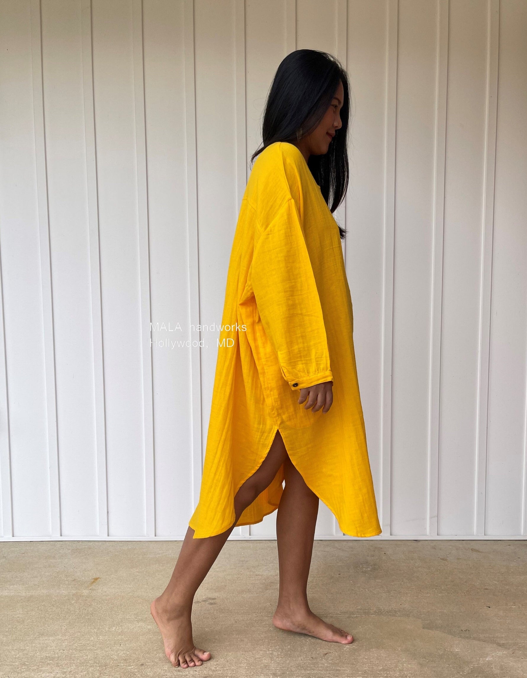 Crafted from breathable double gauze cotton, Aura’s knee-length cut is roomy for a relaxed, flattering line. The shirt-dress details – collar, buttons, cuffed vibe – add structure, while turmeric yellow keeps it modern. Throw it over swim, wear it solo, or layer it with your favorite leggings. An easy capsule-wardrobe staple.