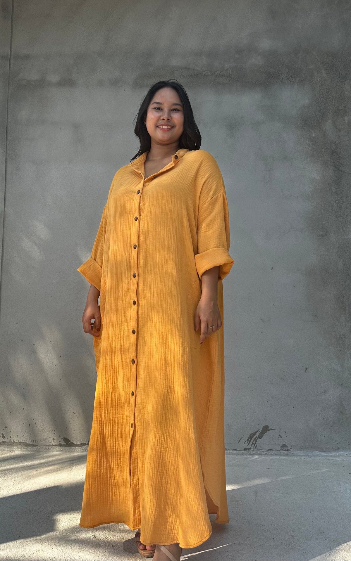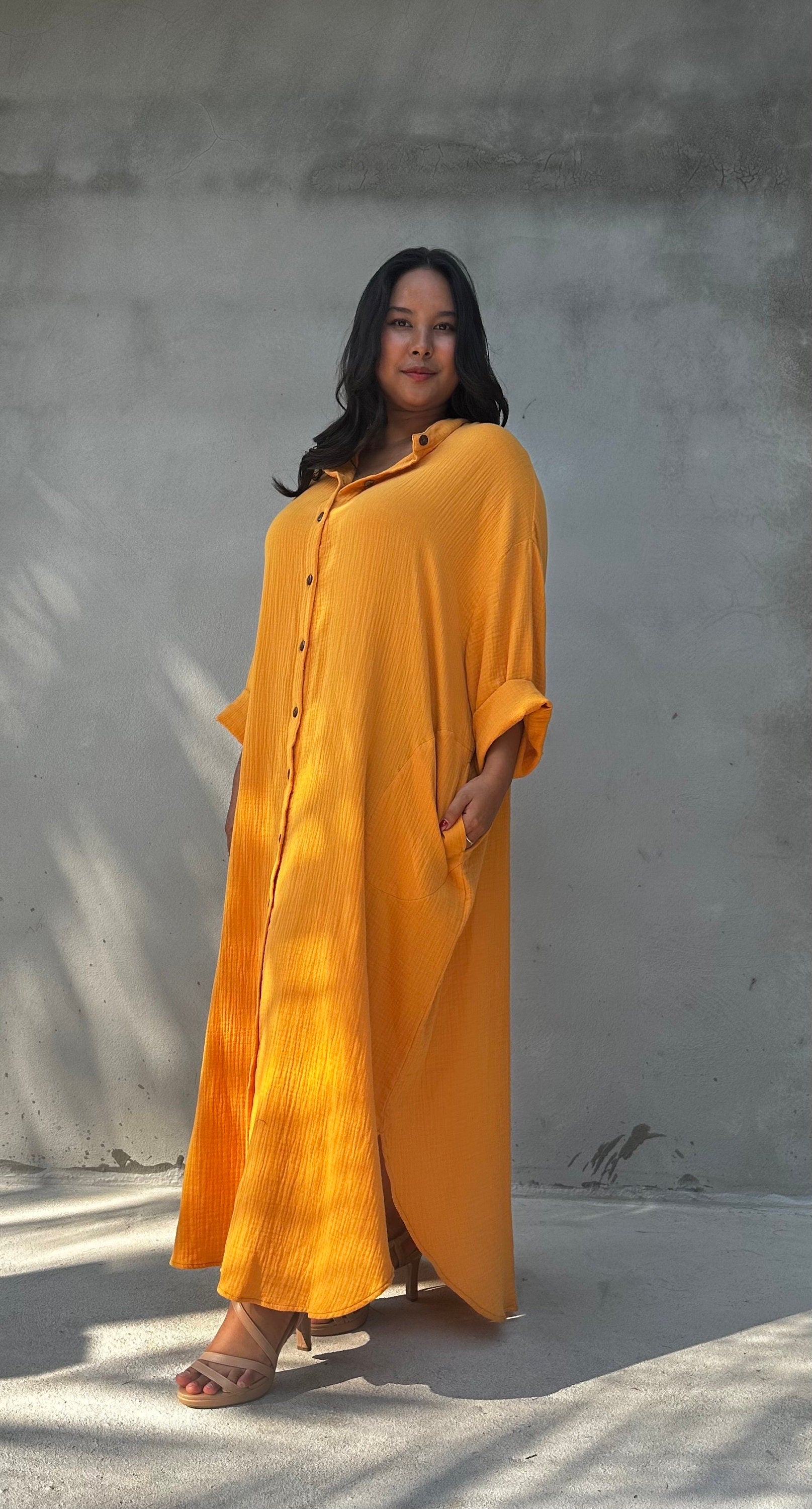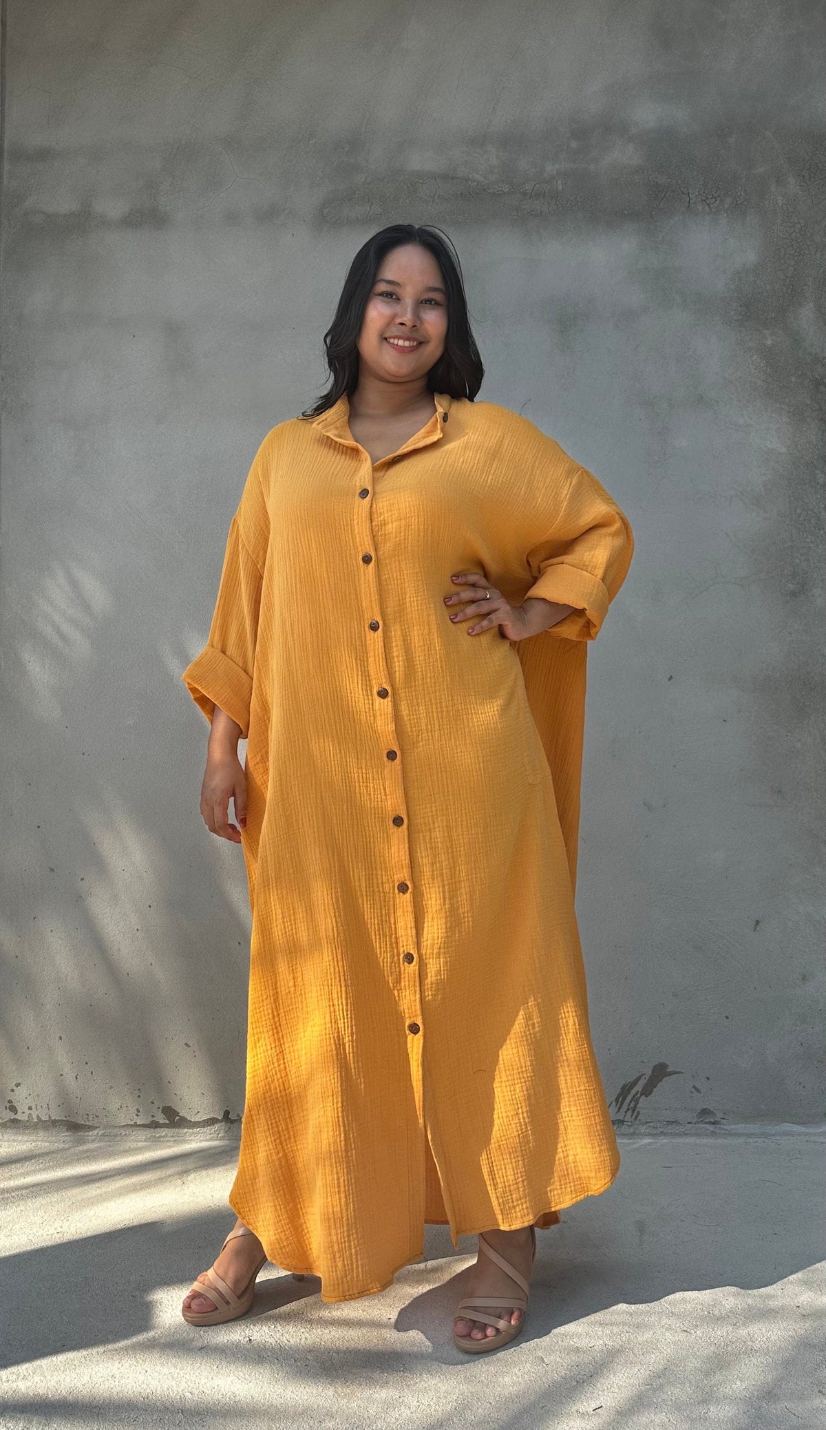Relax in style with the mango yellow Aura shirtdress, a unique take on traditional loungewear. Made from breathable double gauze cotton, it's perfect for casual wear out, at home, or even as a beach coverup. The button-down design adds a touch of style and versatility to your wardrobe, ensuring comfort and convenience as you go about your day.