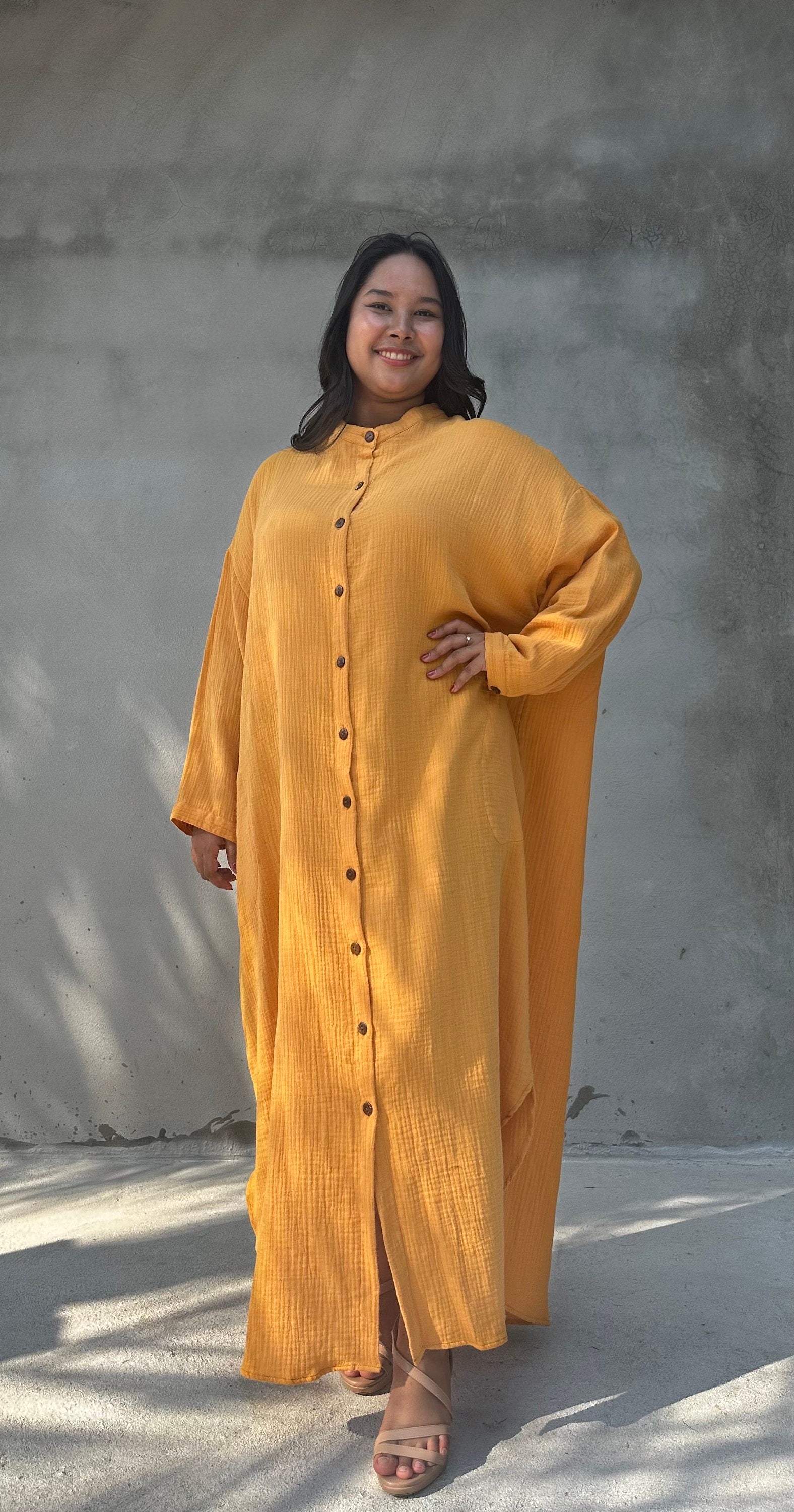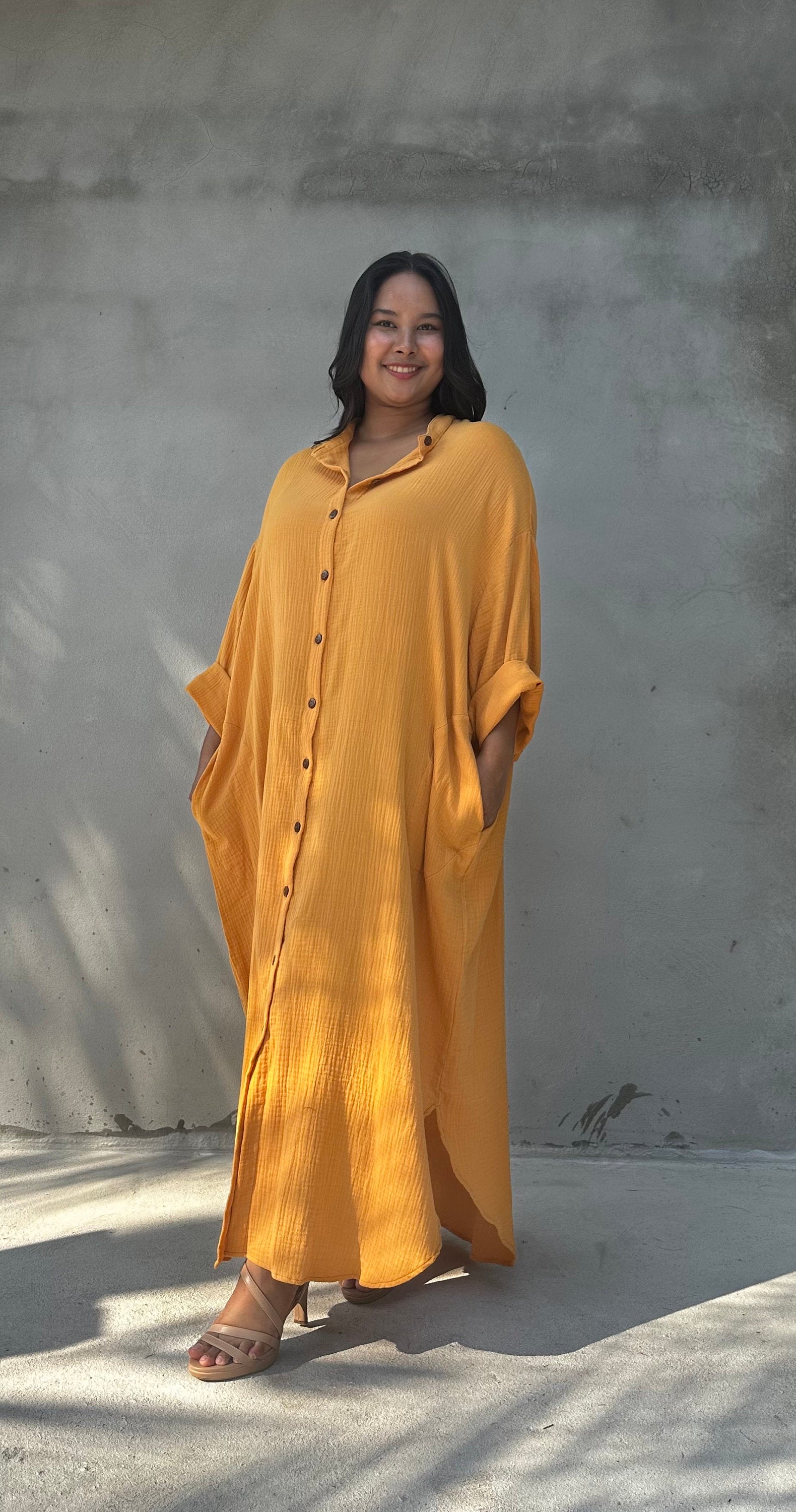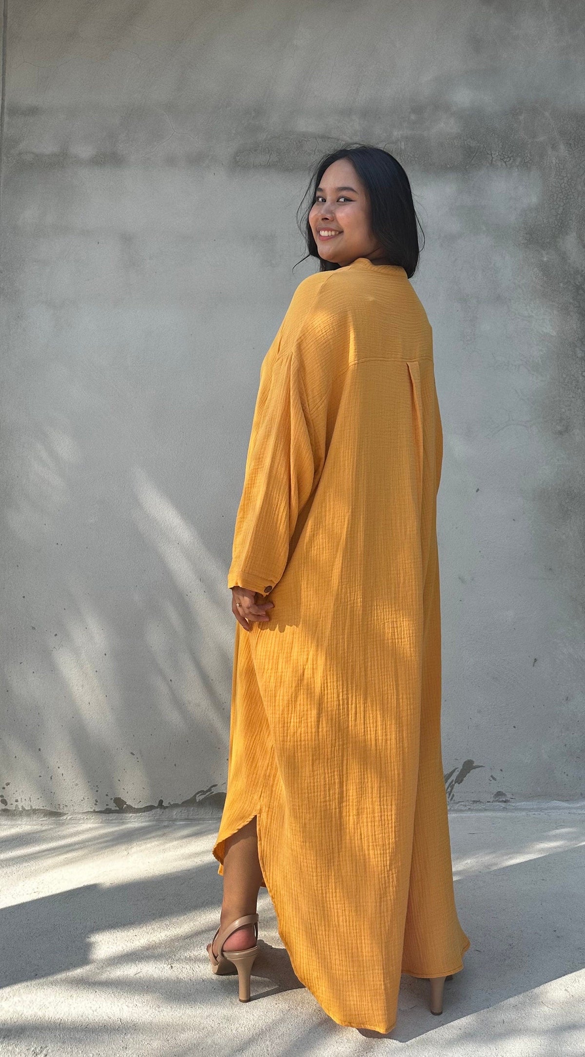 Relax in style with the mango yellow Aura shirtdress, a unique take on traditional loungewear. Made from breathable double gauze cotton, it's perfect for casual wear out, at home, or even as a beach coverup. The button-down design adds a touch of style and versatility to your wardrobe, ensuring comfort and convenience as you go about your day.