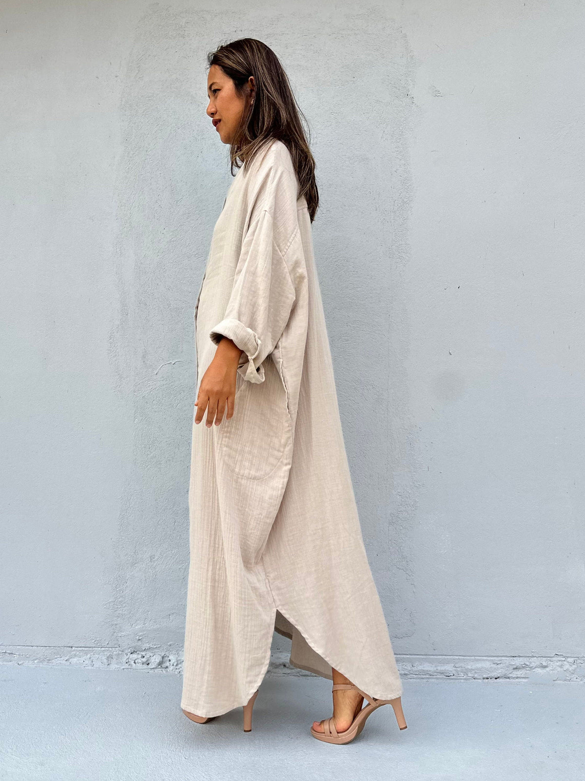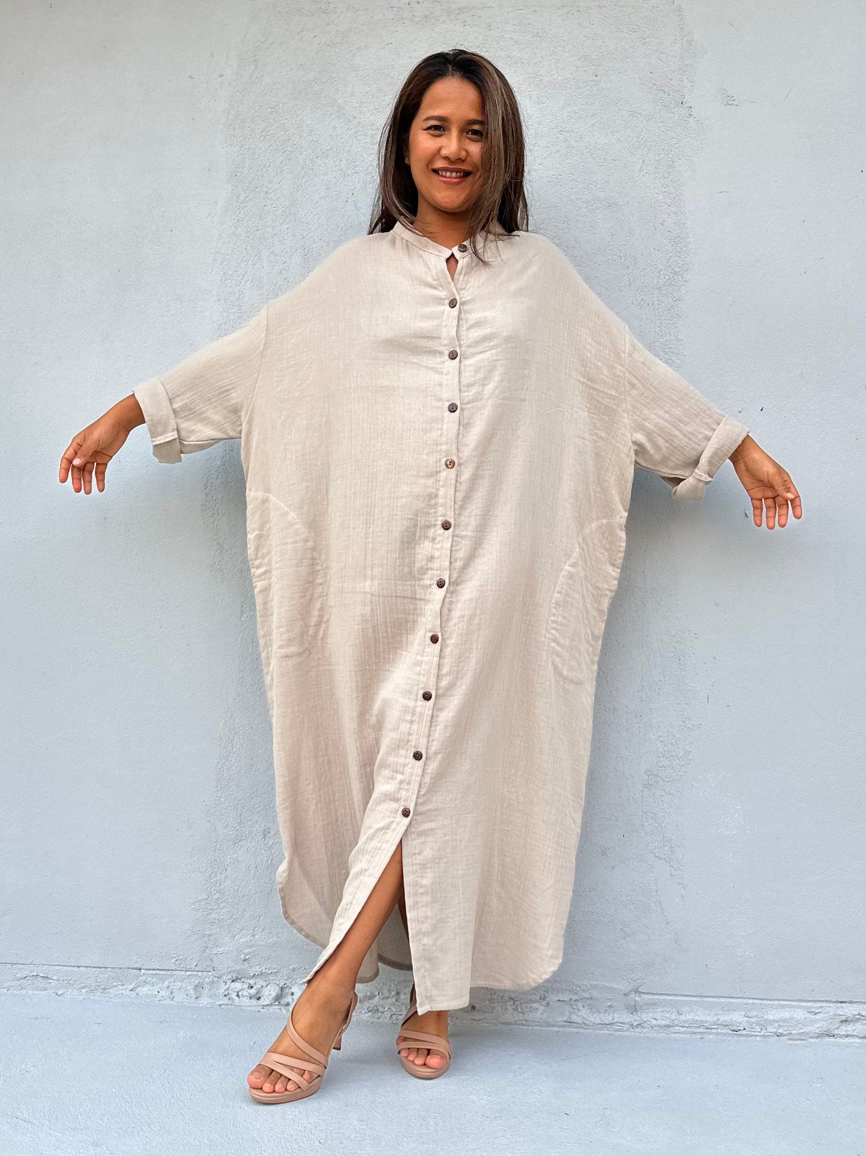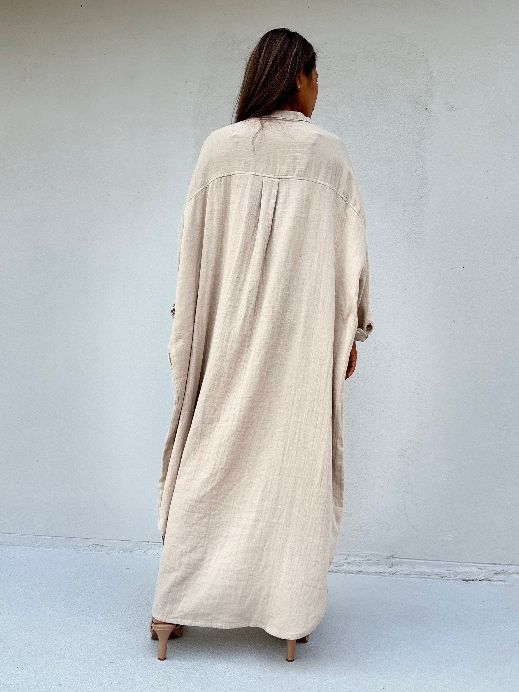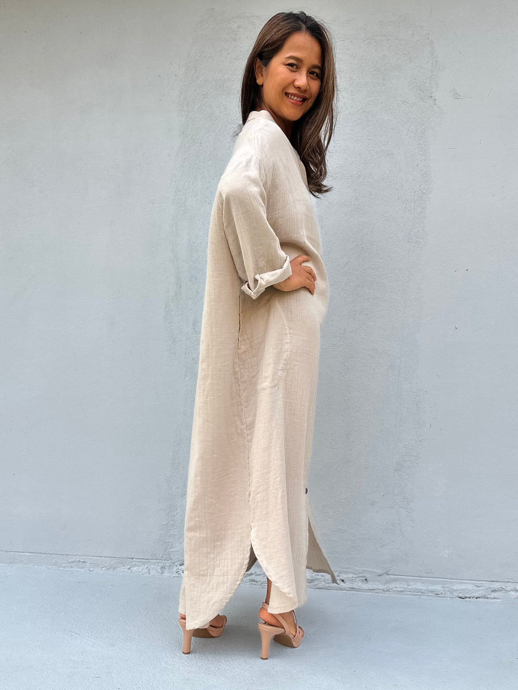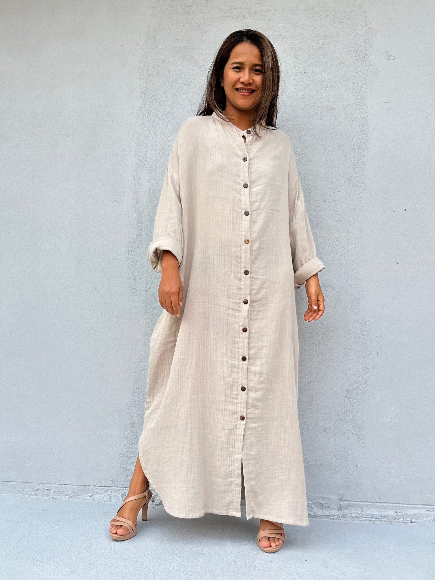 Relax in style with the Aura shirtdress in cream, a unique take on traditional loungewear. Made from breathable linen, it's perfect for casual wear out, at home, or even as a beach coverup. The button-down design adds a touch of style and versatility to your wardrobe, ensuring comfort and convenience as you go about your day.
