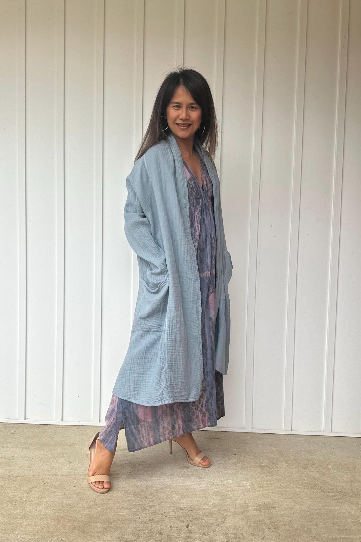 Experience the perfect balance of coverage and breathability with our Yara Open Cardigan. Crafted in beautiful mist blue double gauze cotton, this knee-length layer provides just enough warmth without weight, making it your wardrobe's secret weapon. Throw it over a sundress for instant sophistication. Layer it over jeans and a tee for elevated casual. Use it as a beach cover-up that transitions seamlessly to dinner. The Yara even works as light loungewear, bringing elegance to your at-home moments. From office air conditioning to evening breezes, this piece has you covered.