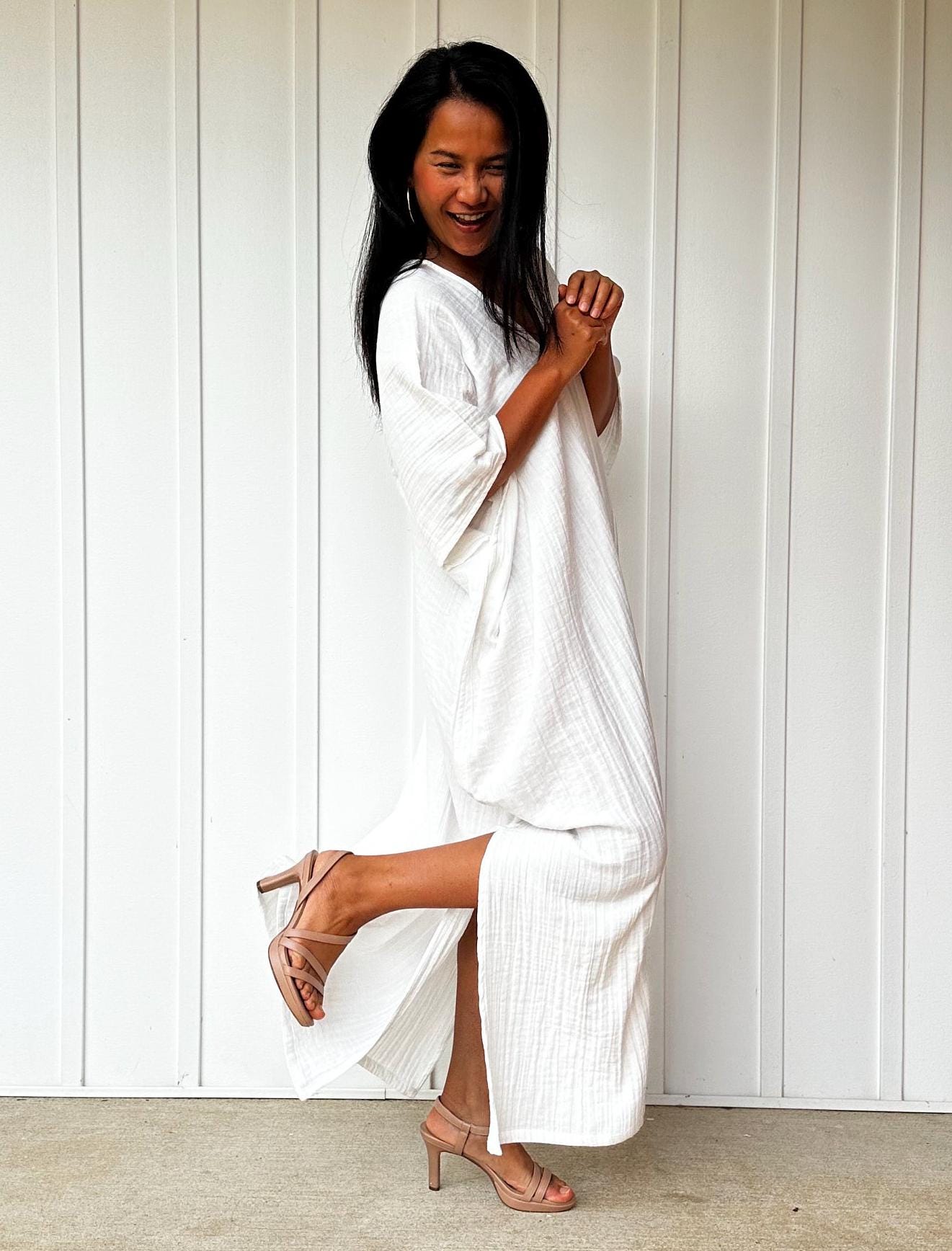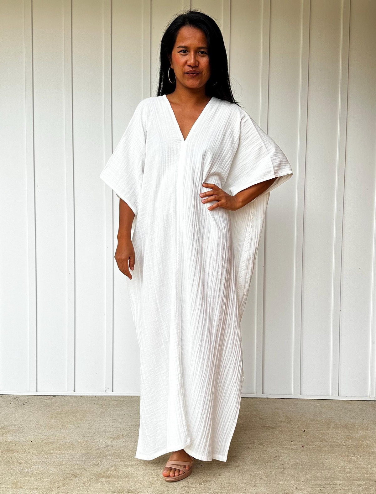 Embrace the gentle waves and sunny shores with our double gauze cotton kaftan. This versatileΒ caftan falls gracefully between the kneesΒ or ankles, depending on the length you choose. It's the ultimate in loungewear for women - perfect as a beach dress or cover up. Crafted from light and airy double gauze cotton, it's your essential for a night on the town, a day by the sea, or just running errands.