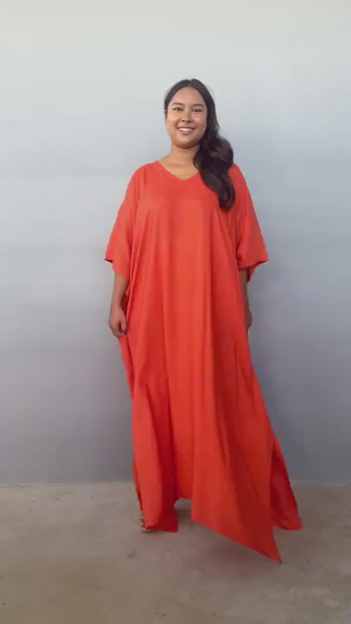 One dress, many moods. Wear Eva in tangerine loose for sculptural flow, add a belt for waist definition, or style with slides and a woven tote for resort ready polish. The V-neck/boat-back combo feels refined yet relaxedβ€”timeless, packable, and endlessly easy.