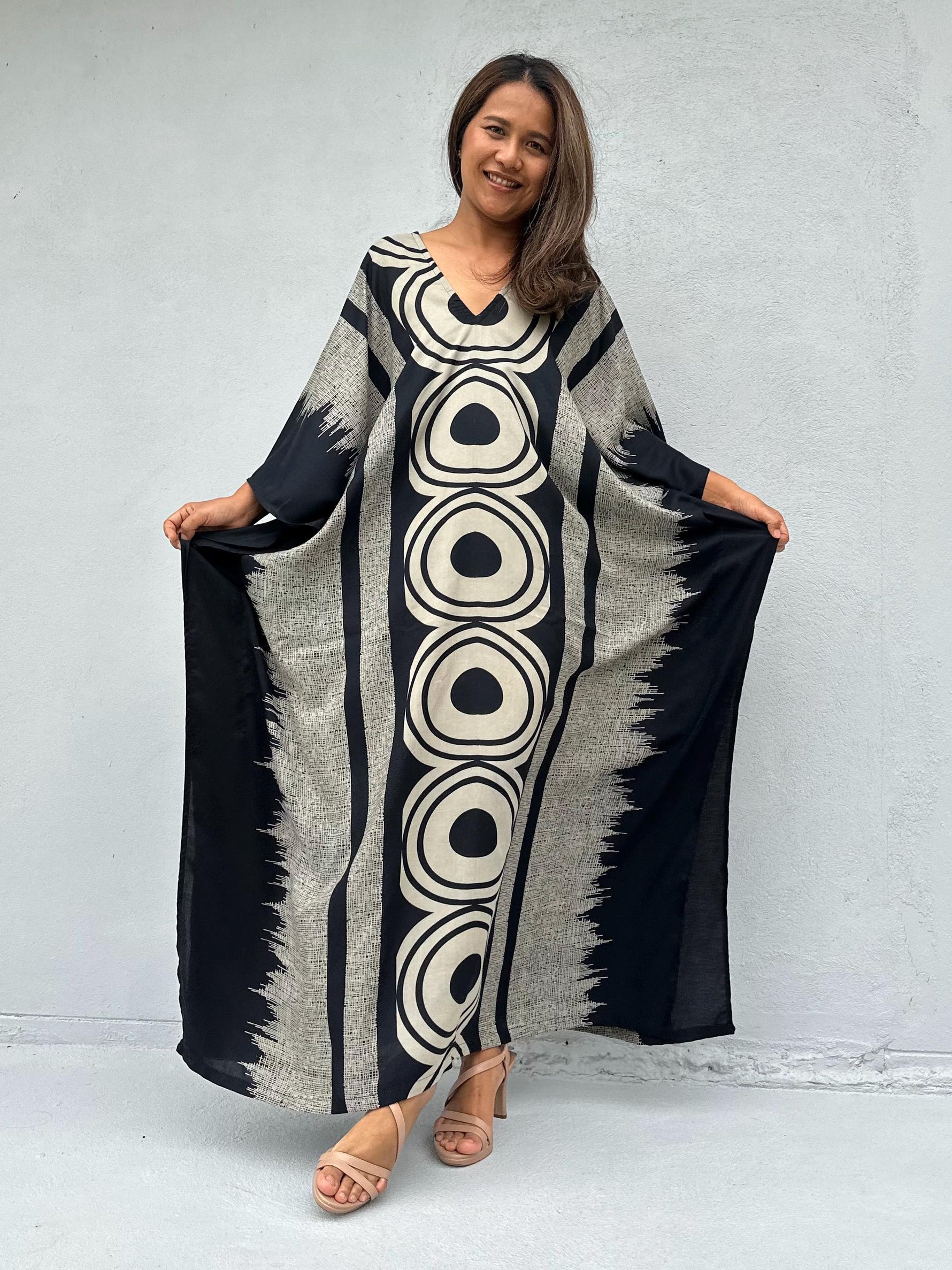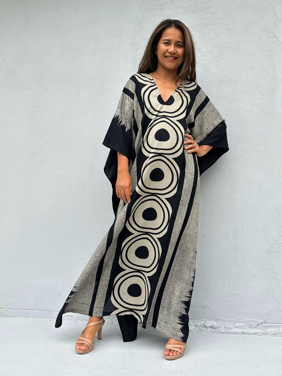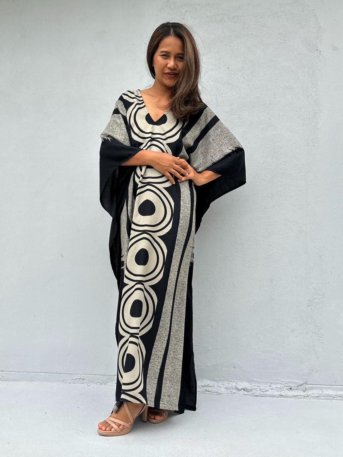 Striking and full of bold energy, the Echoeye handmade kaftan features a hypnotic tribal-inspired motif that radiates rhythm and symmetry.