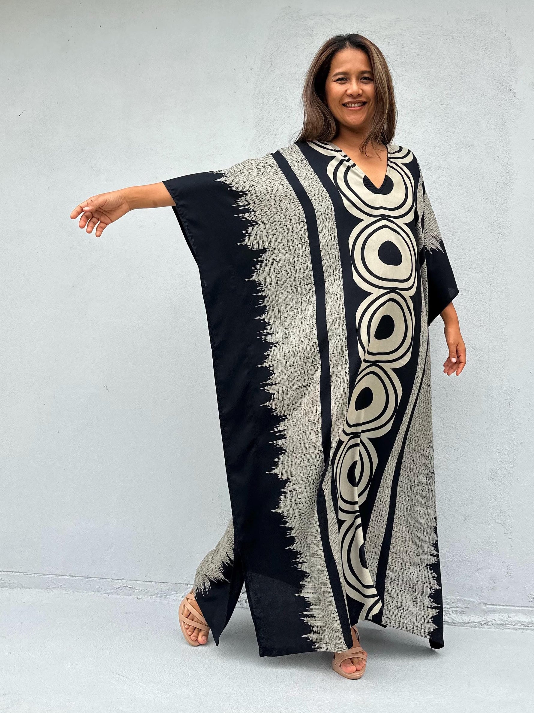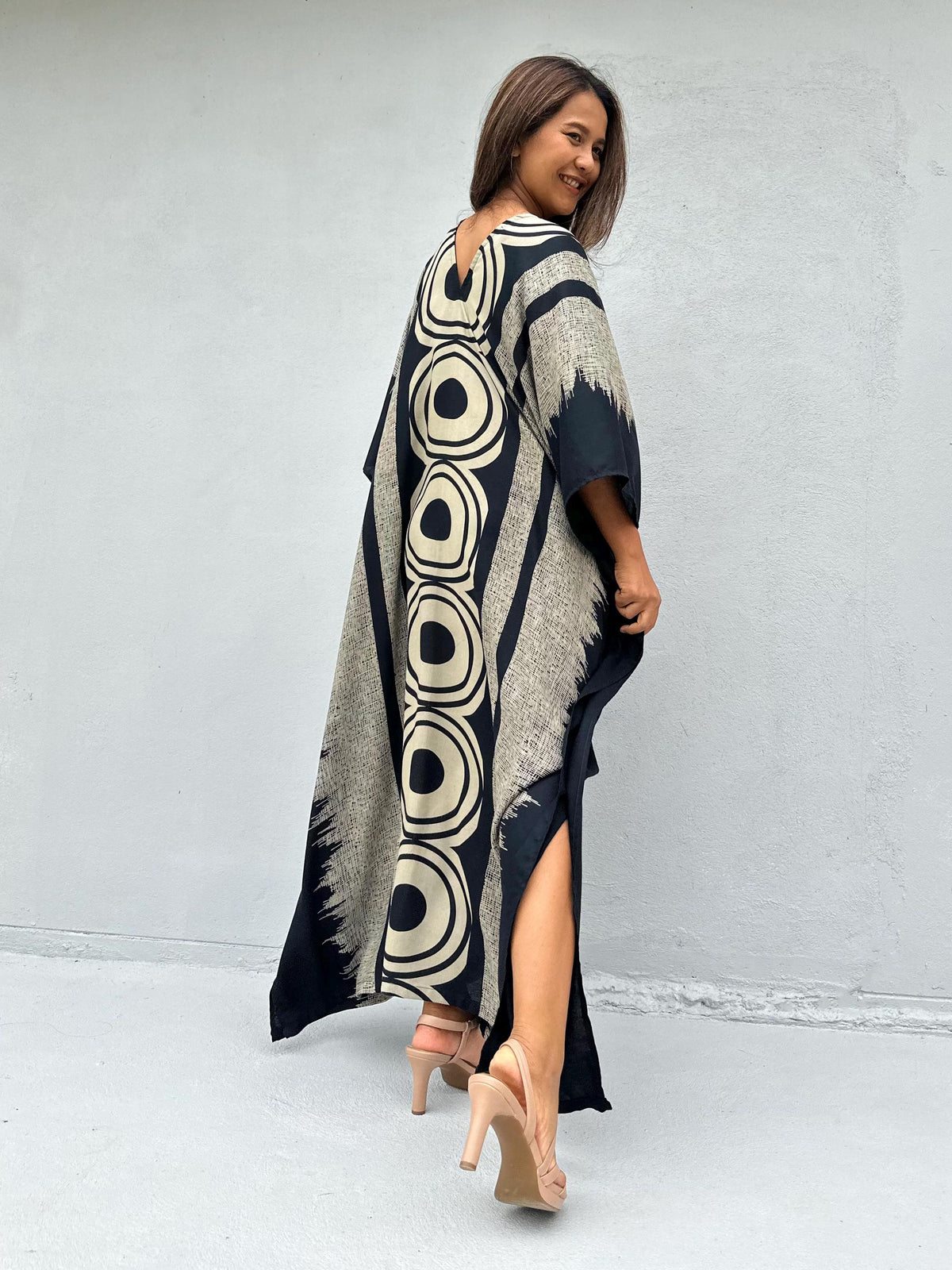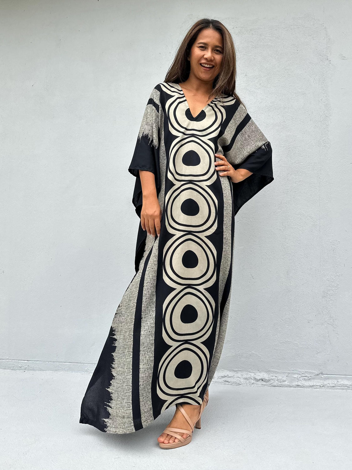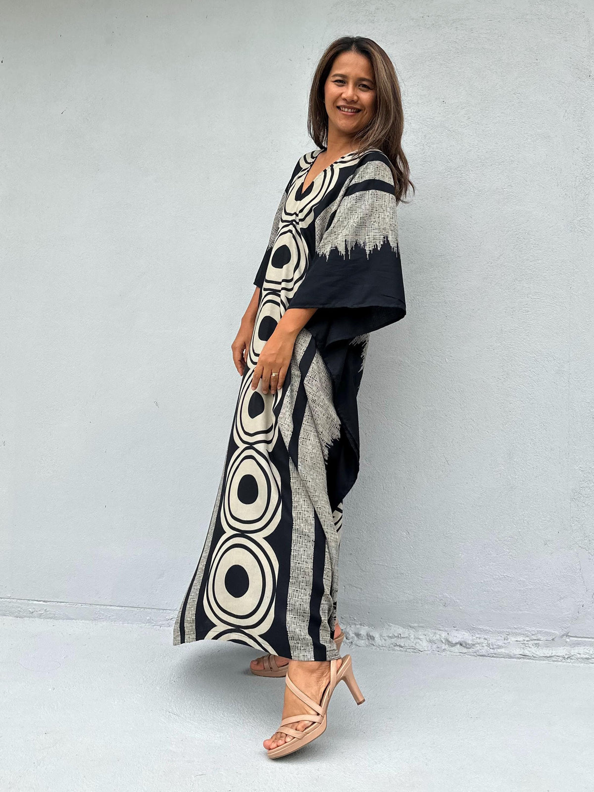 Striking and full of bold energy, the Echoeye handmade kaftan features a hypnotic tribal-inspired motif that radiates rhythm and symmetry.