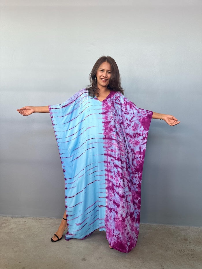 Dive into a world of vibrant color and unique patterns with our tie dye kaftan. Each piece is a masterpiece of individual hand tie-dyeing, ensuring that no two are alike. Crafted with meticulous care and attention, these kaftans offer a burst of style and creativity. Whether you're lounging at home, heading to the beach, or stepping out for an evening on the town, our tie dye kaftan is the perfect choice to make a bold and unforgettable fashion statement. Embrace the artistry and individuality of tie-dye with every wear.