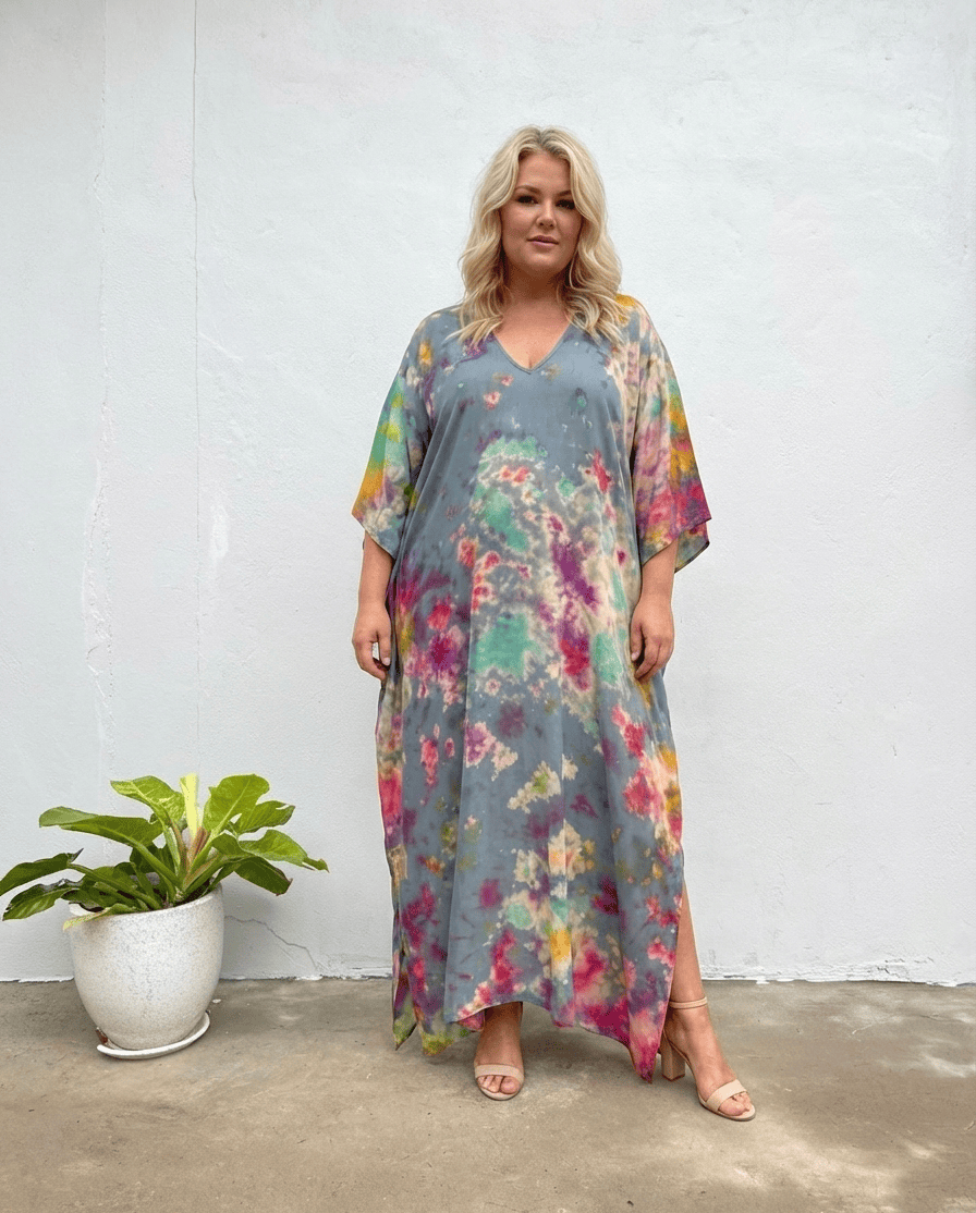 This is the Mala kaftan's generous sister - 37" wide (74" circumference) versus the standard 34" width. The extra room means it drapes beautifully without clinging, hanging loose and flattering on sizes up to 4XL. The gray base with rainbow tie-dye accents brings joy without being too bold; it's sophisticated color-play.