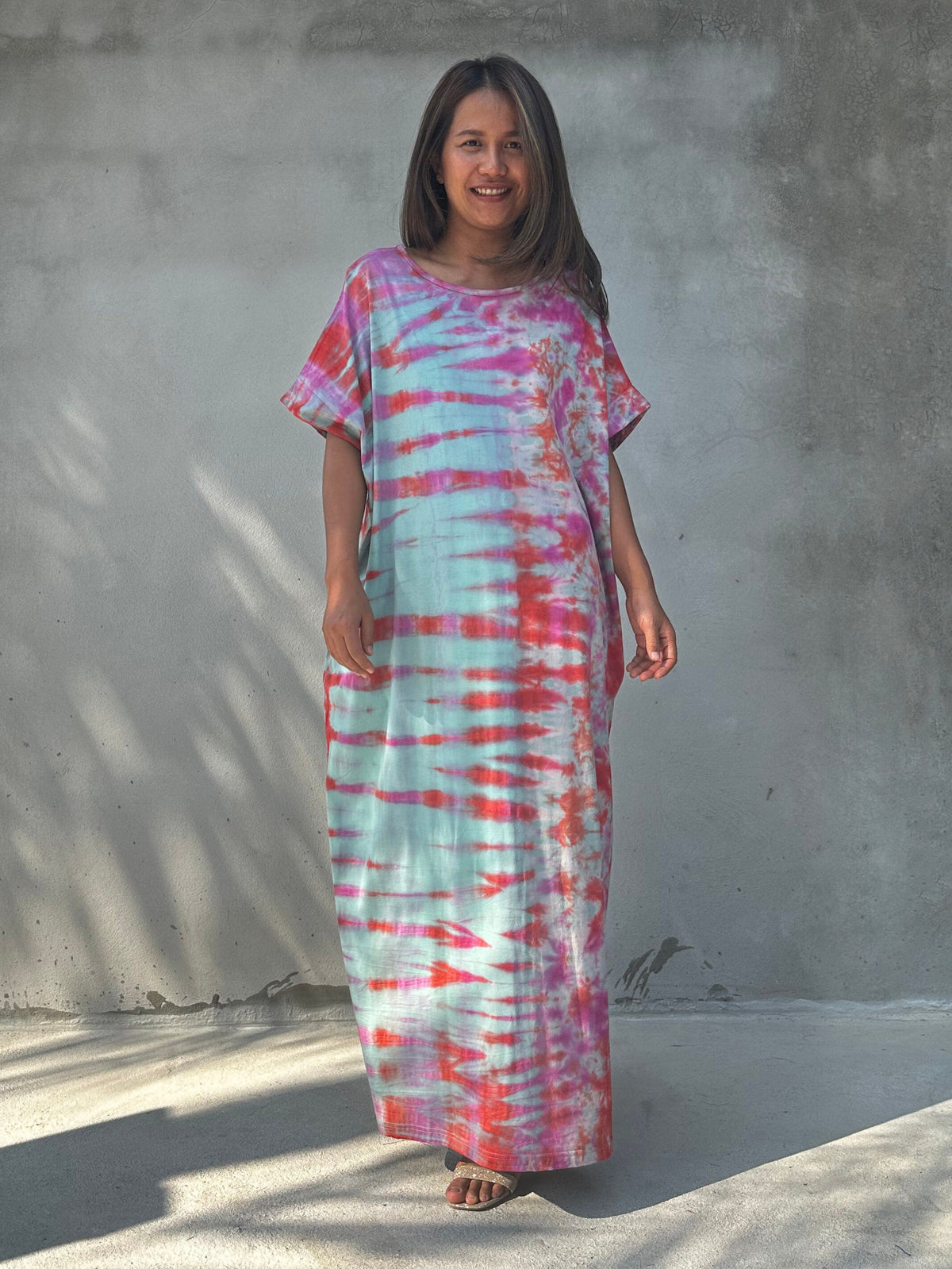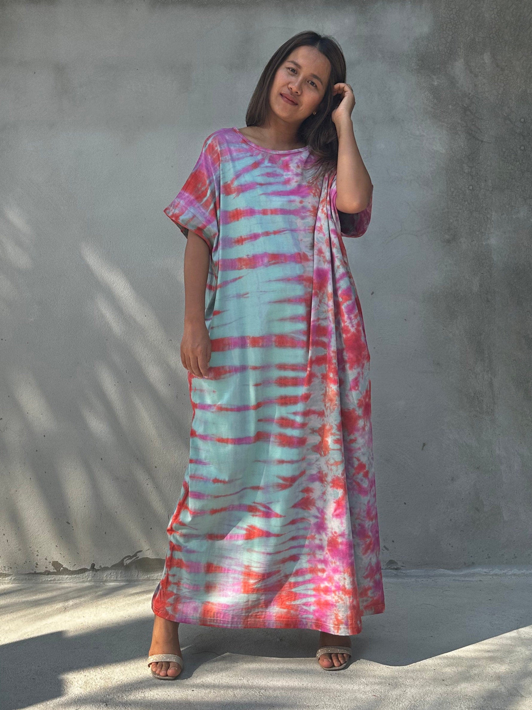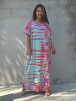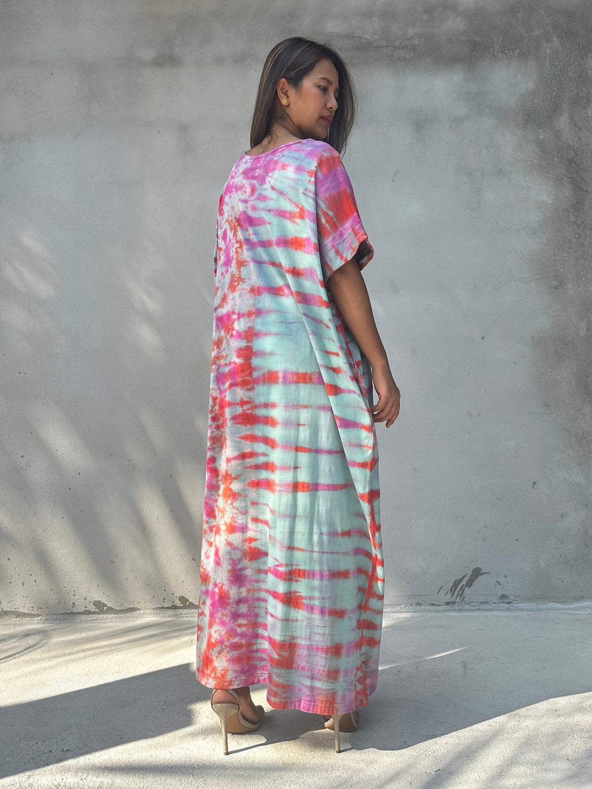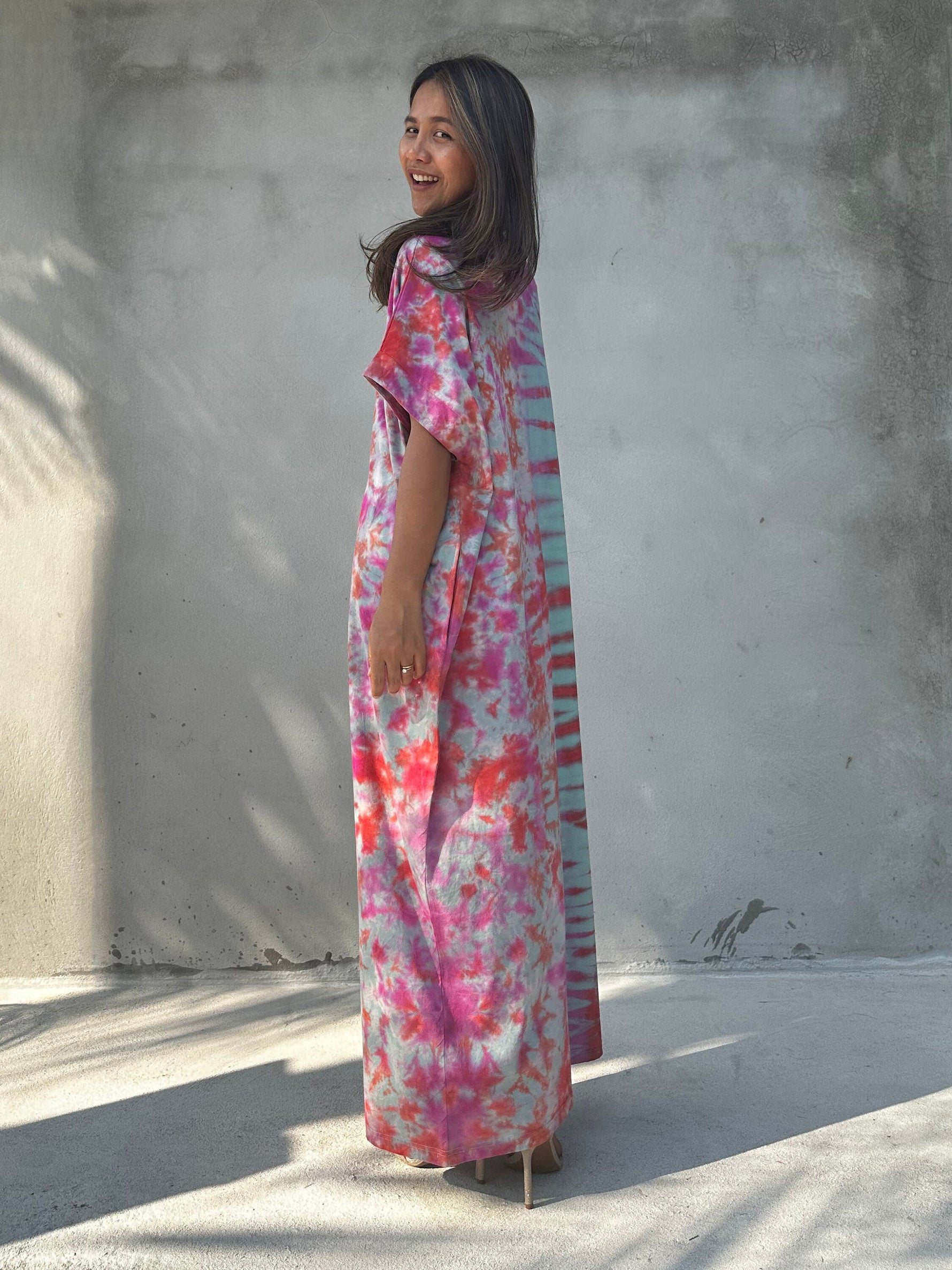 Alice Jersey Cotton Kaftan in Aqua Fuchsia Tidal Tie Dye