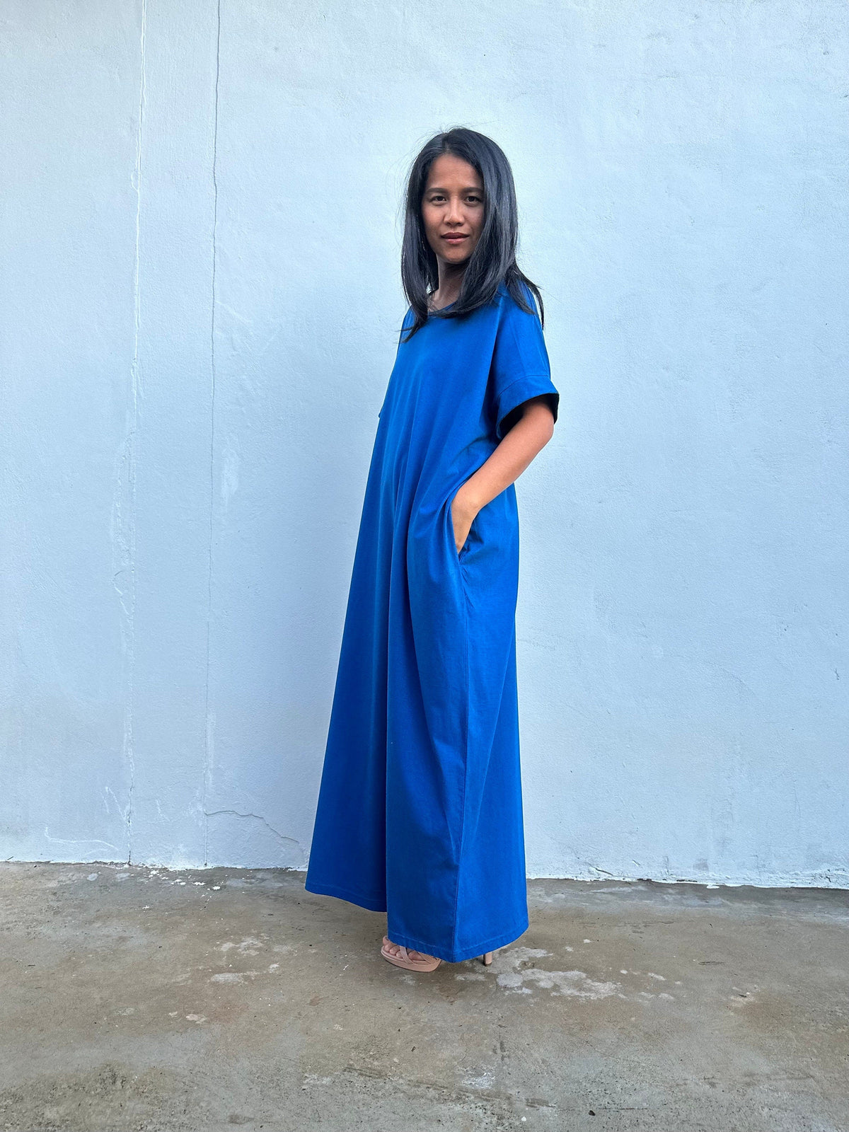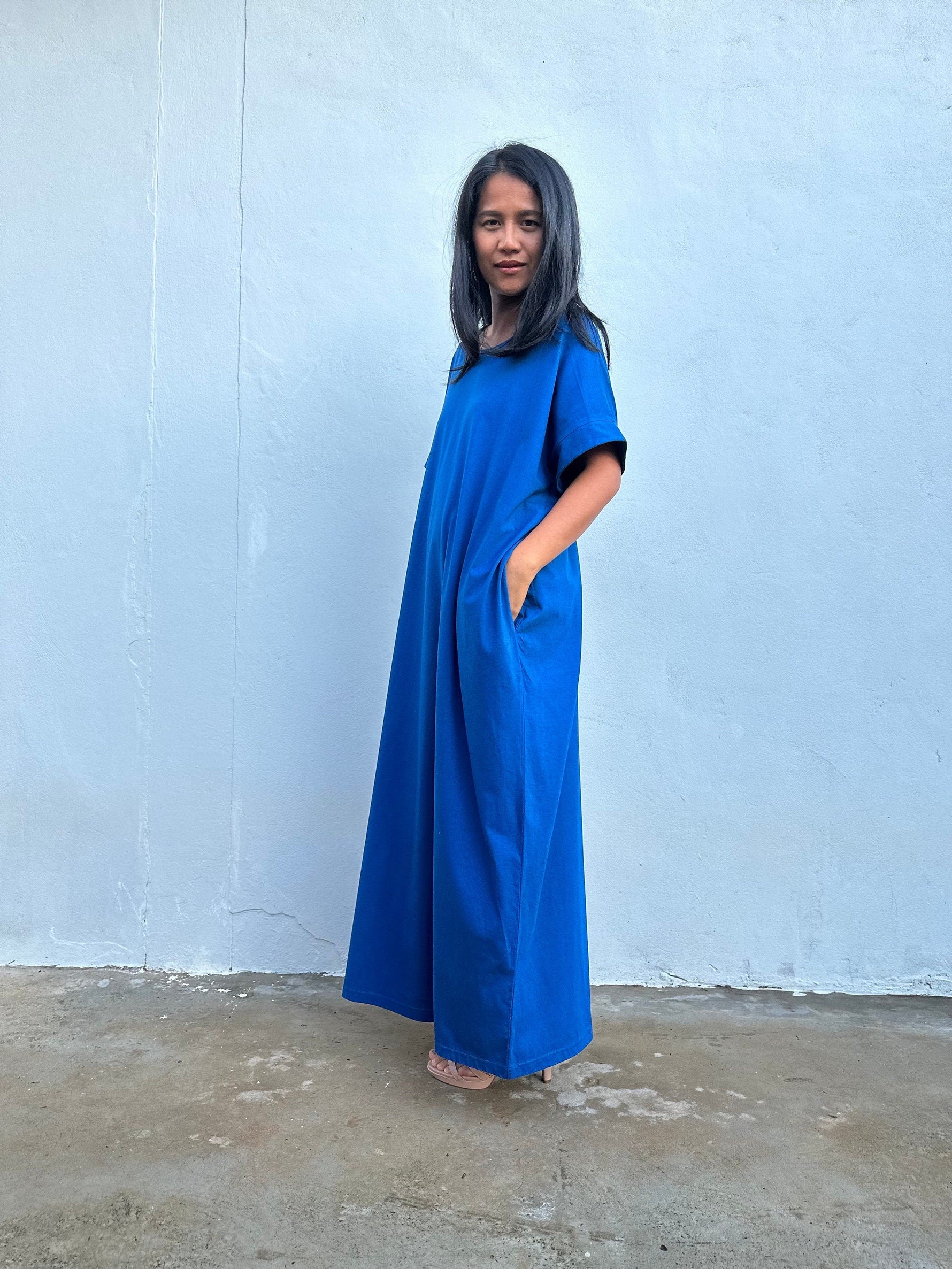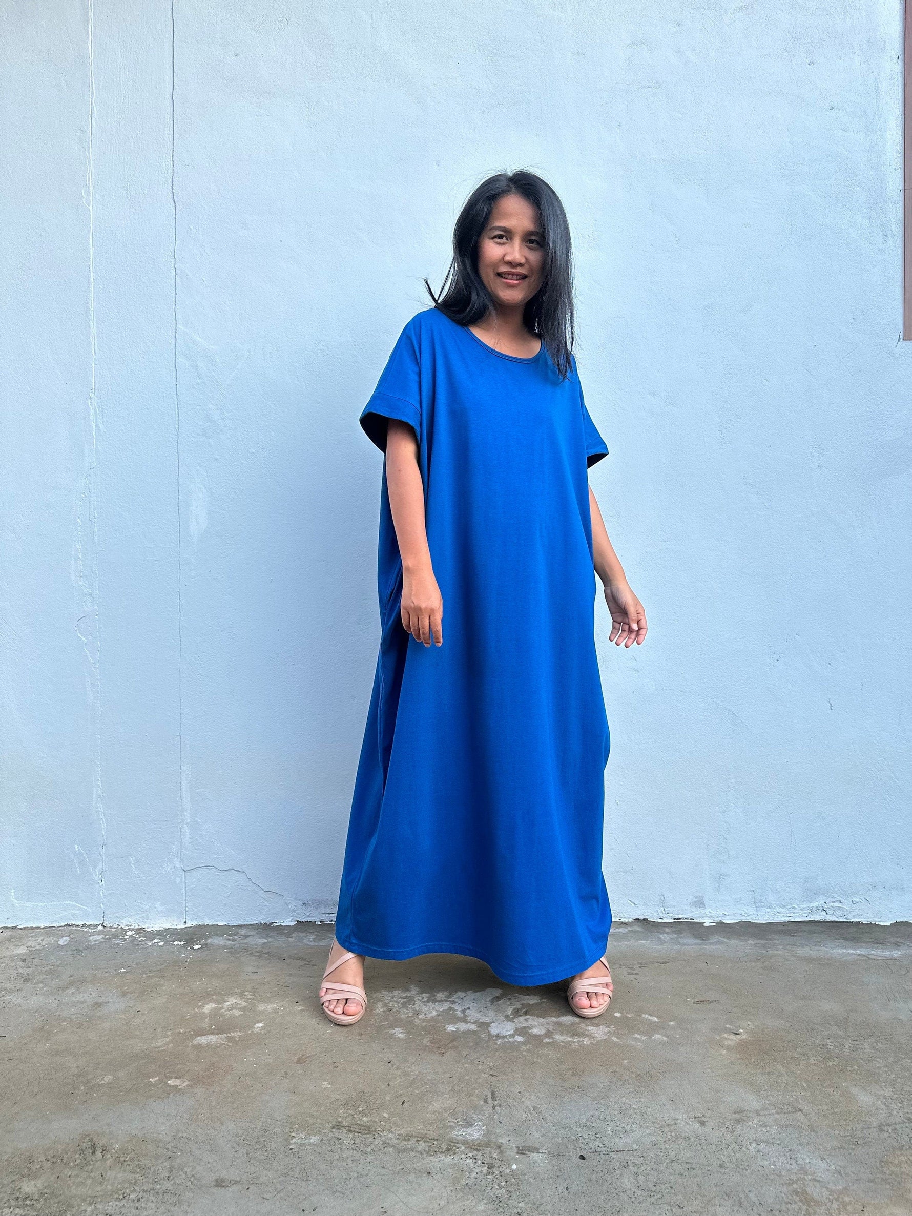 Slip into simplicity. The Alice in cornflower blue pairs thicker, tee-soft jersey cotton with an airy, relaxed cut for all-day comfort. The boat neckline flatters, the slipover design keeps it fuss-free, and two pockets carry your small essentials. With a 52” length and gentle side slits, it moves easily from home to beach to dinner. One size fits most (to US 3XL).
