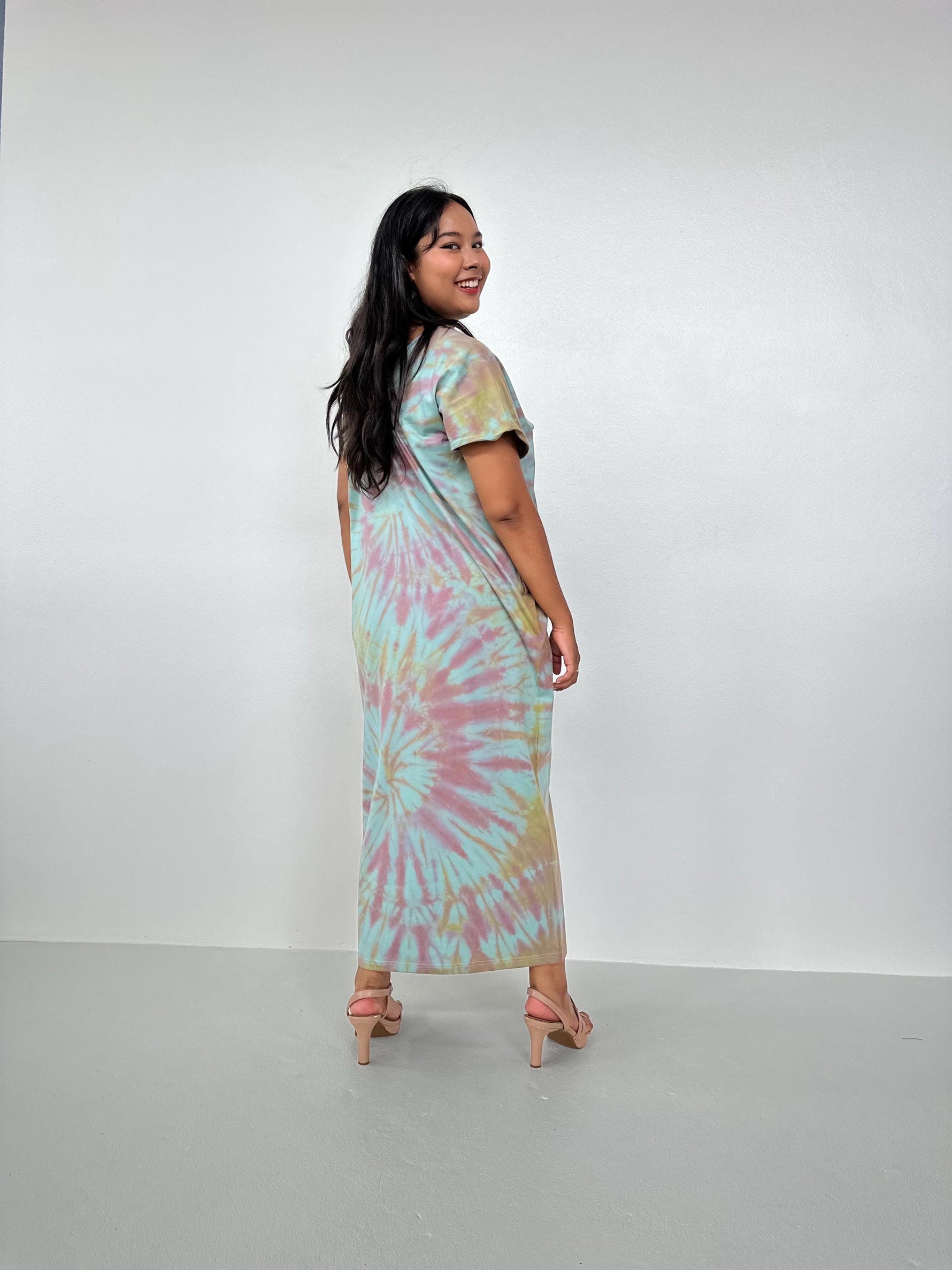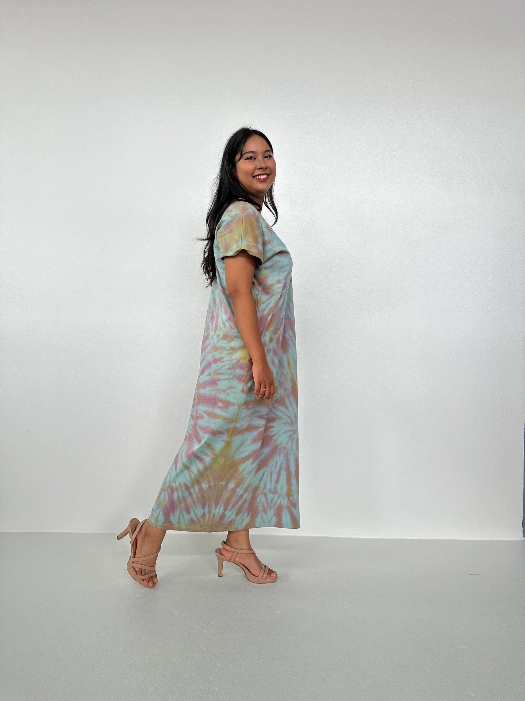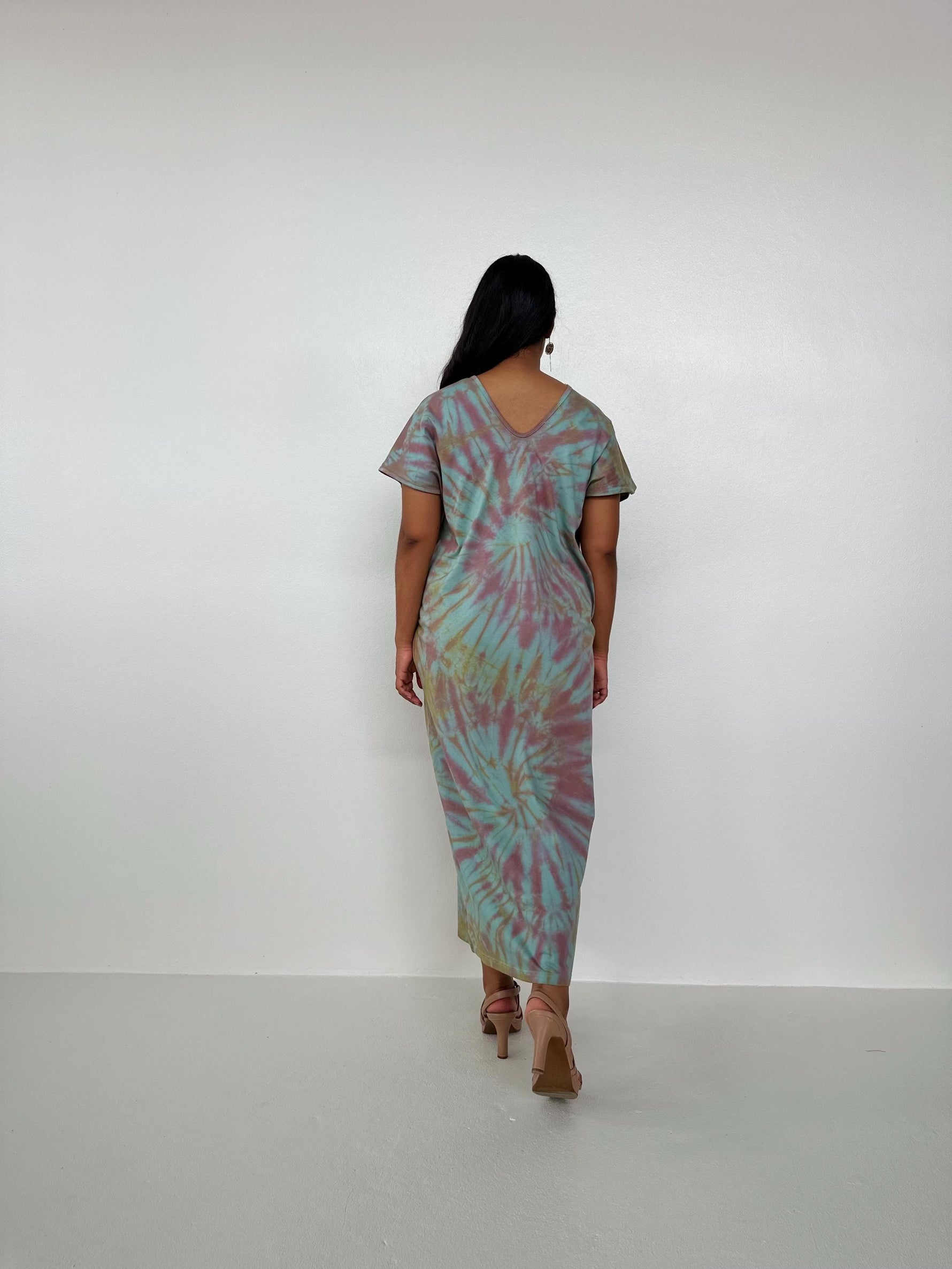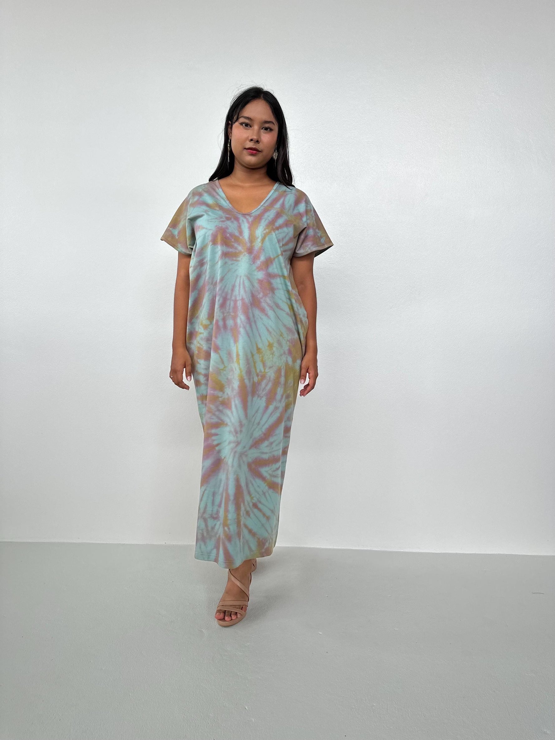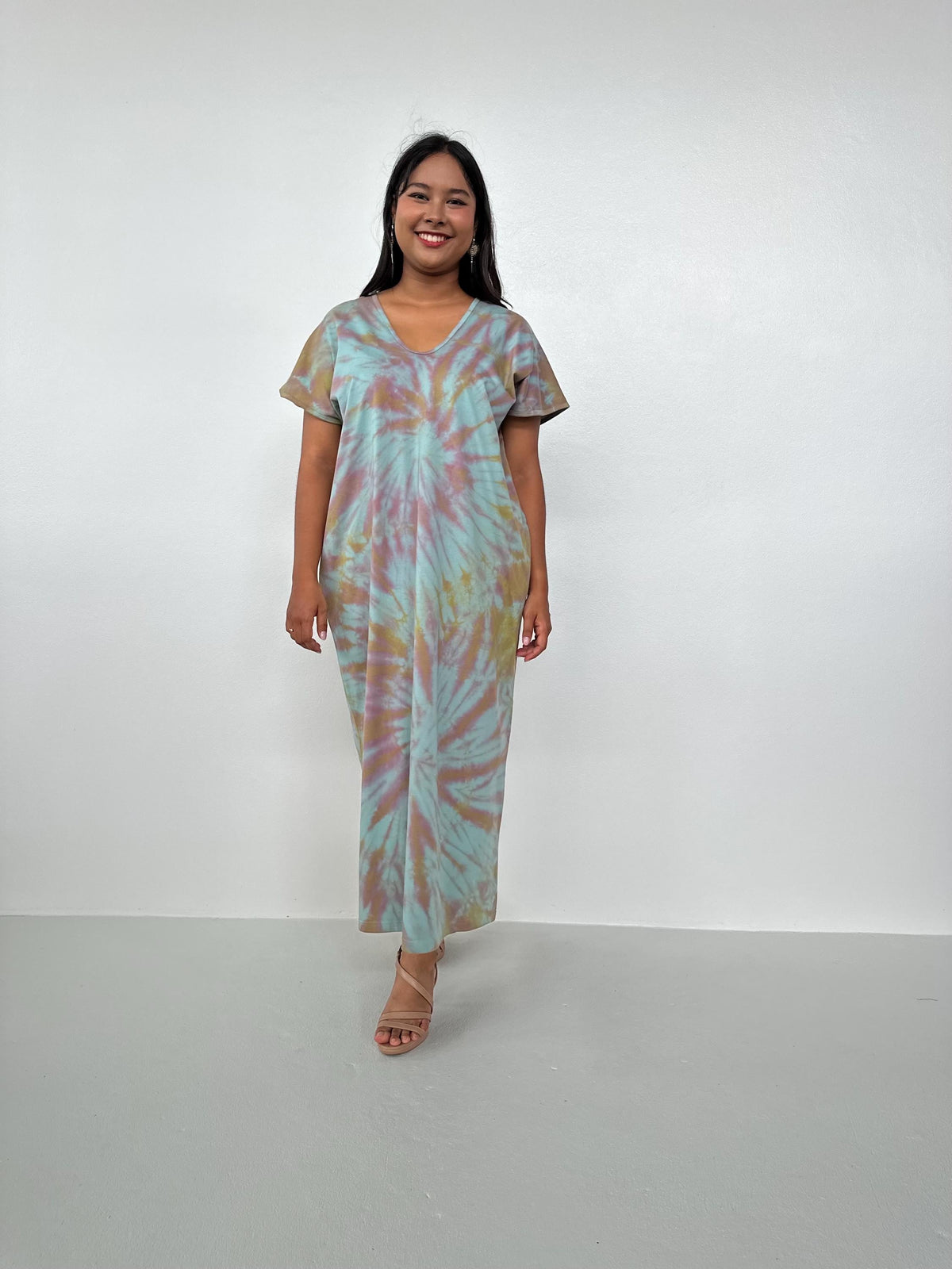 The Alisa Petite tie dye keeps the flow you love, minus excess fabric. Premium jersey cotton drapes cleanly; the tighter circumference ensures a balanced silhouette. In aqua and plum tie dye, every piece is unique. The V neck frames the face while side ease lets you move freely from beach walks to dinner.