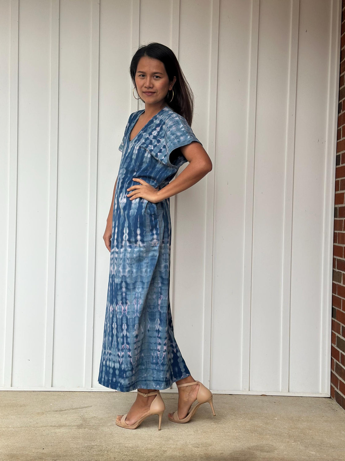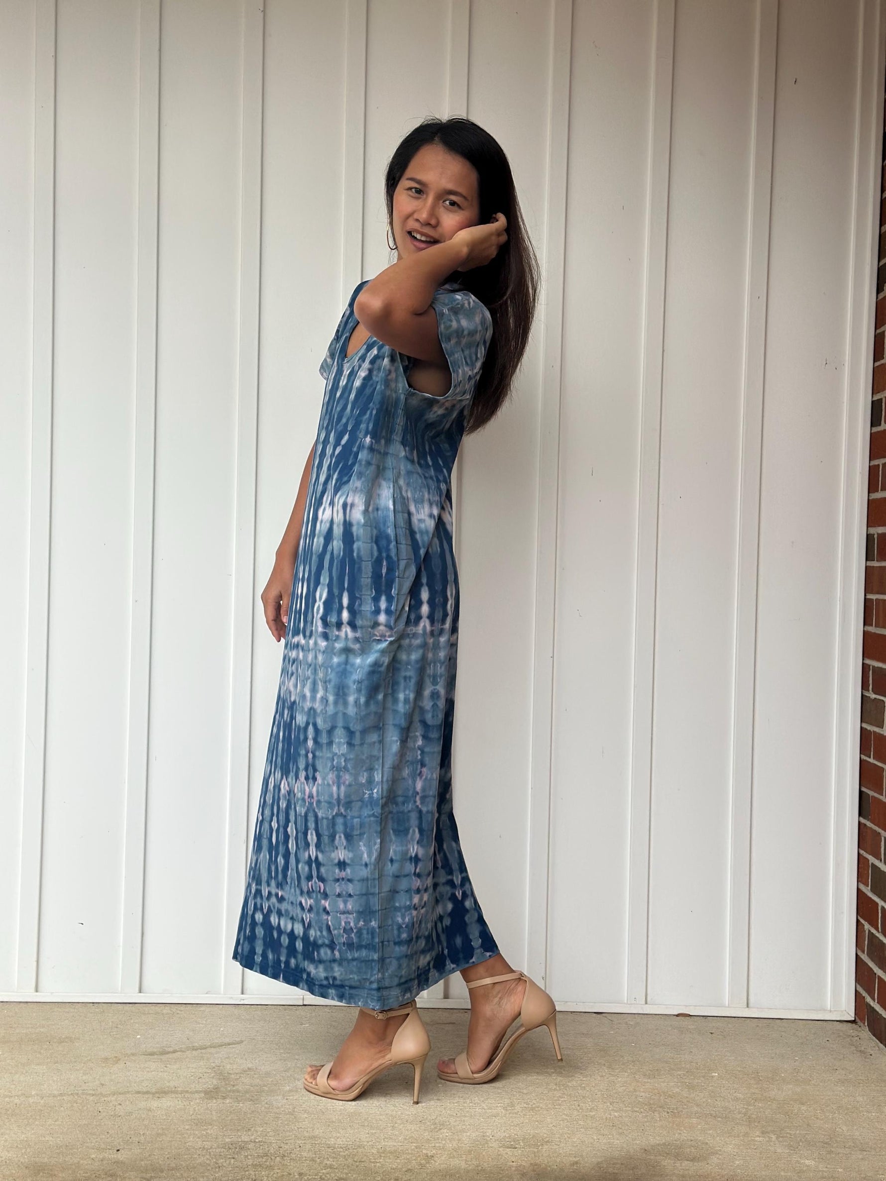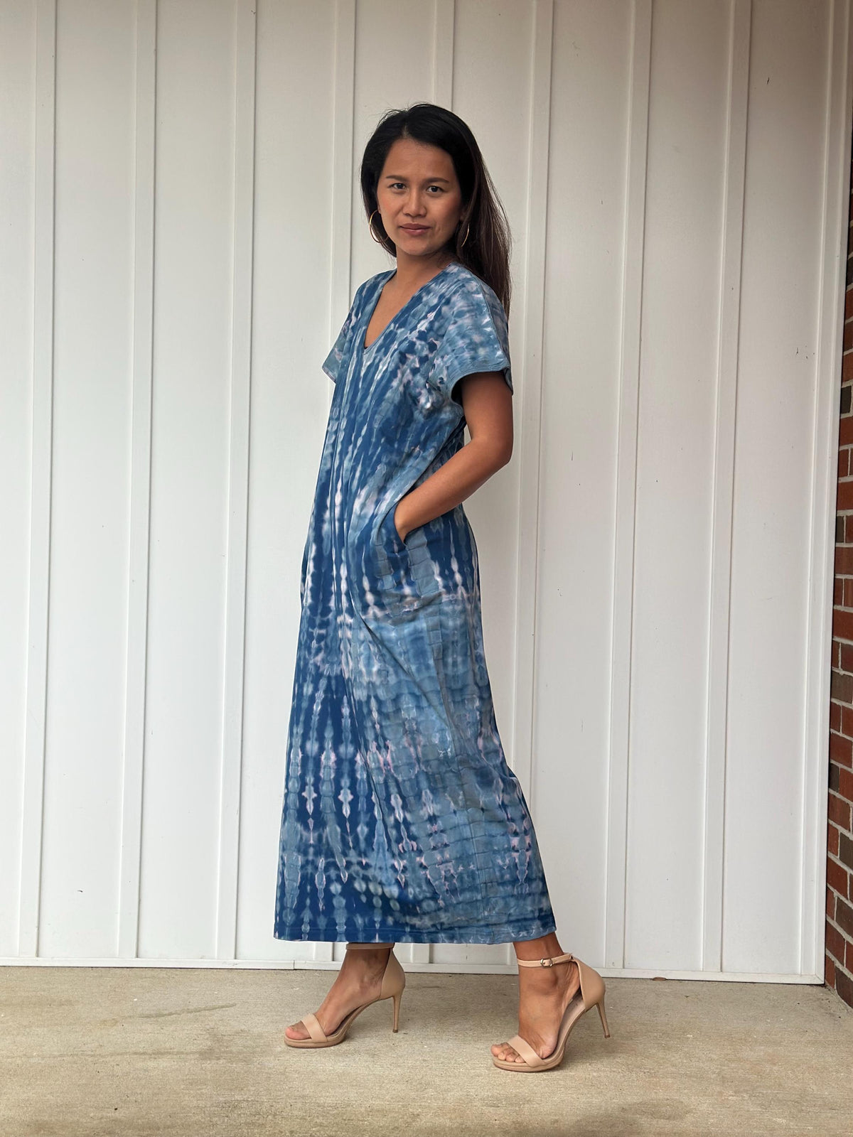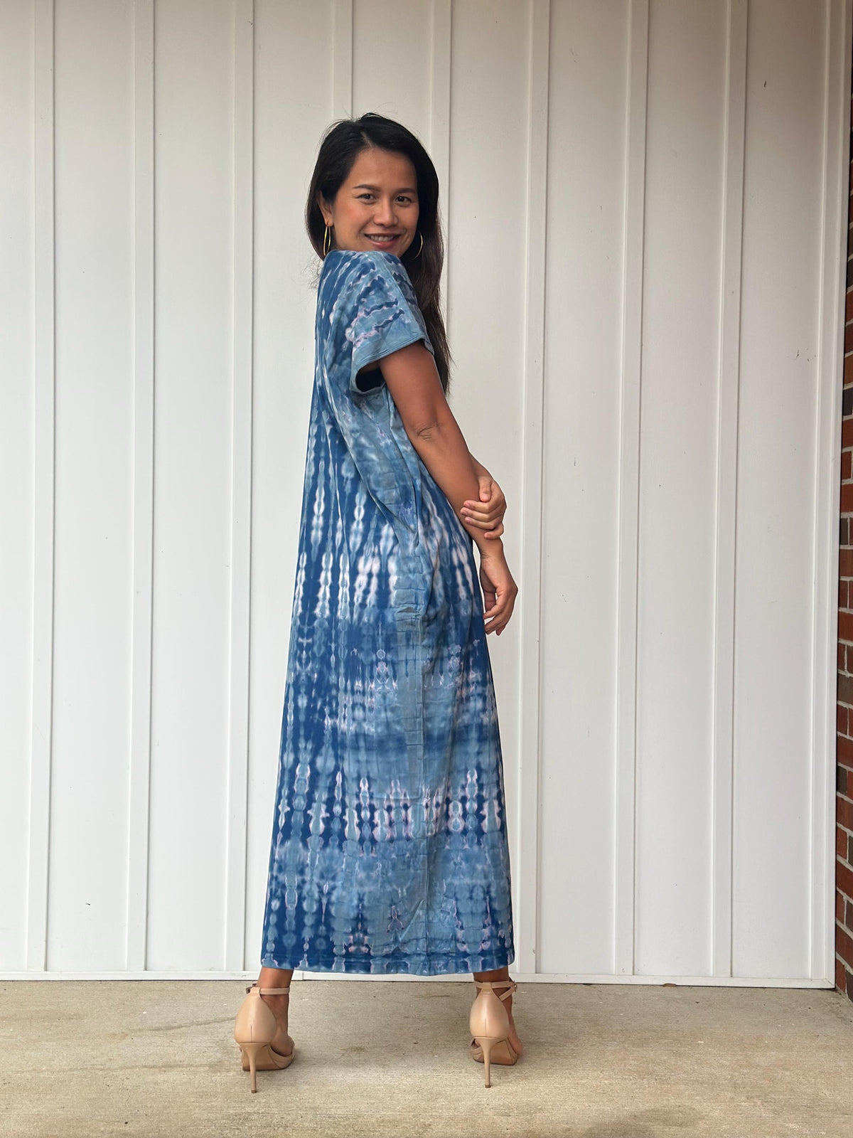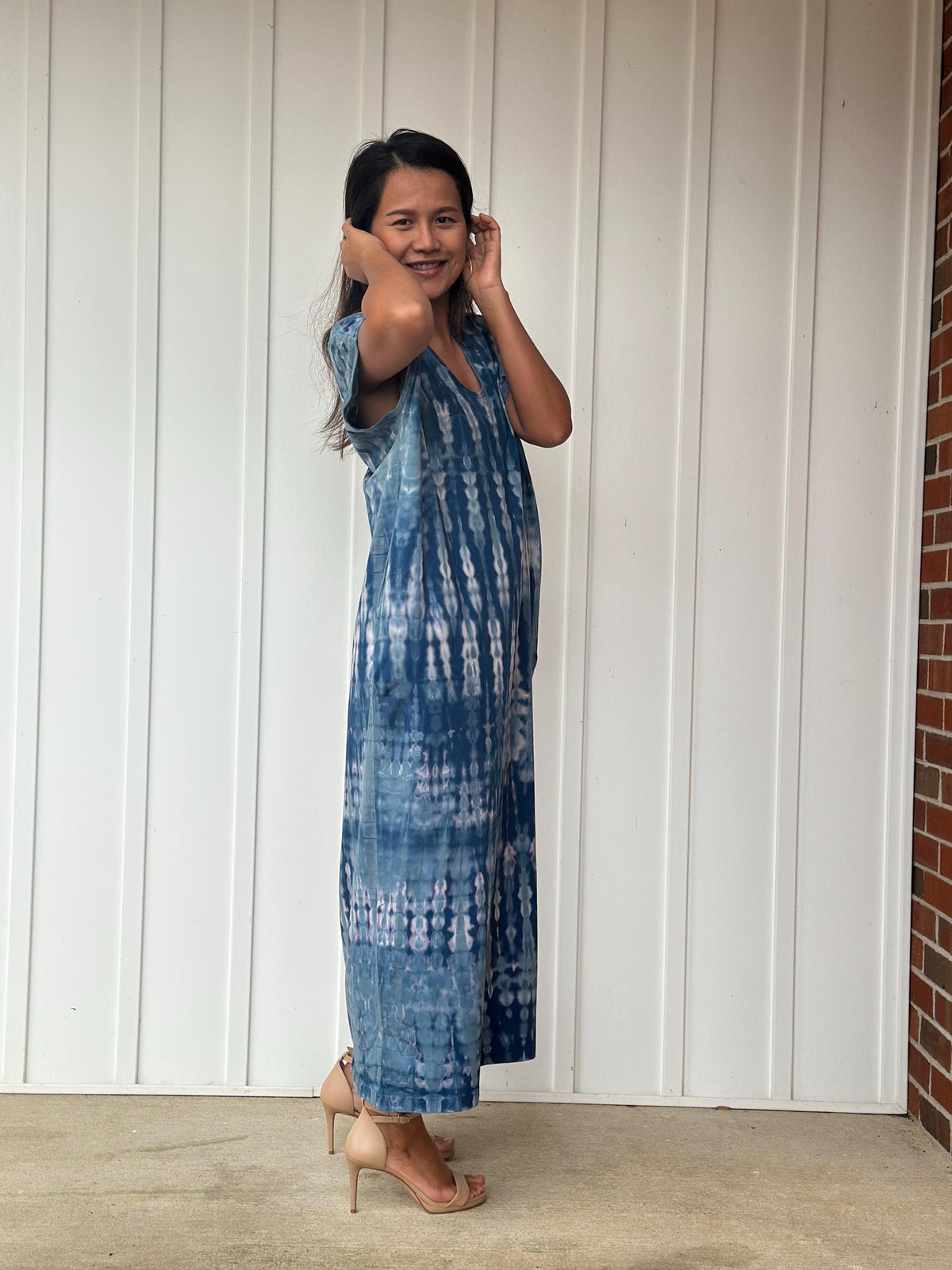 The Alisa Petite tie dye keeps the flow you love, minus excess fabric. Premium jersey cotton drapes cleanly; the tighter circumference ensures a balanced silhouette. In azure tie dye, every piece is unique. The V neck frames the face while side ease lets you move freely from beach walks to dinner.