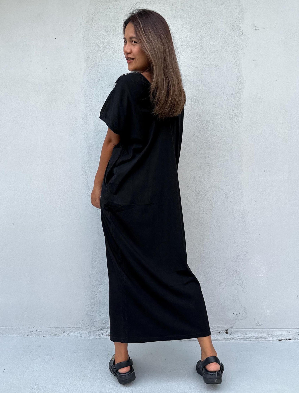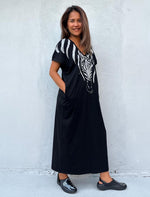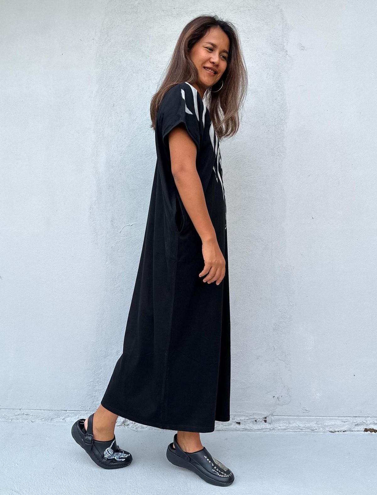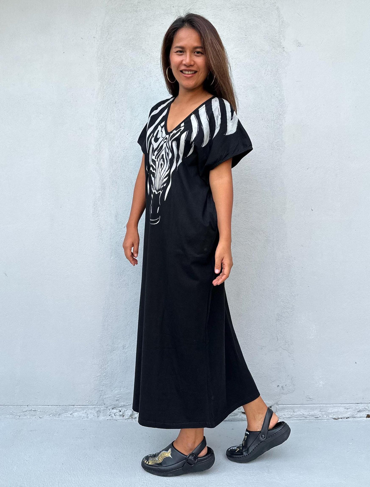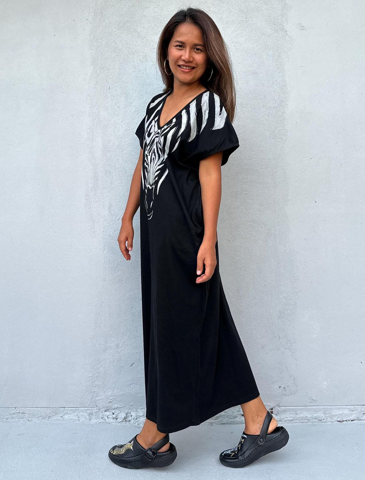 Alisa Petite Cotton Kaftan in Black with Hand-Painted Zebra Design