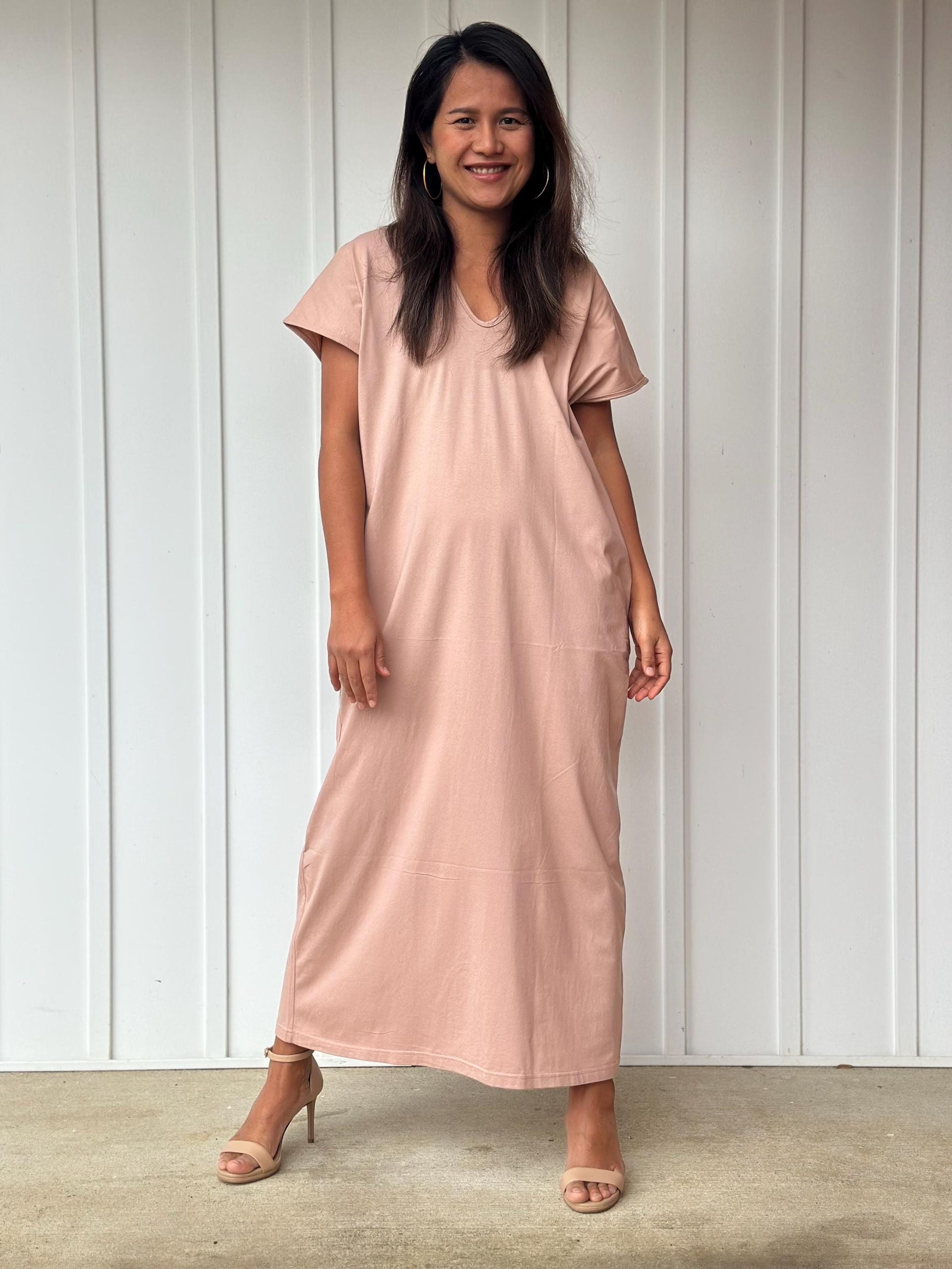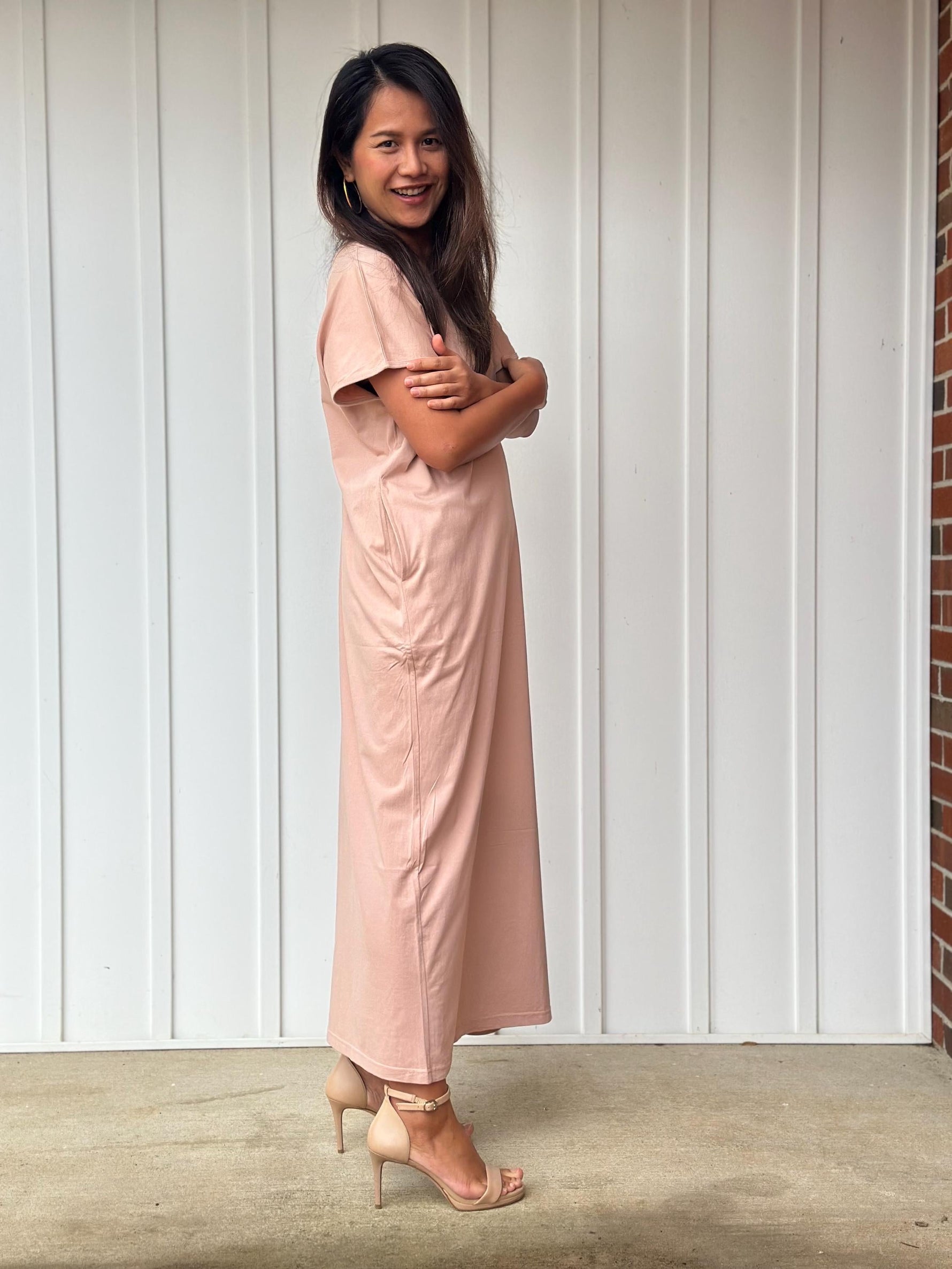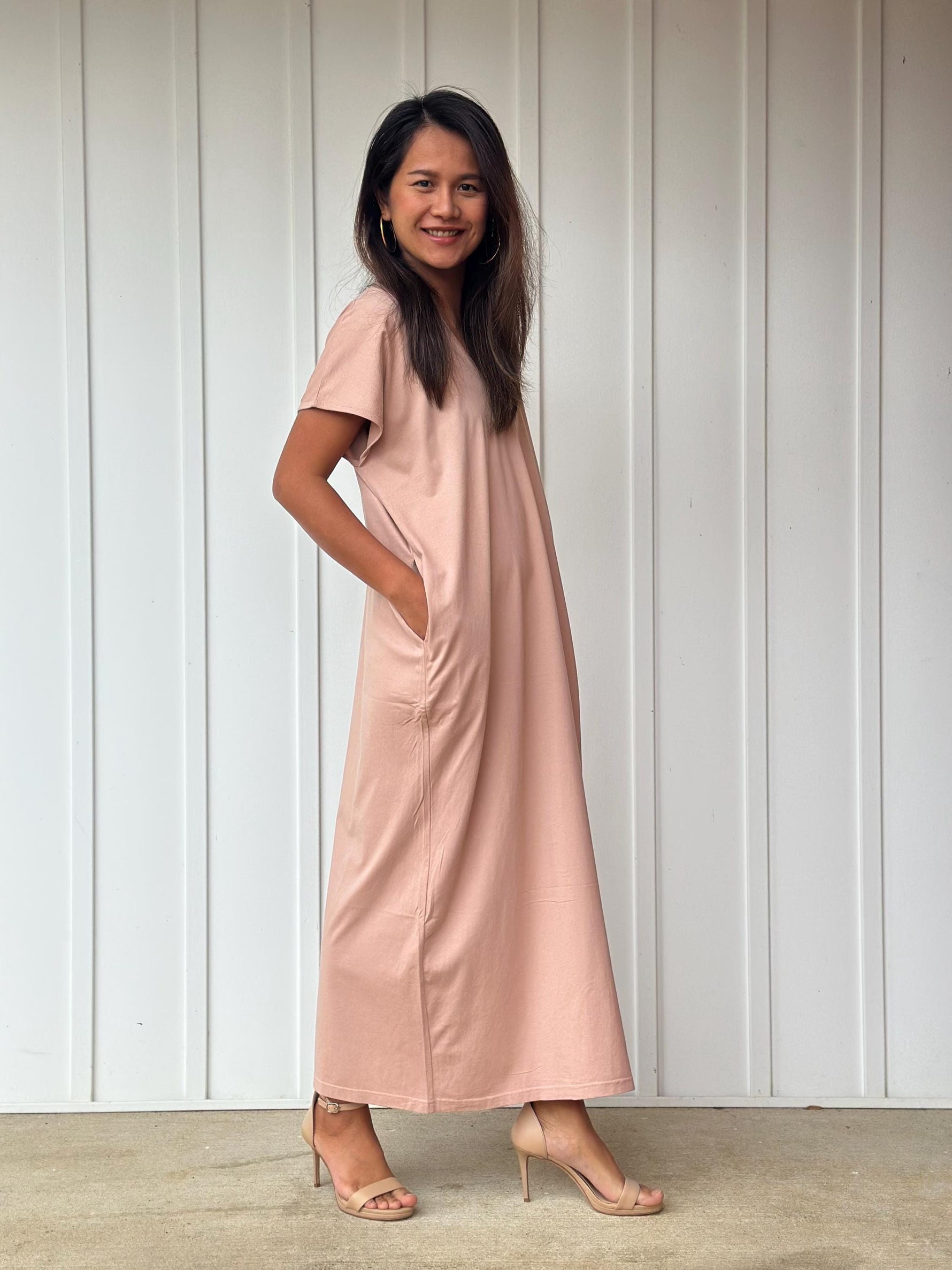 Soft yet substantial, our high-quality jersey cotton gives Alisa its smooth hand and structured flow. The petite-minded circumference fights closer to the body balancing ease with polish, while the V neck frames your shoulders. In peach, it’s a capsule staple. Layer over a slip, add sandals, or belt for shape. Comfort, proportion, and versatility in one.
