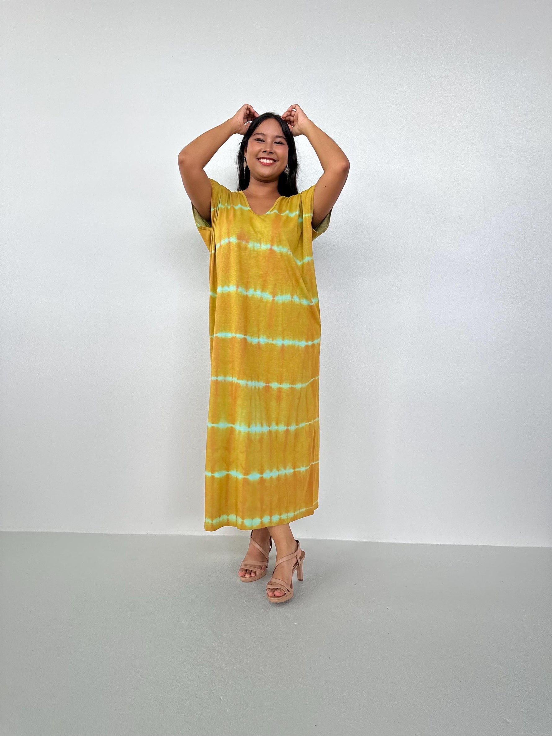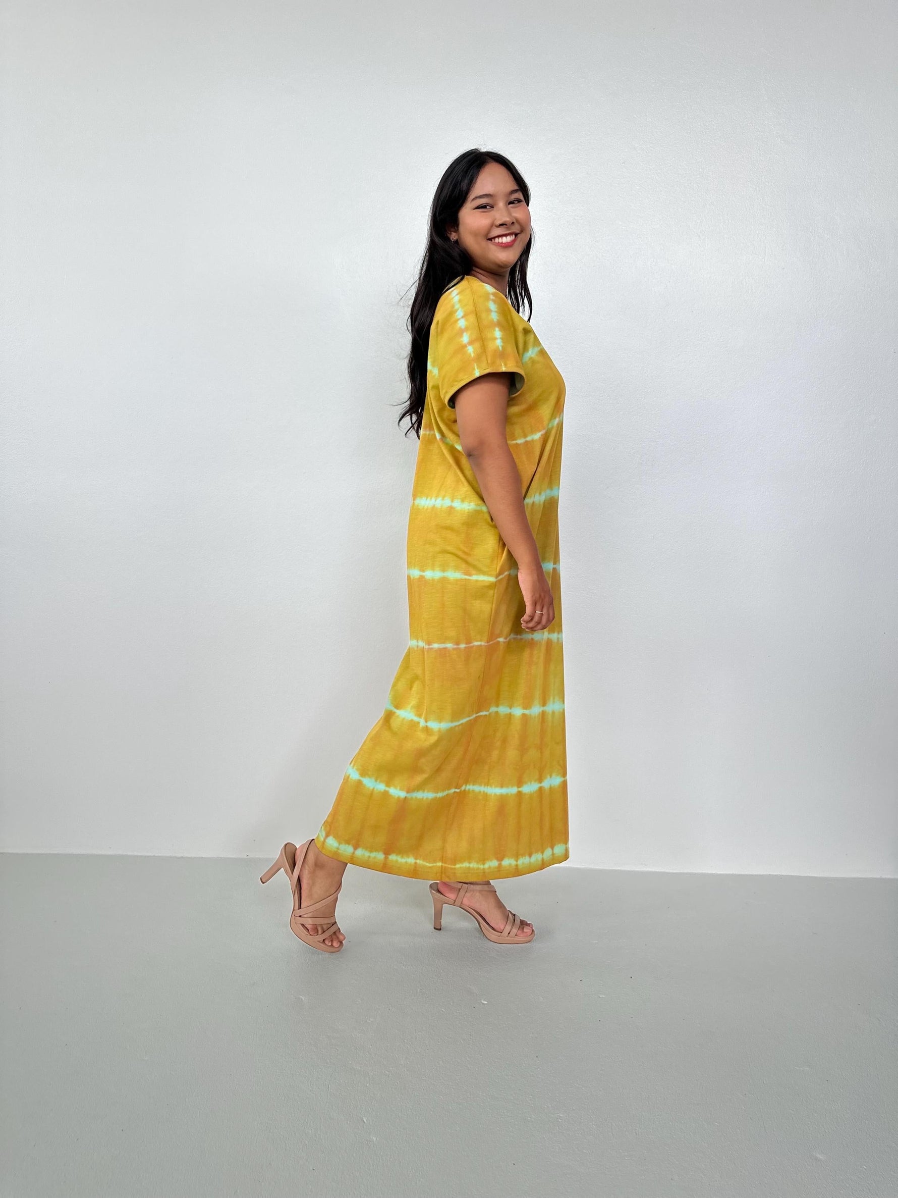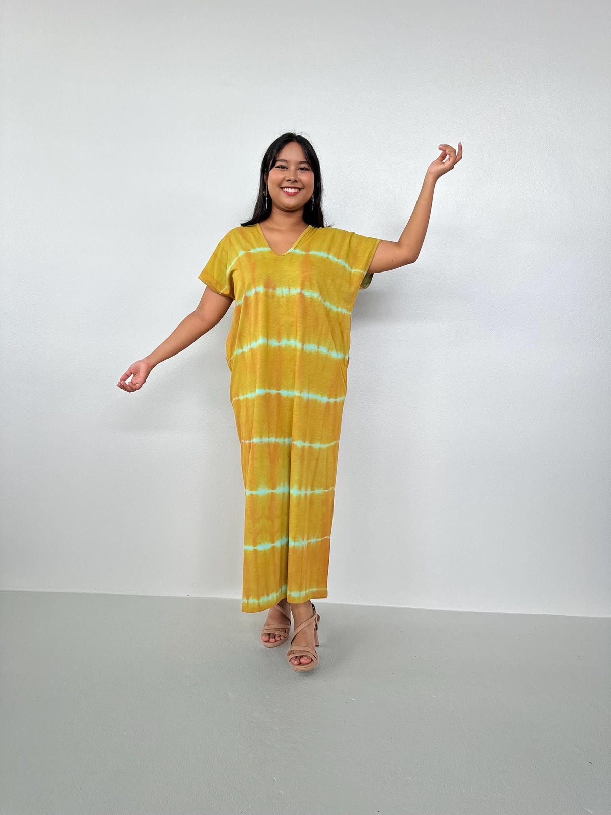 The Alisa Petite tie dye keeps the flow you love, minus excess fabric. Premium jersey cotton drapes cleanly; the tighter circumference ensures a balanced silhouette. In yellow tie dye, every piece is unique. The V neck frames the face while side ease lets you move freely from beach walks to dinner.