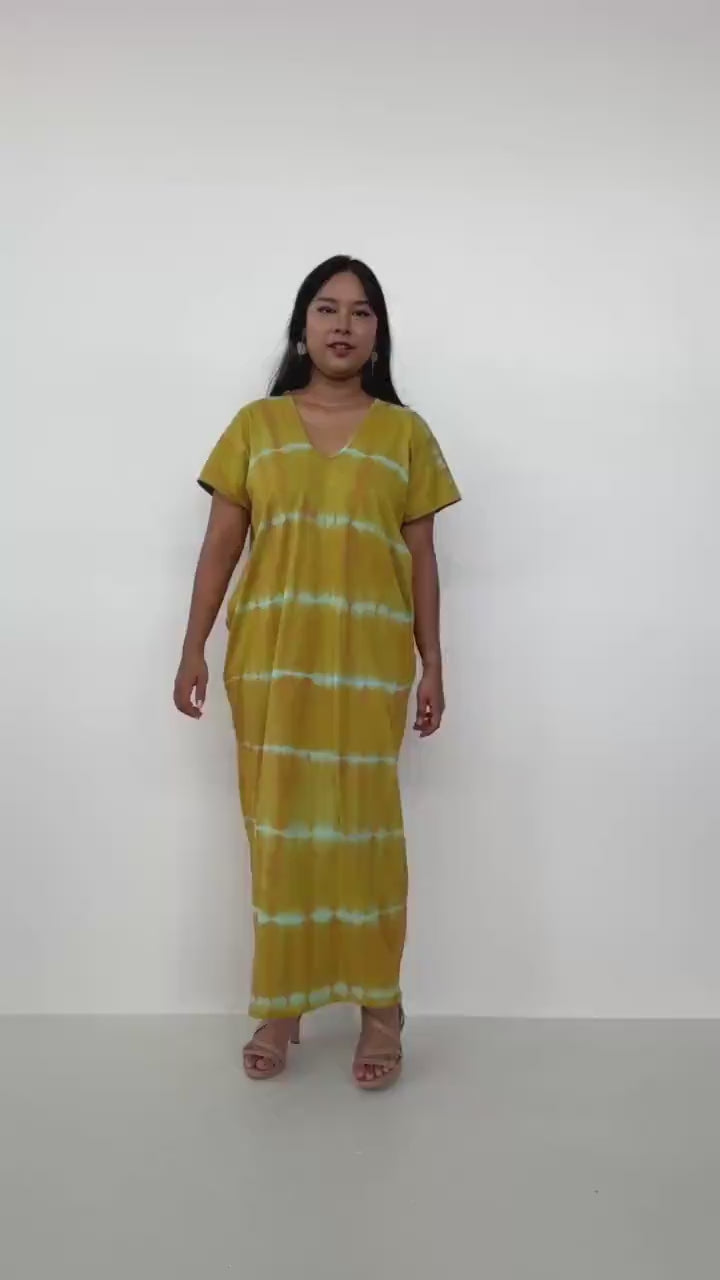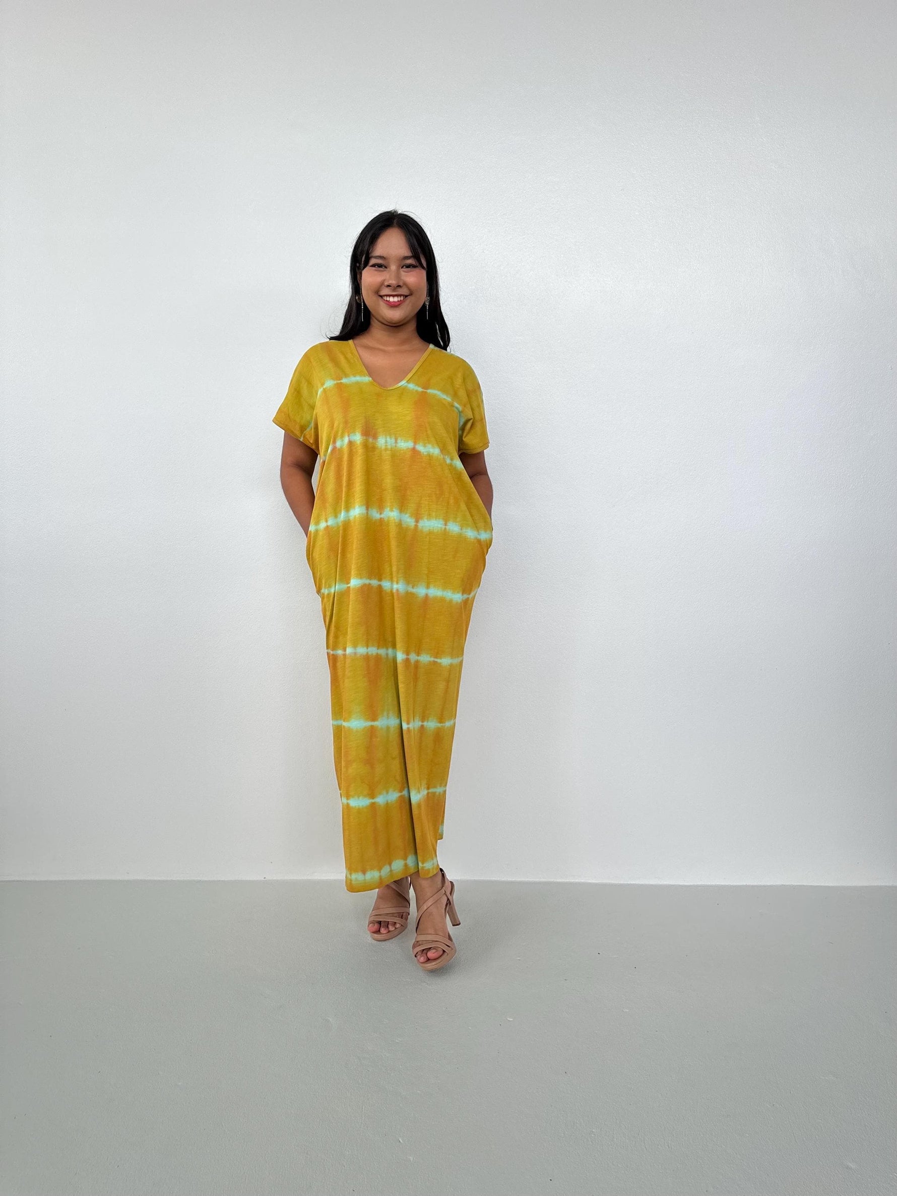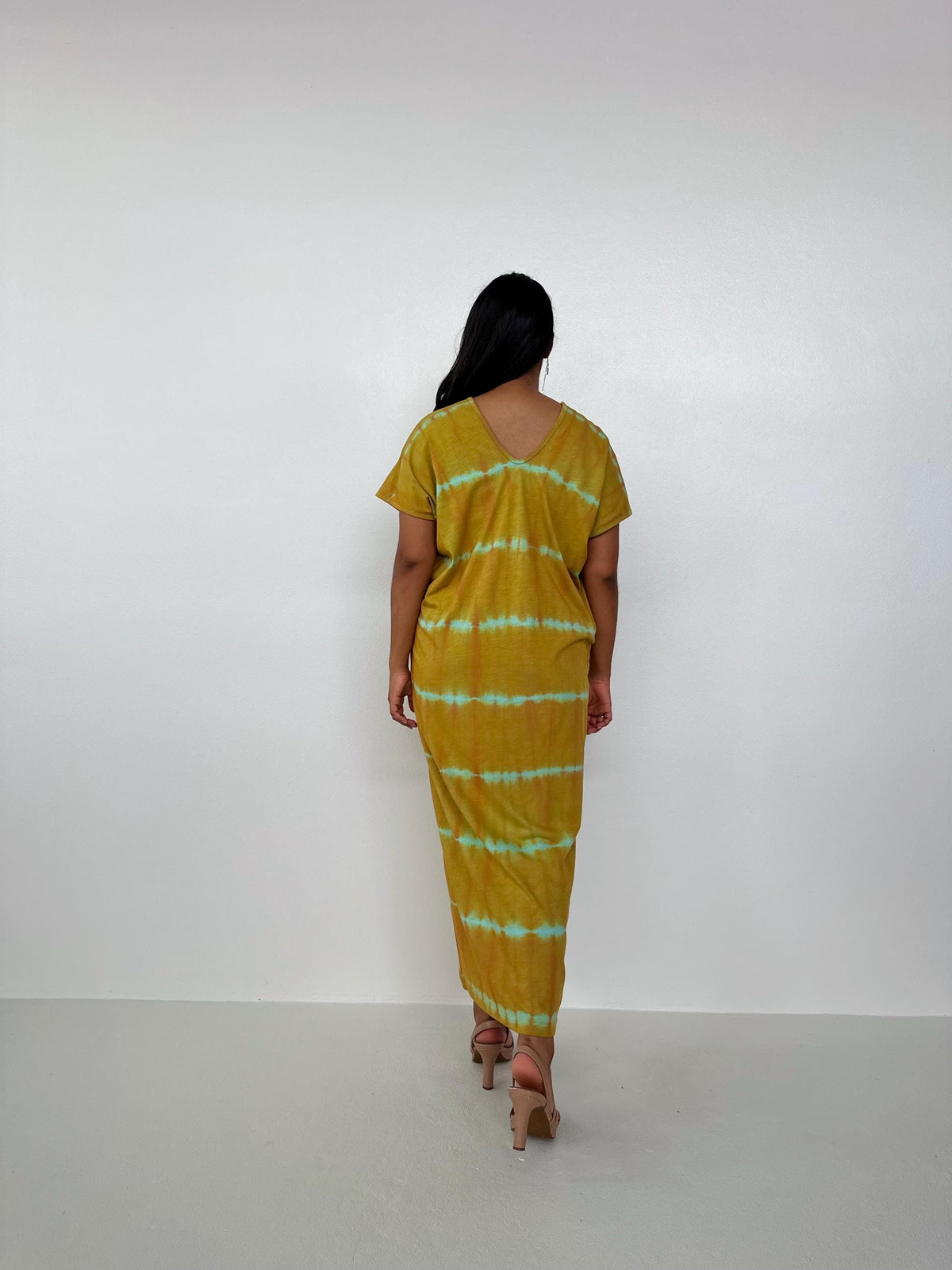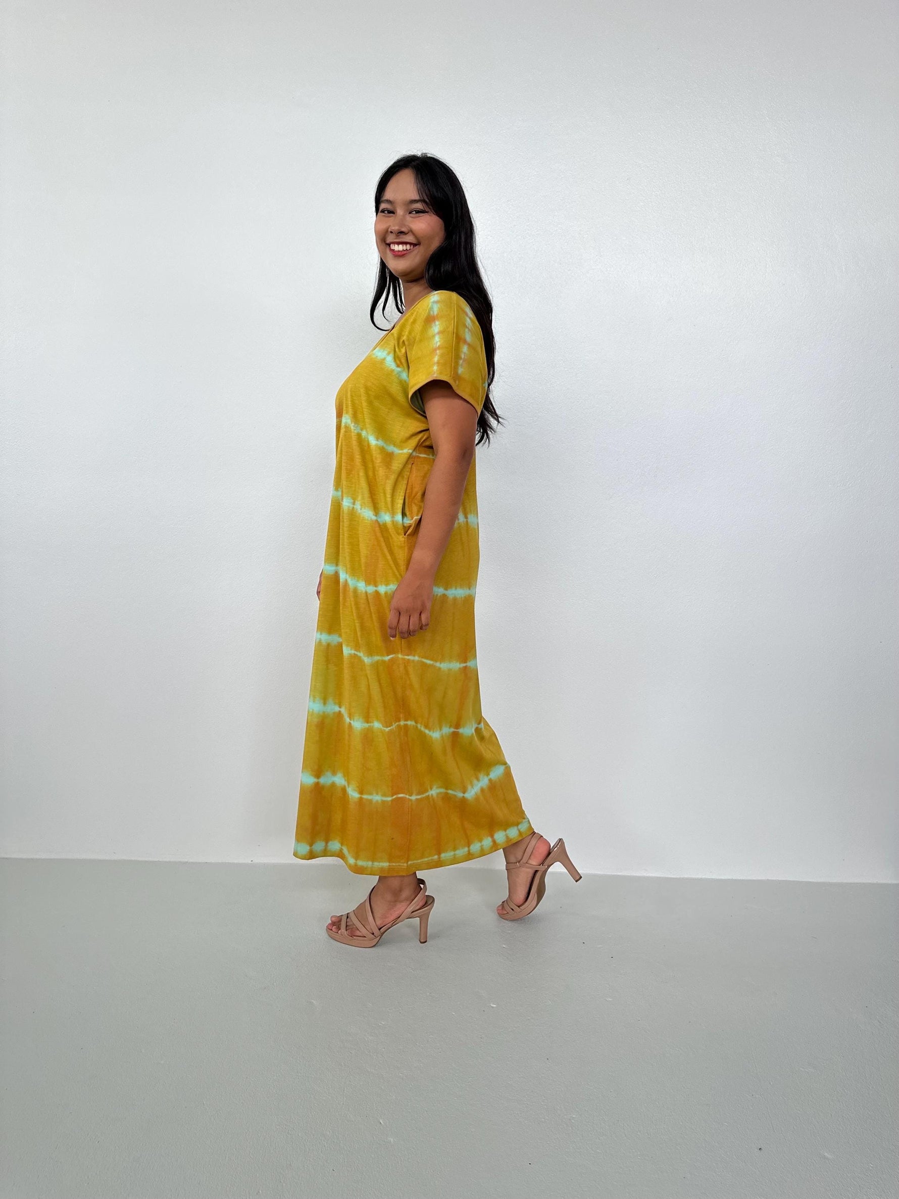 The Alisa Petite tie dye keeps the flow you love, minus excess fabric. Premium jersey cotton drapes cleanly; the tighter circumference ensures a balanced silhouette. In yellow tie dye, every piece is unique. The V neck frames the face while side ease lets you move freely from beach walks to dinner.