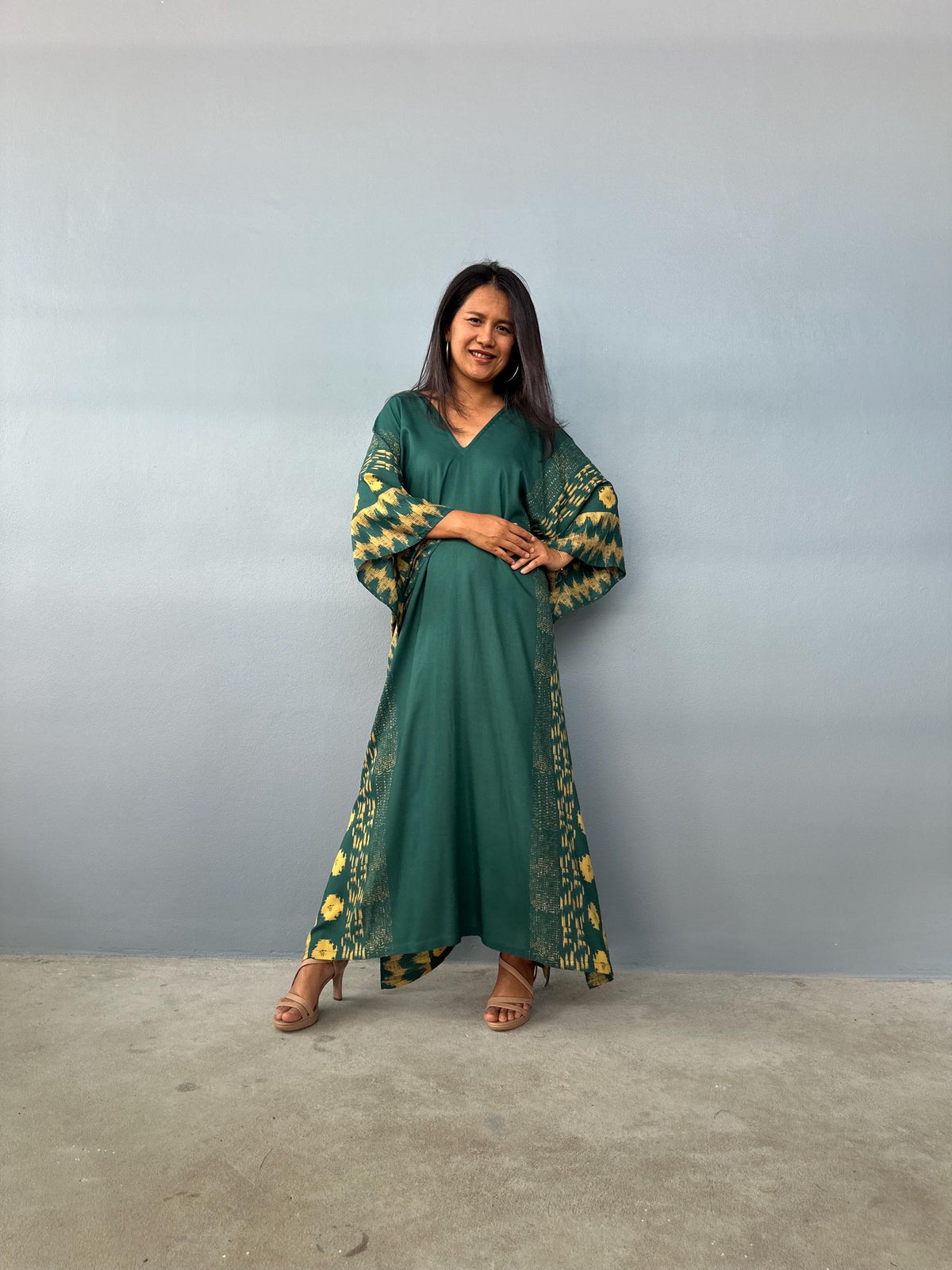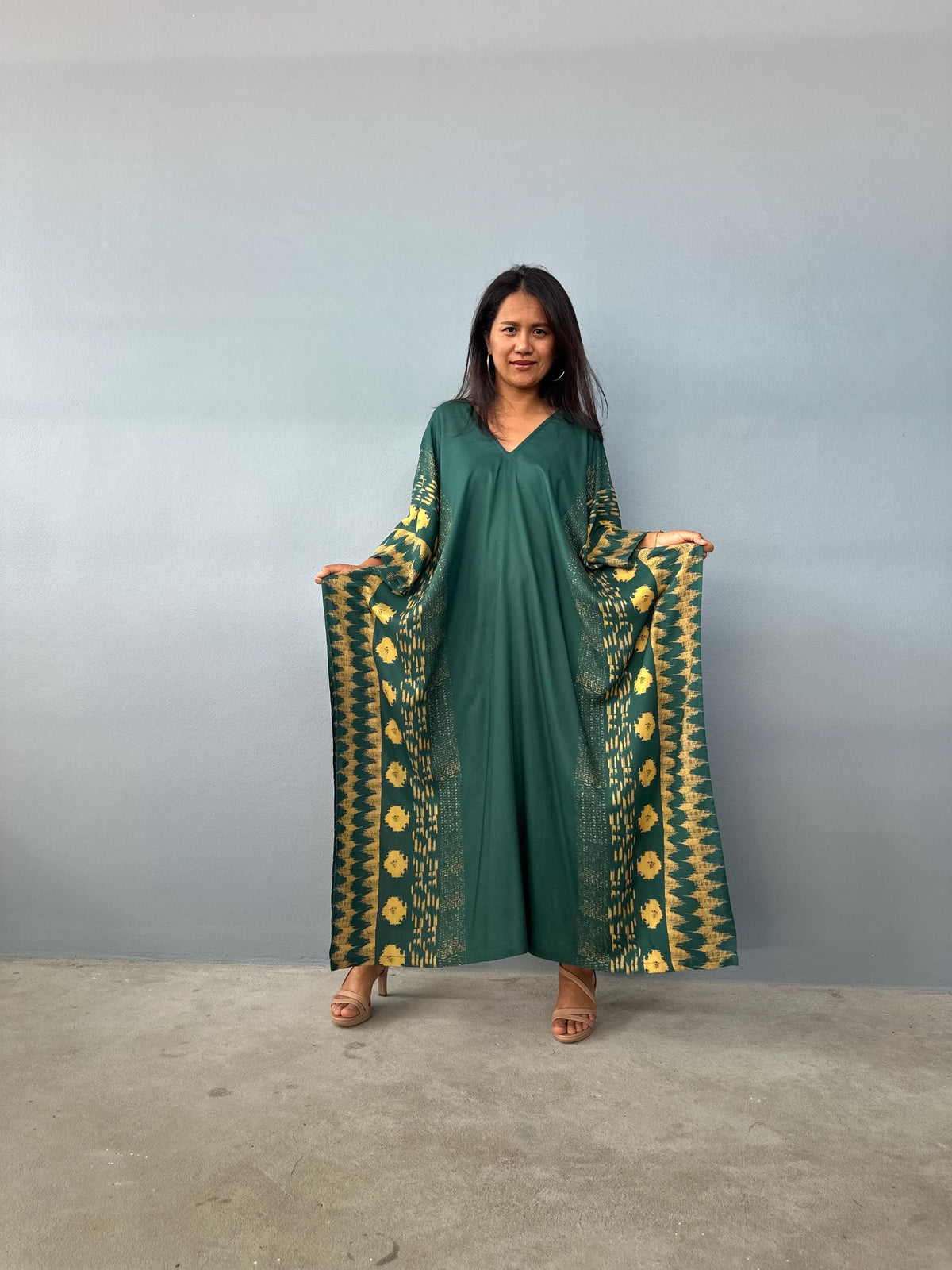 Unlike stiff, mass-made kaftans, Luna drapes naturally. Lightweight rayon voile in green moves with you, while the wrap-friendly silhouette offers comfortable coverage and side slits to elongate the leg. Each tessera print is created through precise discharge dyeing - printing that removes color for sharp, lasting detail. A polished layer that goes from travel to dinner without trying.